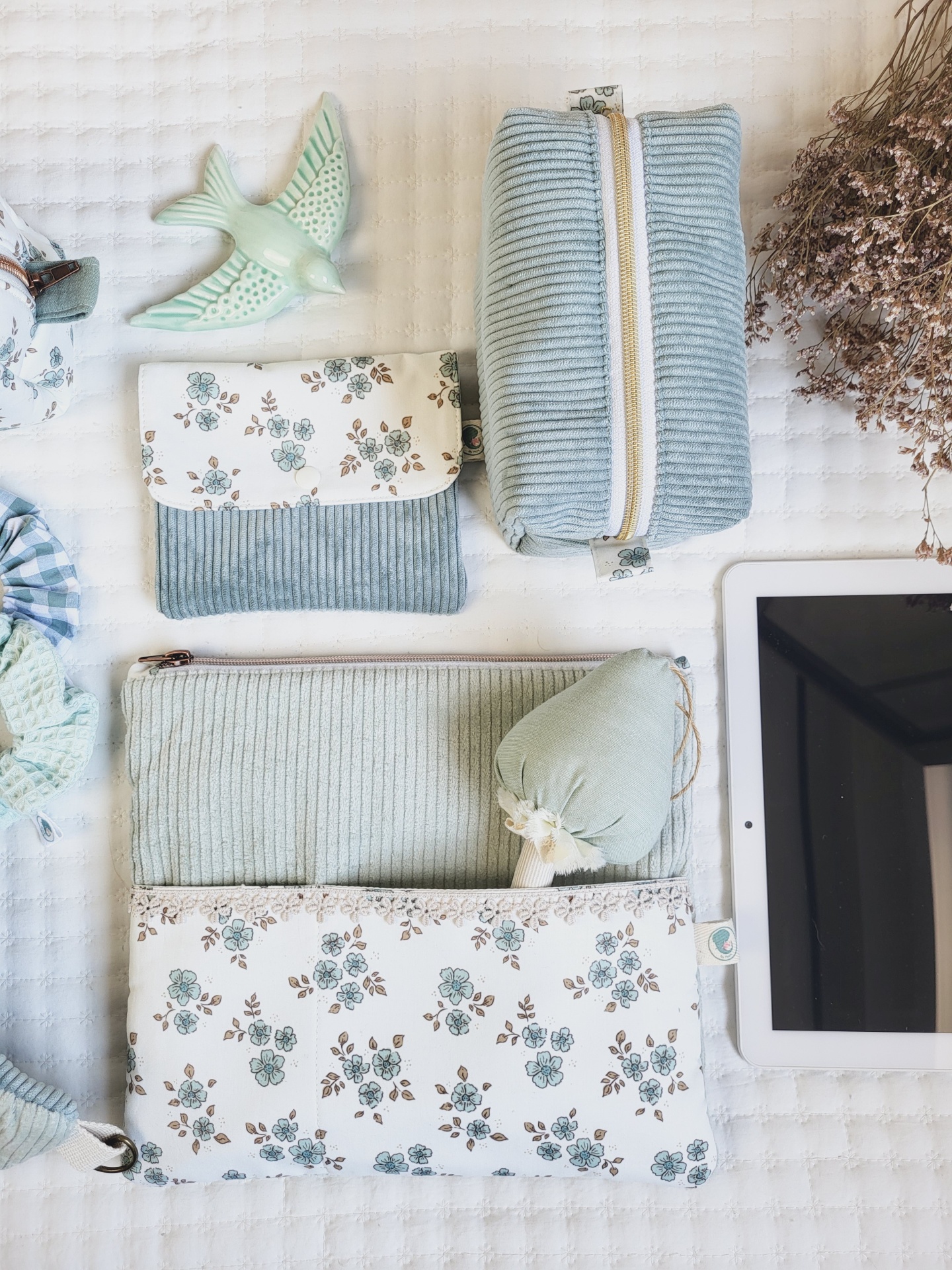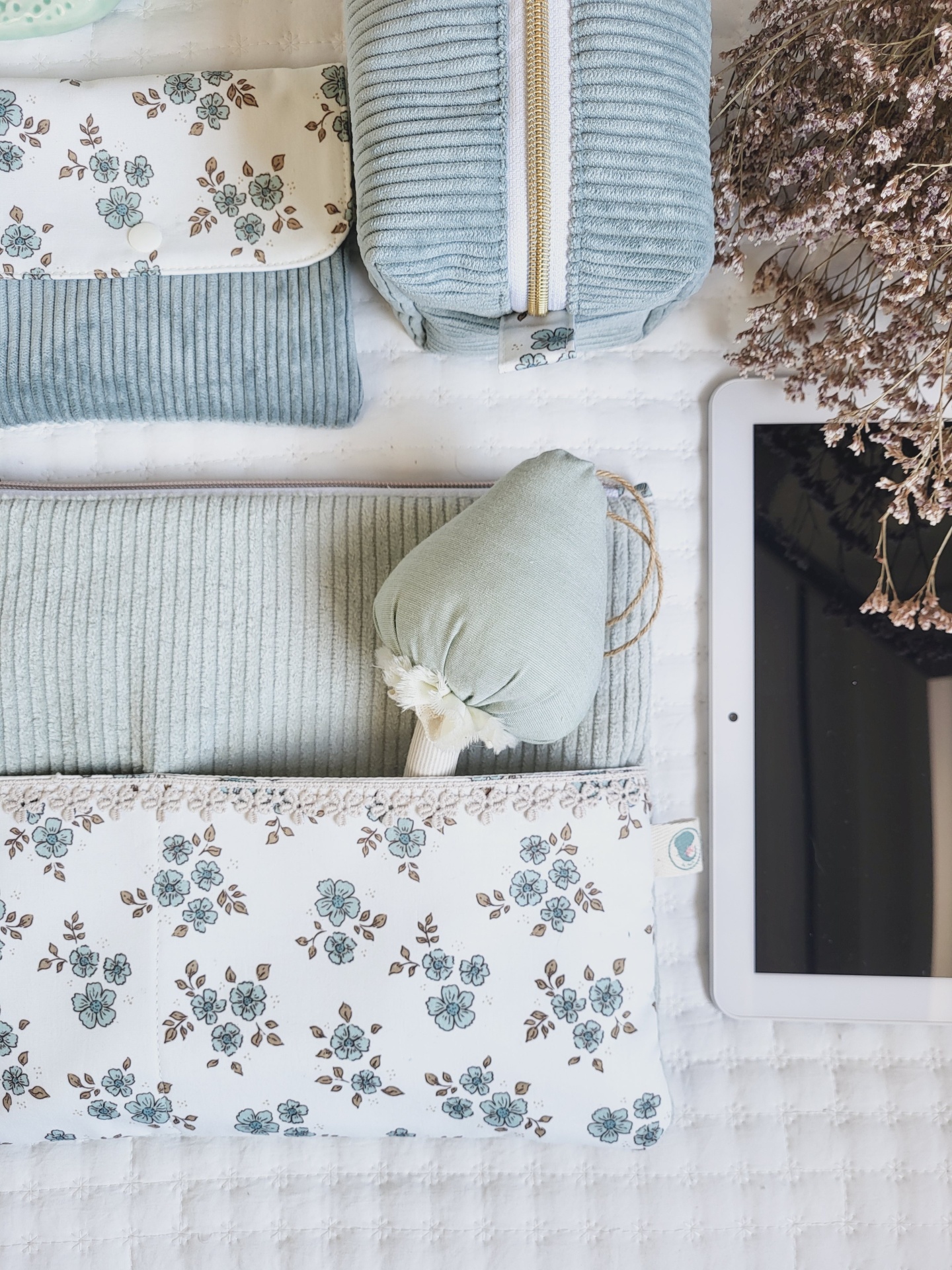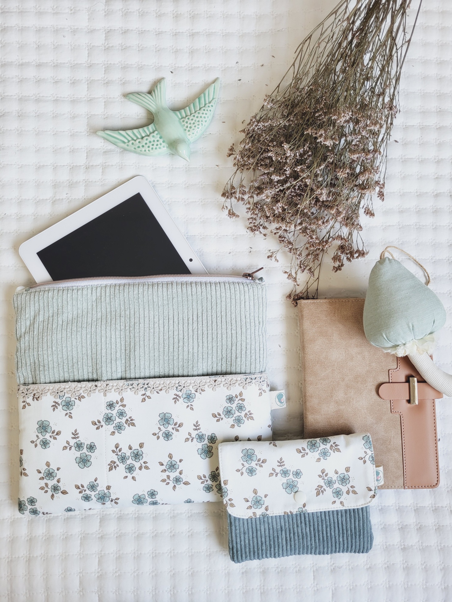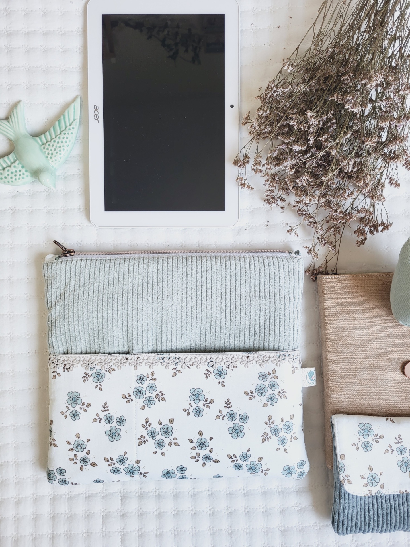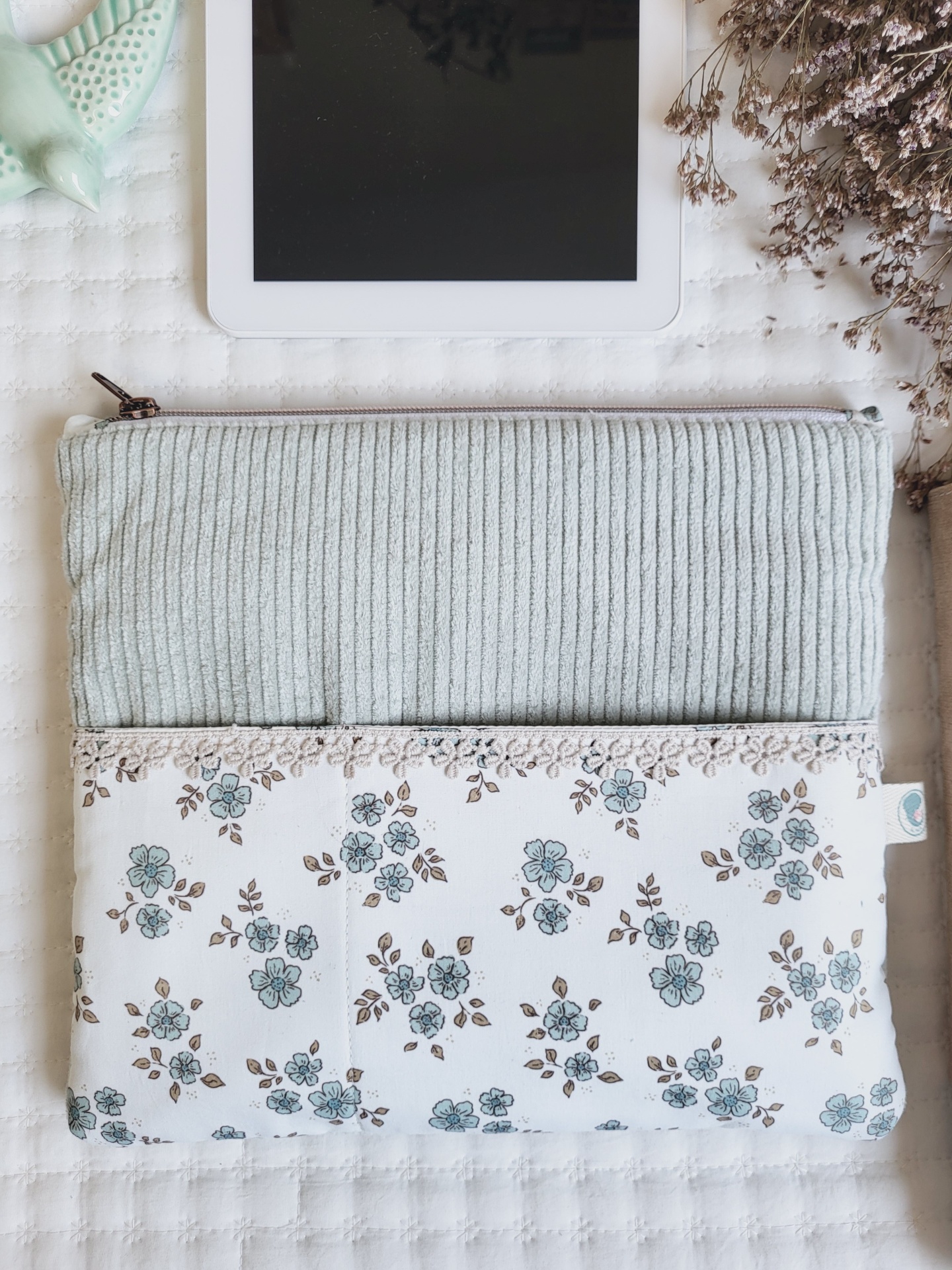 Bolsa para tablet/kobo bombazine verde água 39,00 € Desconto de %. Partilhar Comprar Contactar Bolsa em bombazine e tecido floral 100% algodão. Esta prática bolsa é ideal para guardar o tablet, agenda, livro ou kobo. Também tem um bolso exterior para telemóveis e canetas ou outros artigos mais pequenos. Com fecho zipper altamente resistente. Medidas: 29x26cm. Lavagem: idealmente à mão. Também pode ser à maquina a temperatura não superior a 40graus. Programa de roupa delicado. Não passar a ferro.