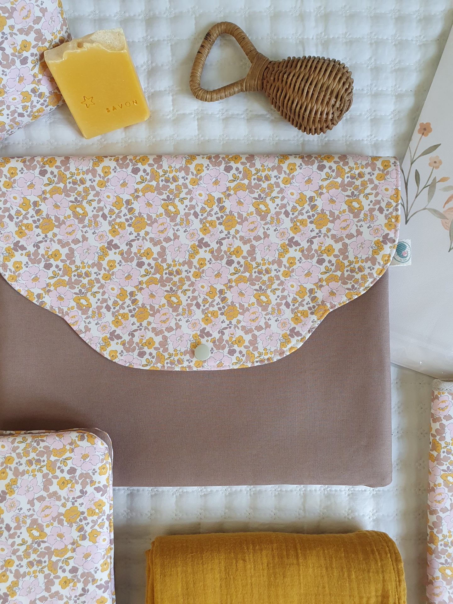 Bolsa roupa floral mostarda 16,00 € Desconto de %. Partilhar O produto encontra-se sem stock. Bolsa tipo envelope, que fecha com mola de pressão, para as mudas de roupa do seu bebé. Pode levar para a maternidade e, mais tarde, para as saídas em passeio ou para a creche. Tecidos 100% algodão. Medidas: 30x26cm
