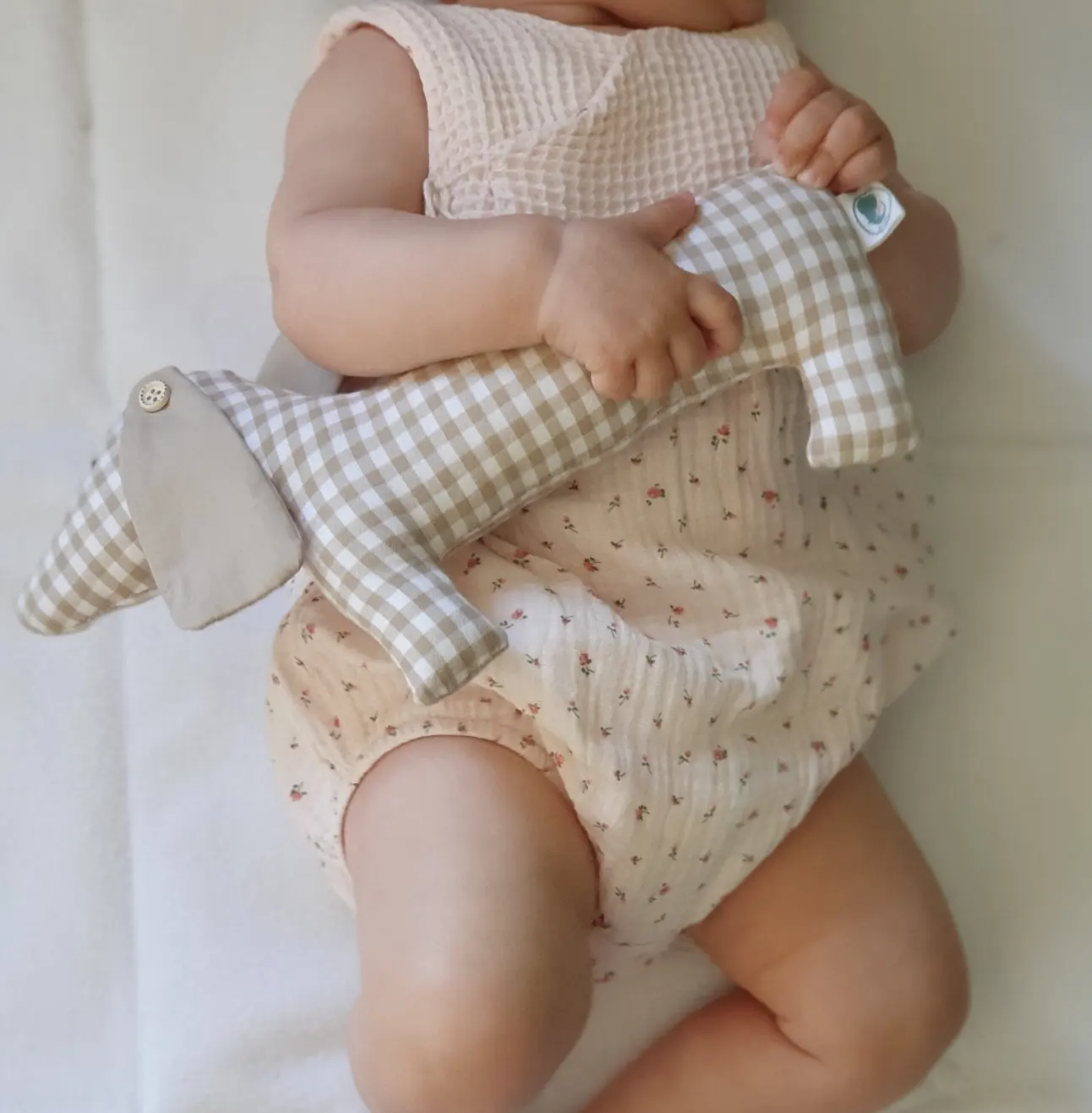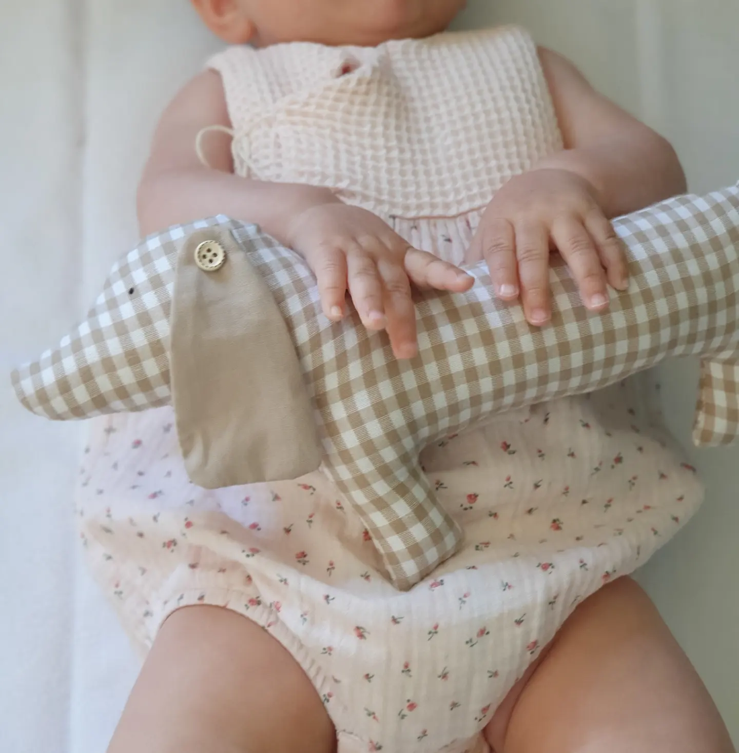 • Bebé com body floral e babete creme segurando almofada em forma de cão xadrez cinzento