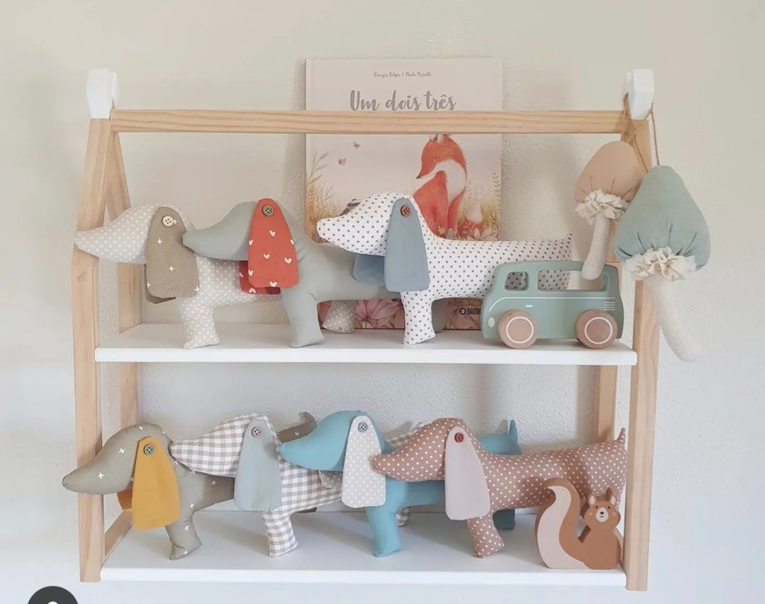 • Estante com brinquedos de pelúcia coloridos e quadro de parede