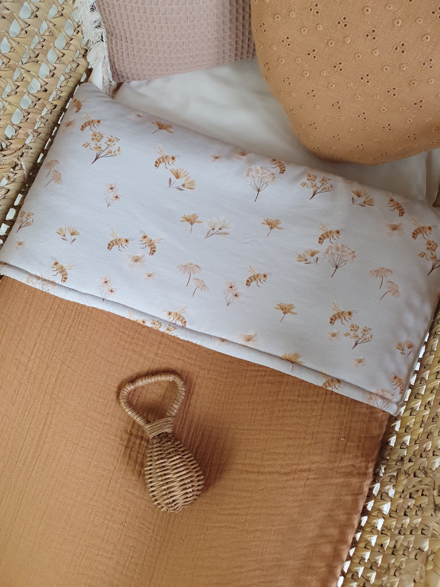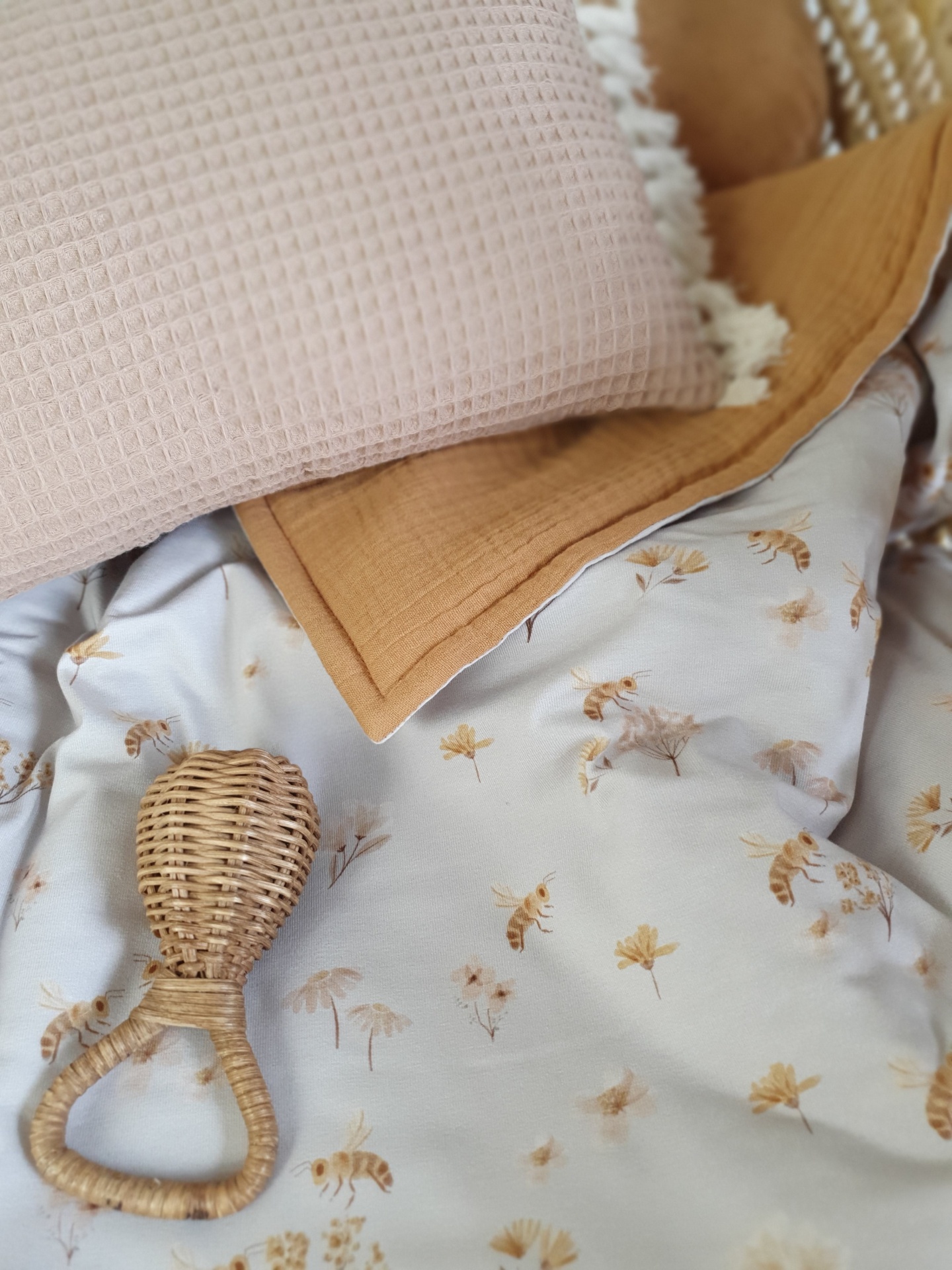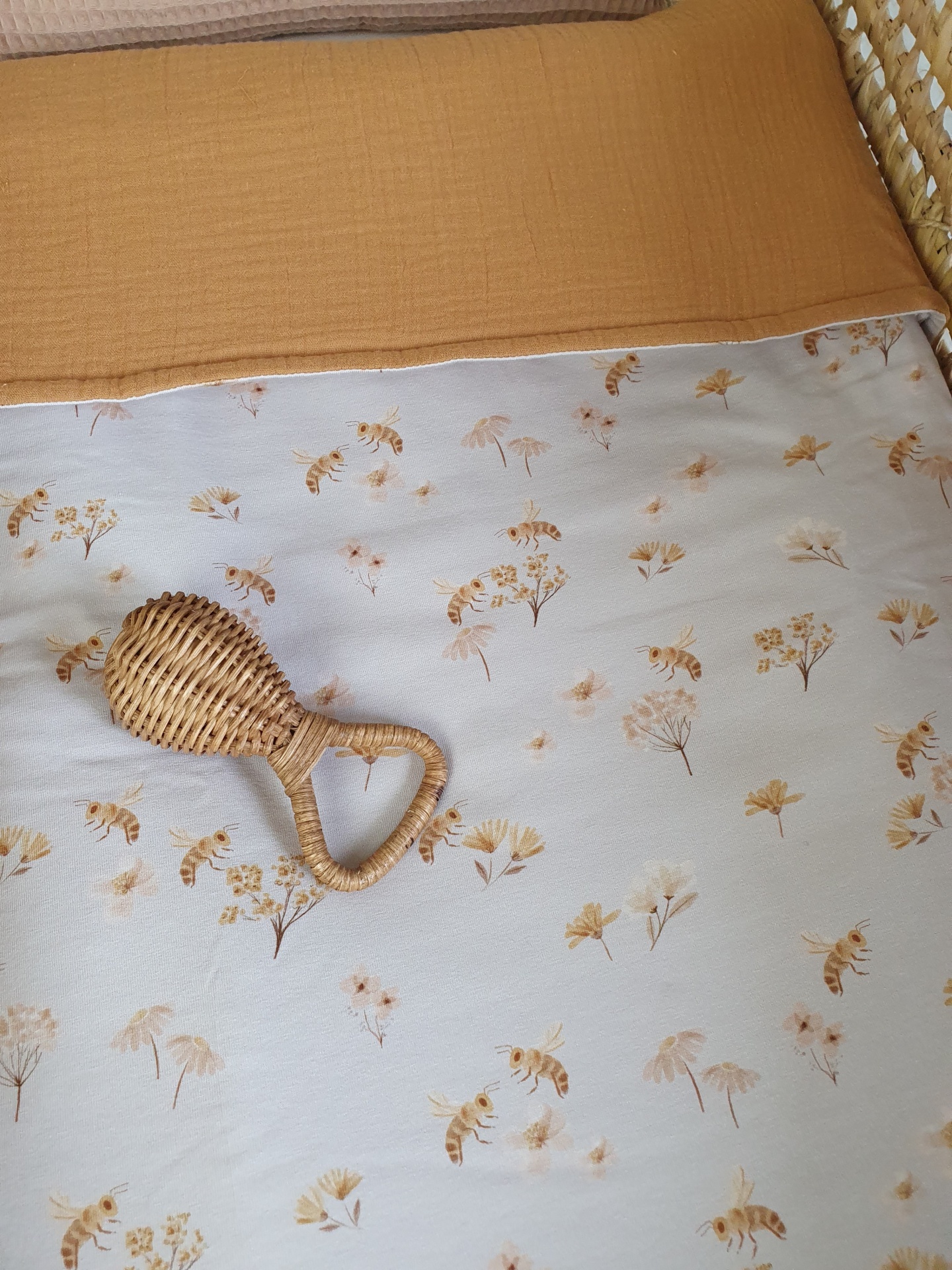 Colcha abelhas 42,00 € Desconto de %. Partilhar O produto encontra-se sem stock. Colcha feita com malha jersey e musselina 100% algodão, muita macias e delicadas para o seu bebé dormir quentinho e aconchegado. Ideal para mini berços, alcofas, carrinho/ovinho, ninhos, next to me. Medidas: 70x100cm Conselhos de lavagem: lavar à maquina ou à mão numa temperatura não superior a 40 graus. Programa de roupa delicada.
