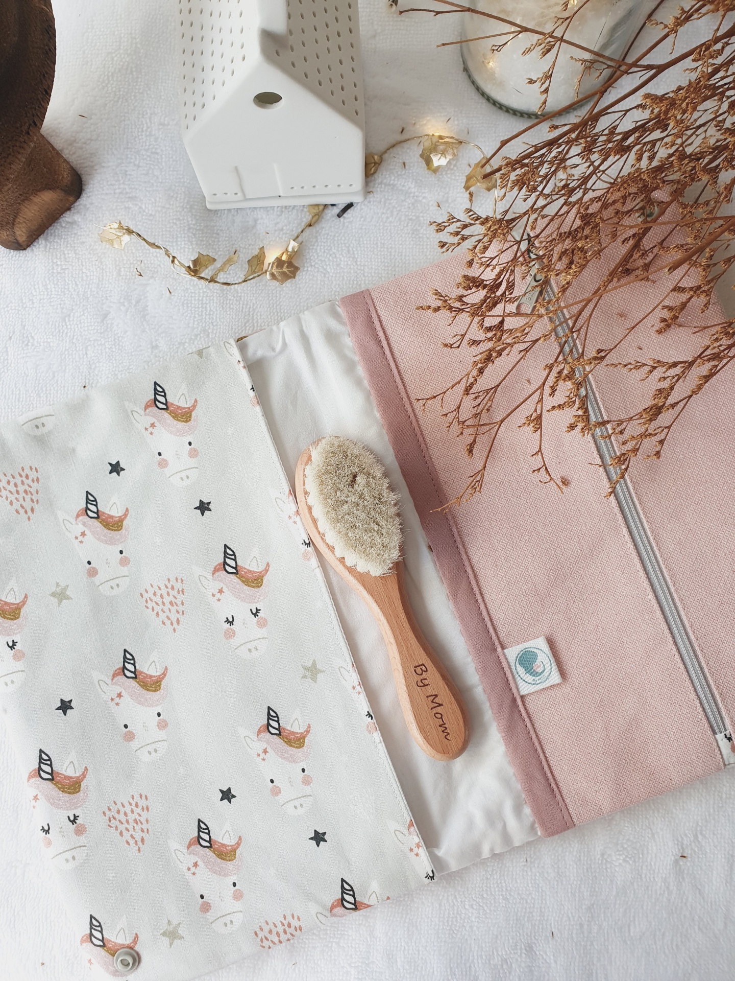 • Porta-escova rosa aberto com escova de cerdas naturais e pano com padrão de unicórnios