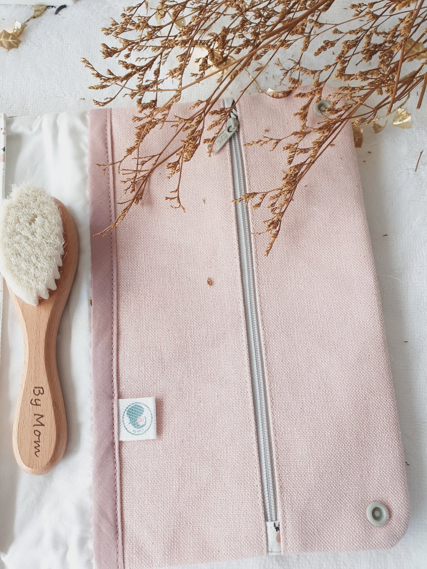 • Bolsa rosa de tecido com fecho de correr e escova de madeira