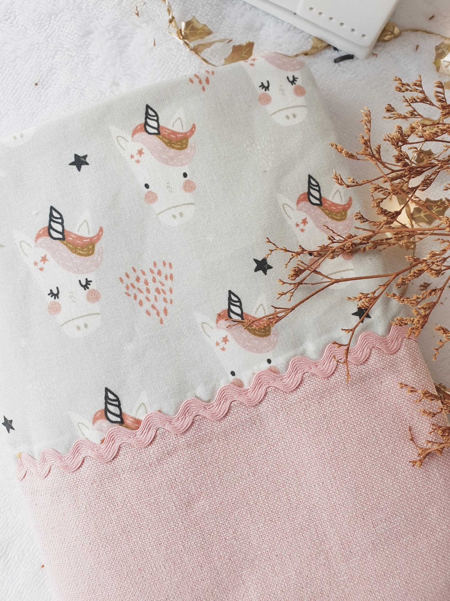 • Pano de tecido com estampa de unicórnios e tecido rosa com borda ondulada