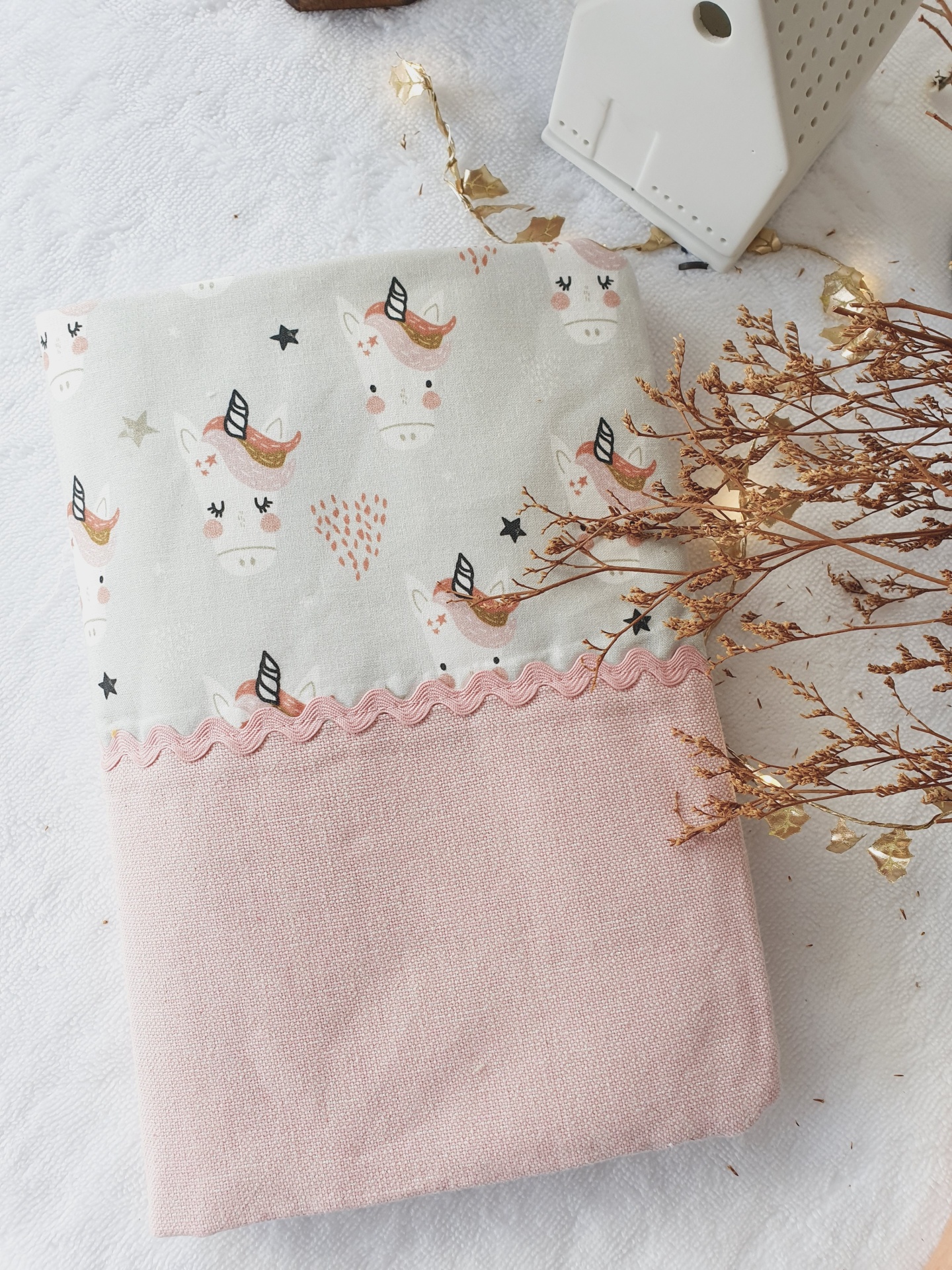 • Toalha com padrão de unicórnios e tecido rosa com fita ondulada
