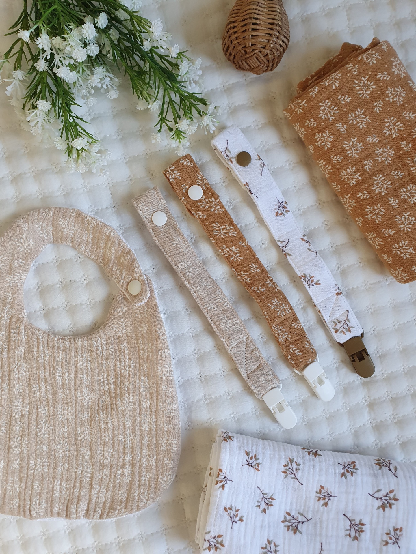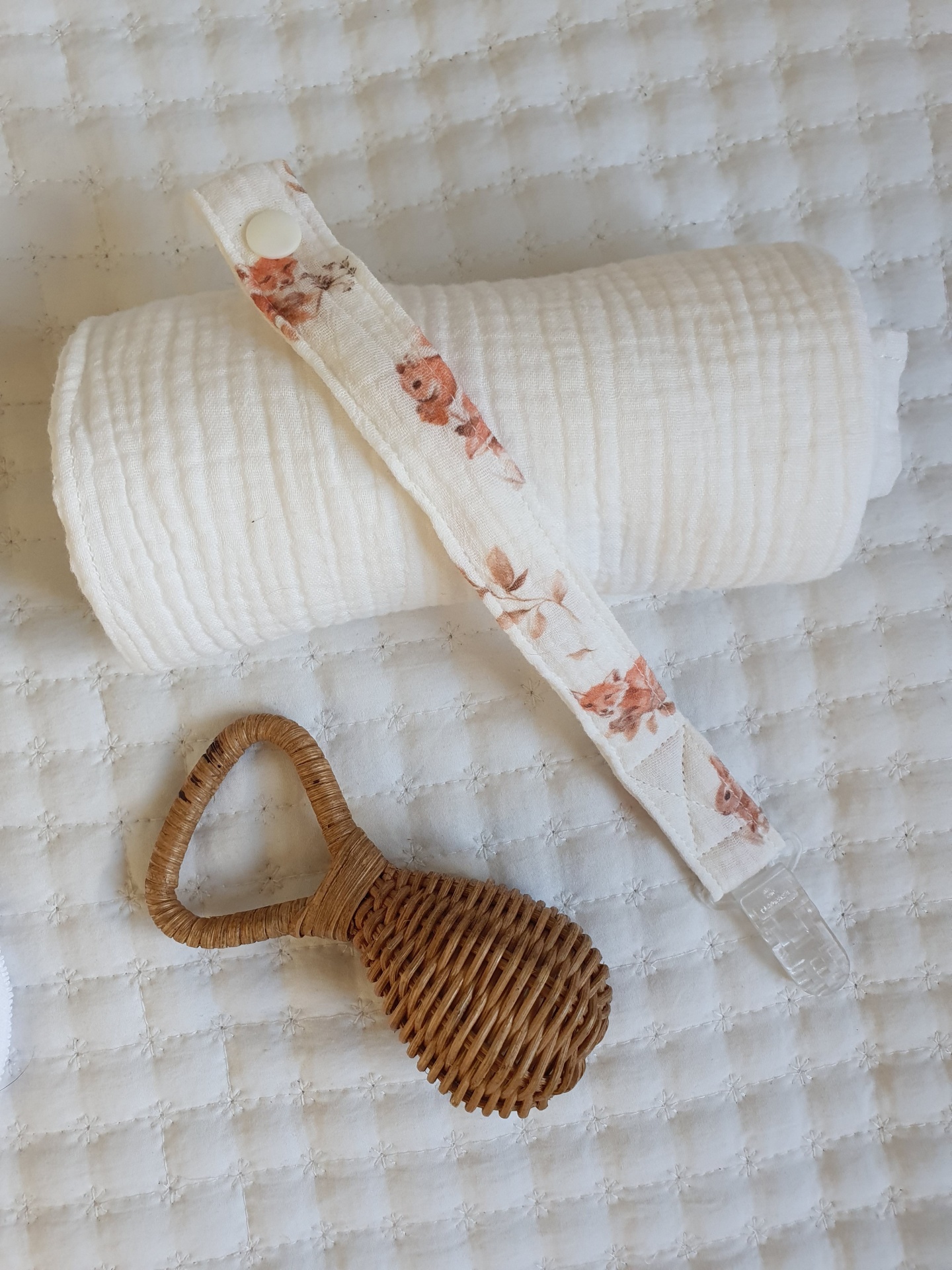 Fitas chupeta musselina 7,00 € Desconto de %. Partilhar Padrão caramelo com folhas branco com folhas animais do bosque bege com folhas Comprar Contactar Fita de chupeta ou para mordedor com mola de plástico! Muito úteis para evitar que a chupeta do seu bebé esteja sempre a cair no chão. Tecidos musselina 100% algodão.