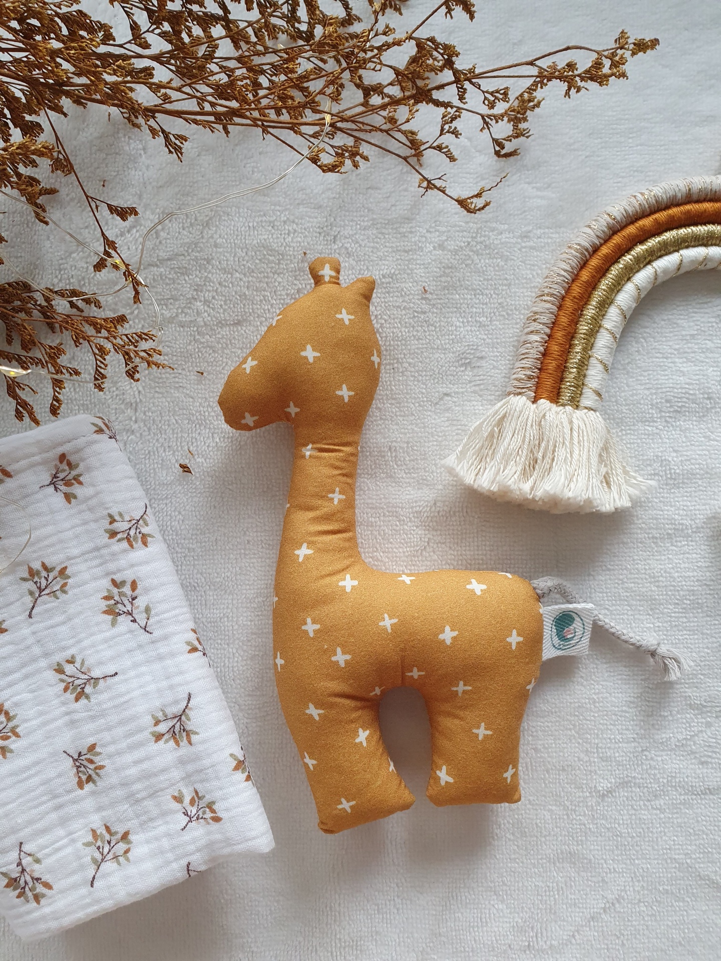 • Brinquedo de peluche girafa amarelo com cru branco e arco-íris artesanal em tons naturais