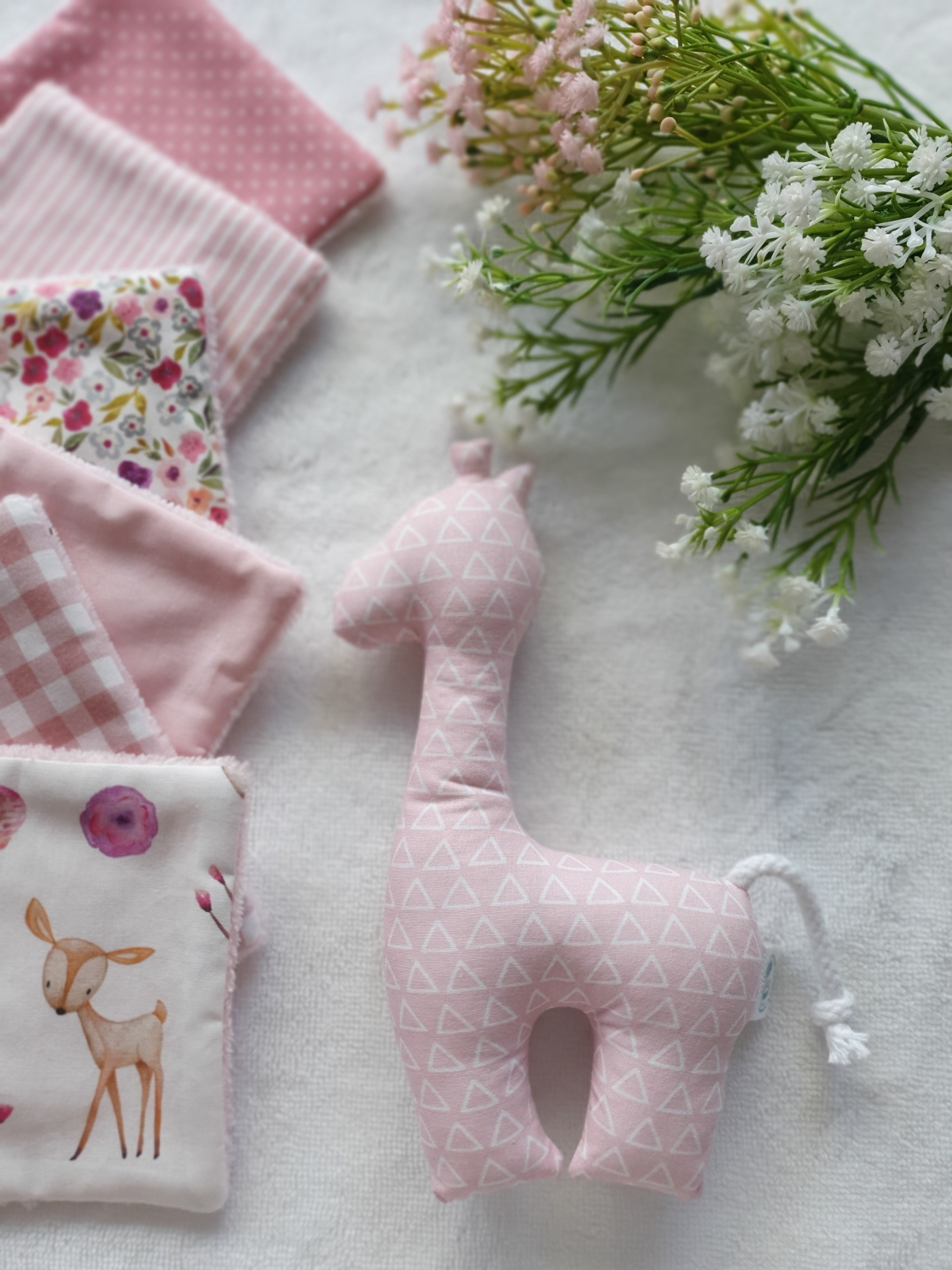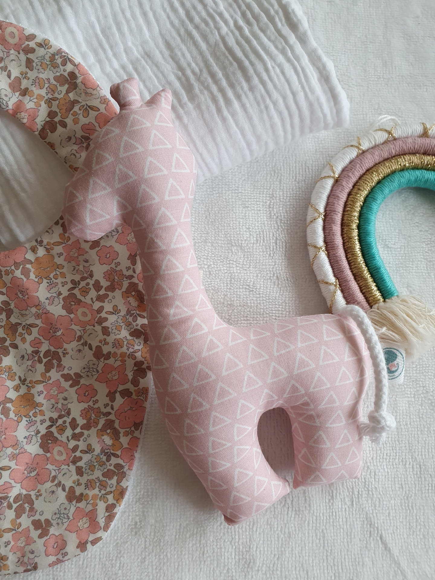 • Brinquedo girafa cor-de-rosa, babete floral e arco-íris tecido colorido