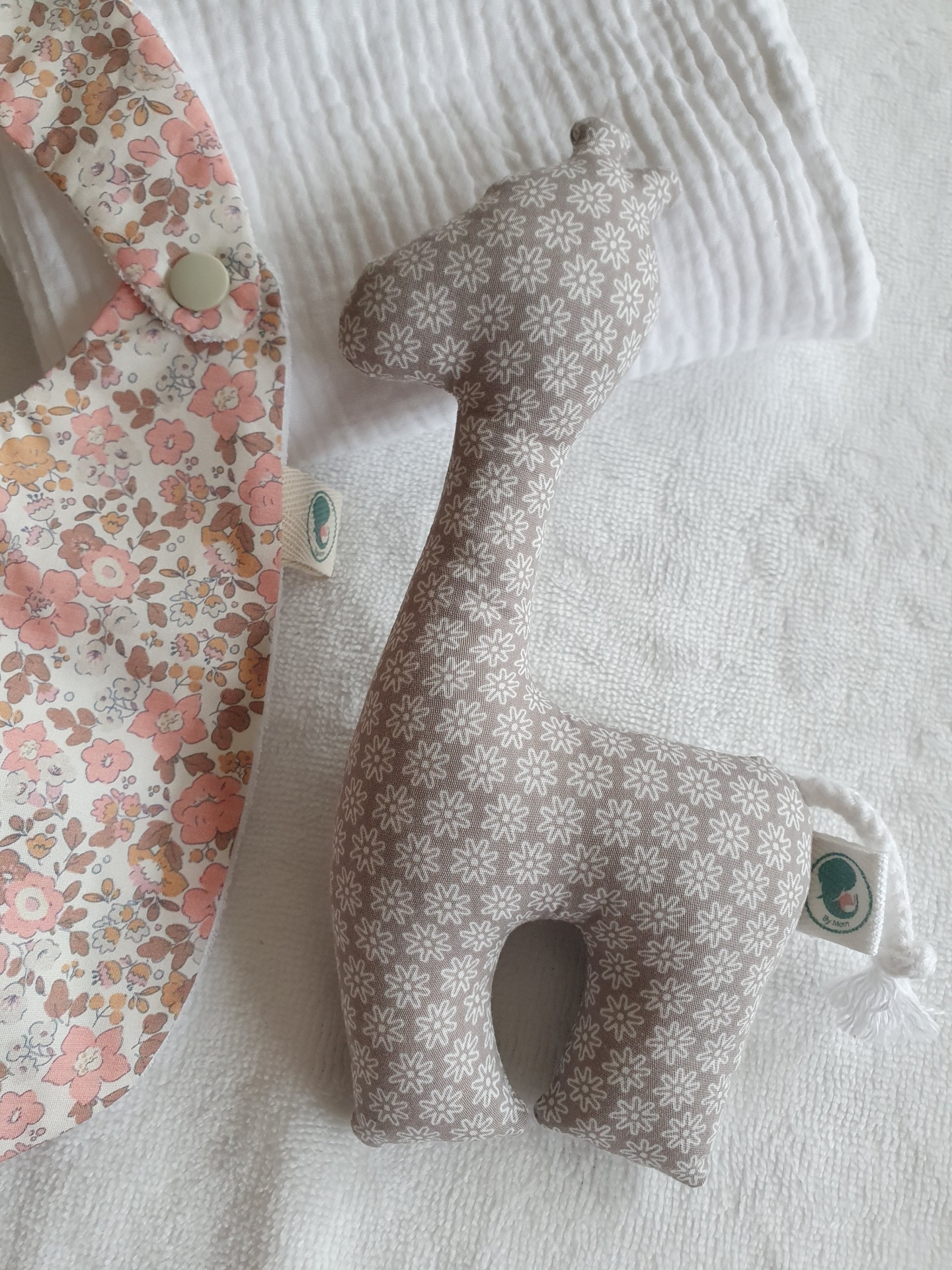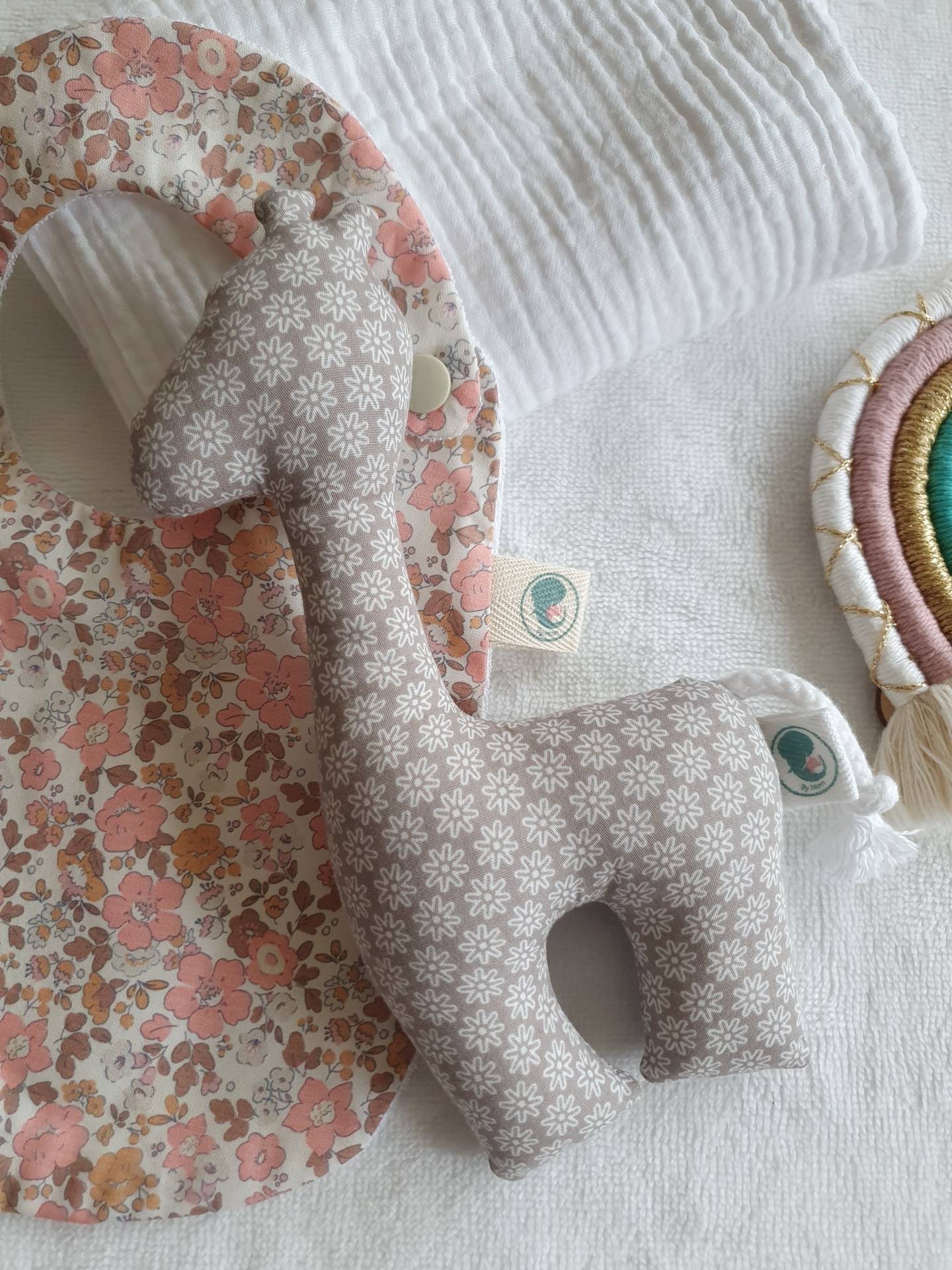• Brinquedo de peluche girafa floral com babete e decoração em tecido branco