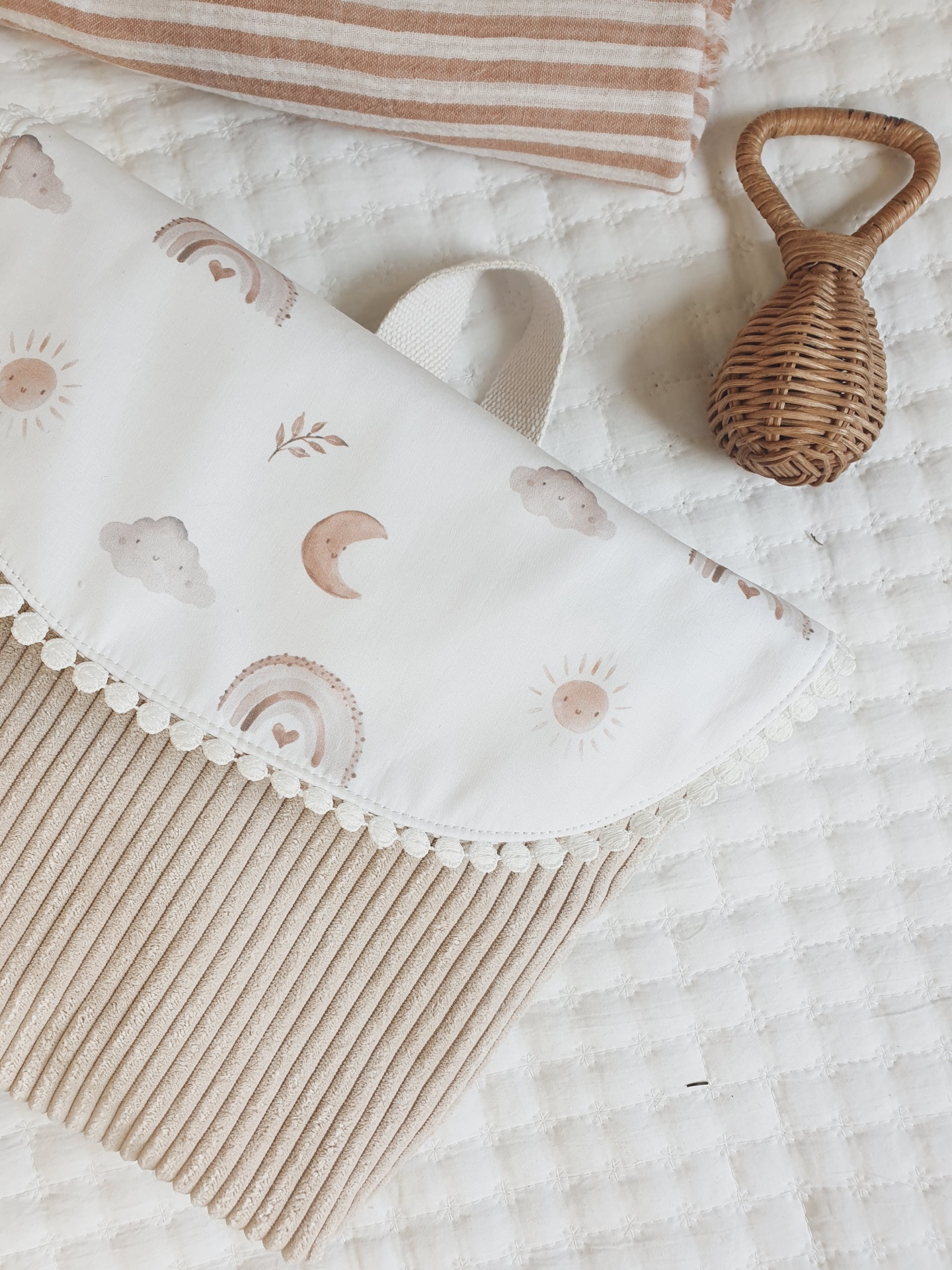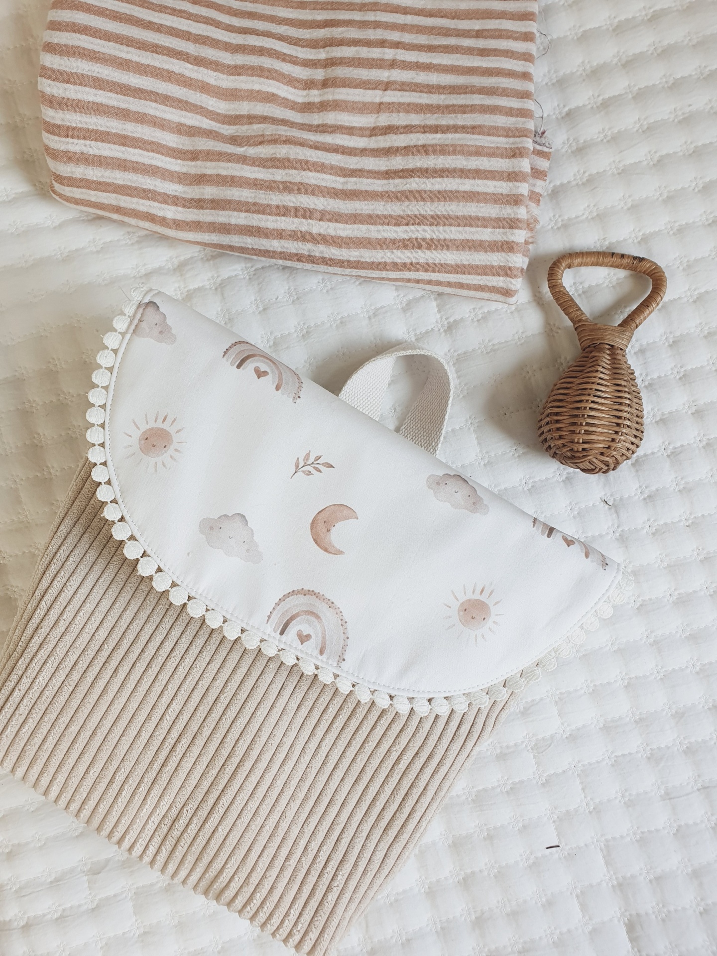 • Bolsa infantil bege com padrão de arco-íris e nuvens sobre manta branca acolchoada e chocalho de vime