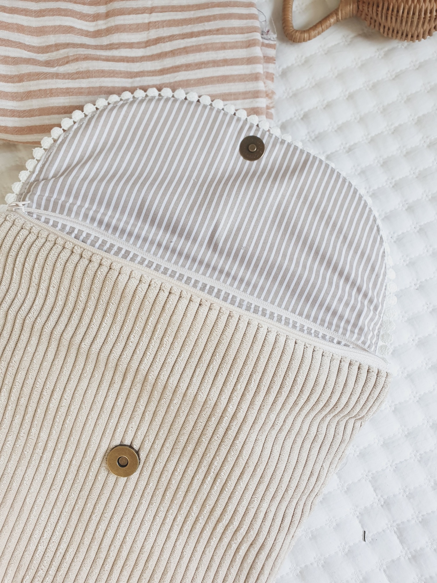 • Saco de bebé canelado bege com interior riscado e fecho metálico
