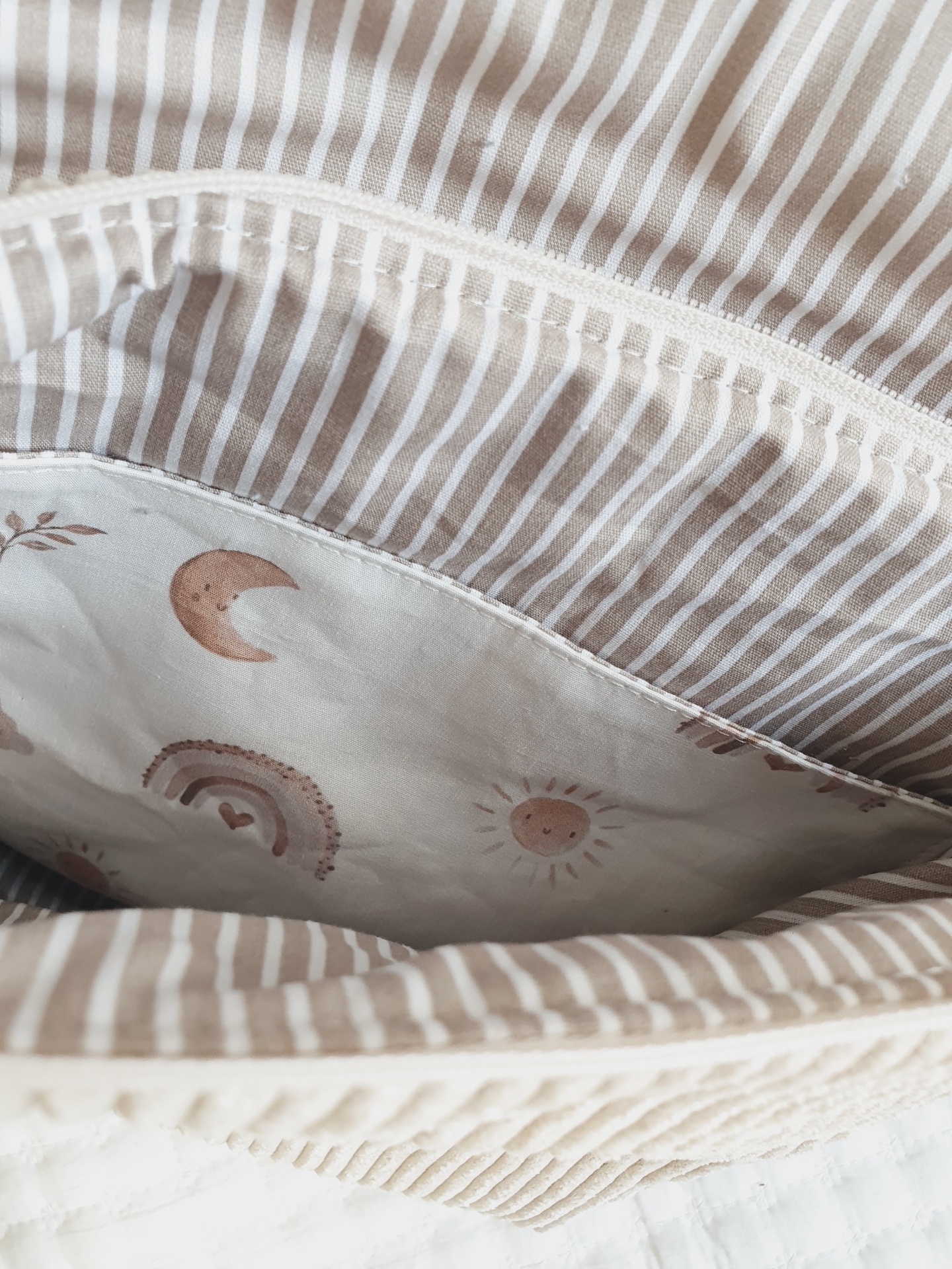 • Mochila de bebé bege e branca com padrão delicado, pano de riscas e chocalho de vime