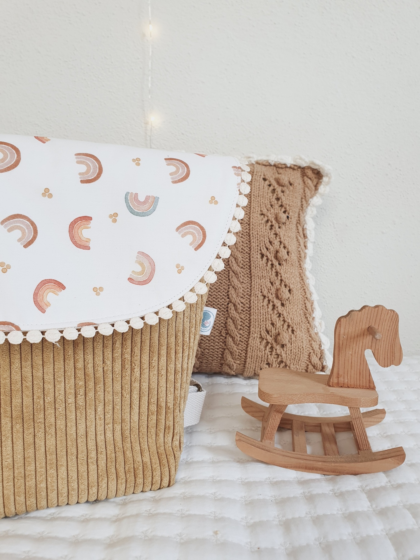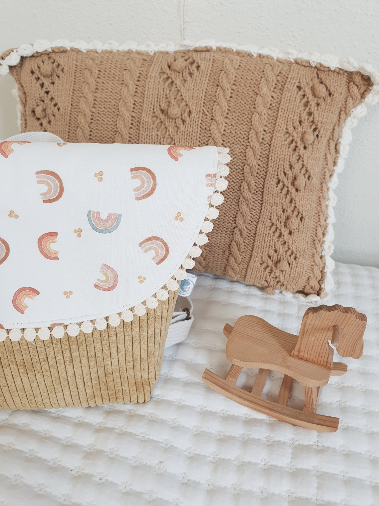• Almofada castanho claro tricotada com borda branca, mochila camel com padrão de arco-íris e cavalo de baloiço em madeira sobre colchão branco.