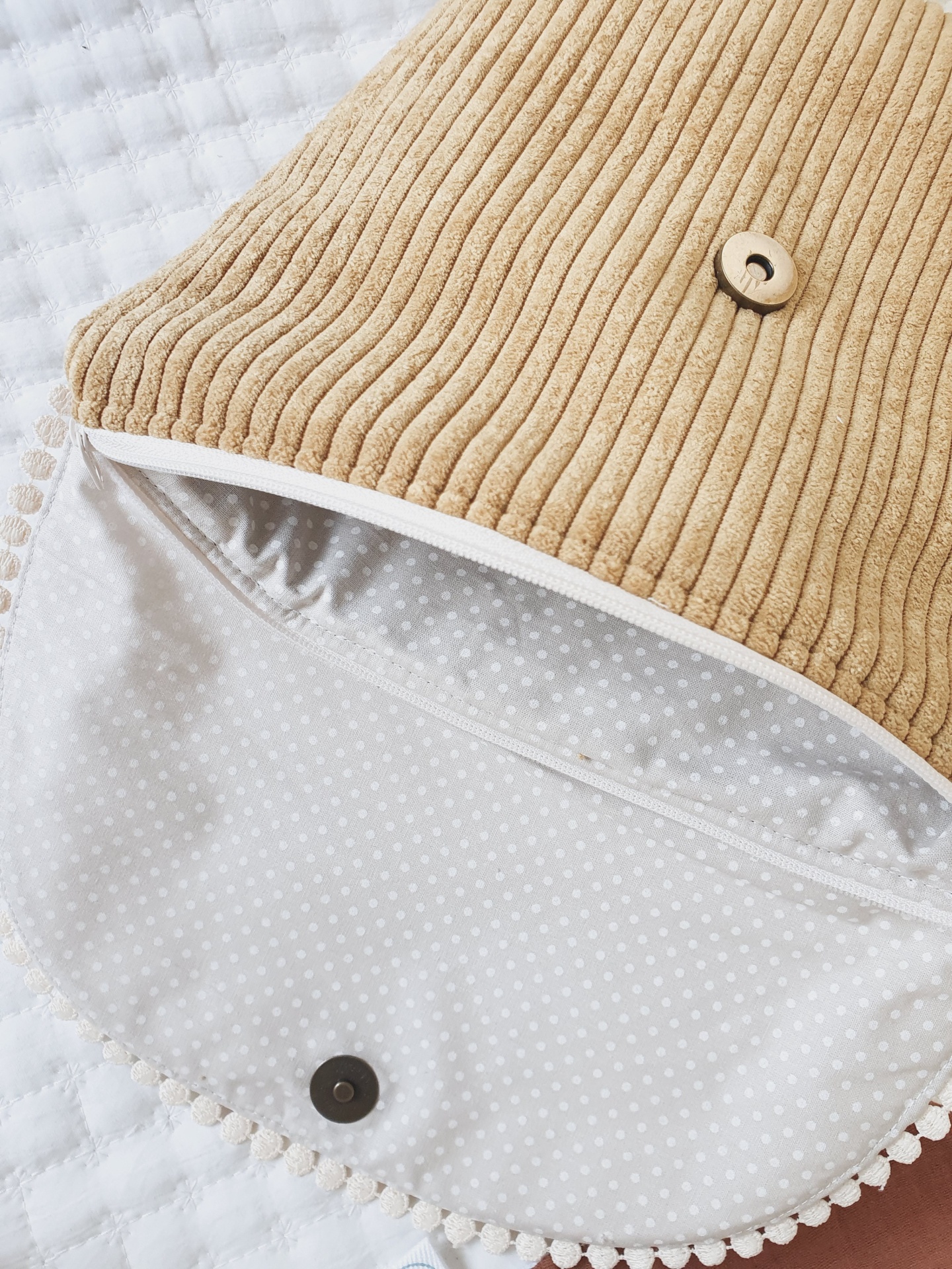 • Bolsa de veludo cotelê castanho claro com interior de tecido branco de pontos cinza e fecho de íman