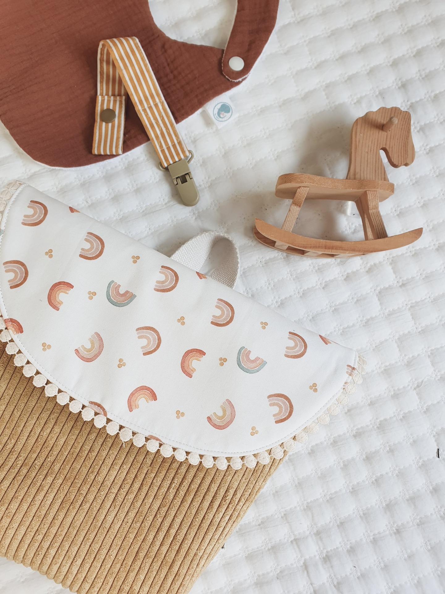 • Cesta em tecido canelado castanho, capa branca com arcos-íris, almofada de tricô castanha e cavalo de madeira sobre manta branca acolchoada