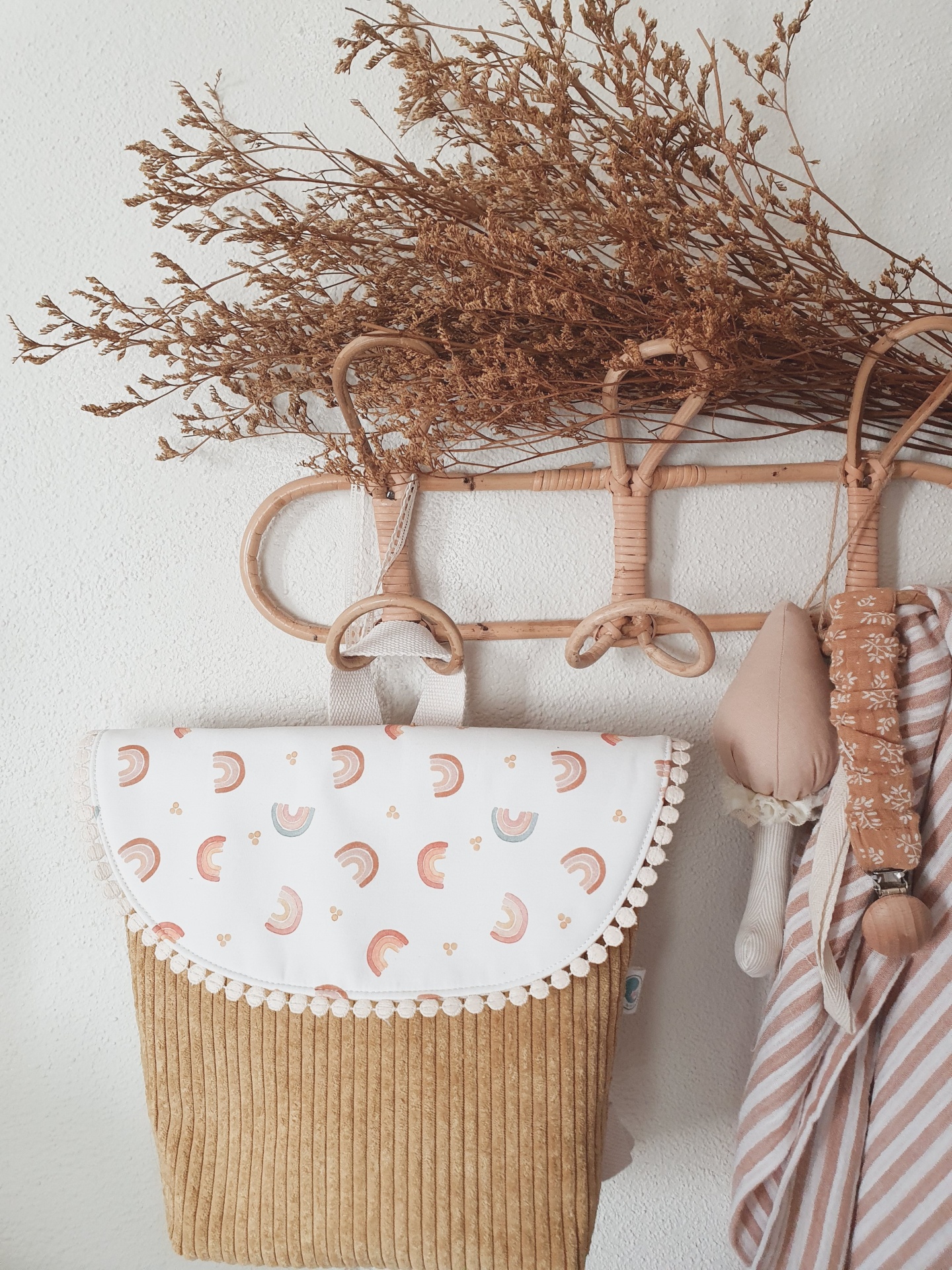 • Bolsa em tecido de veludo cotelê bege com tampa branca estampada a arcos-íris, pendurada em cabideiro de madeira rústico com ramo seco e roupa ao lado.