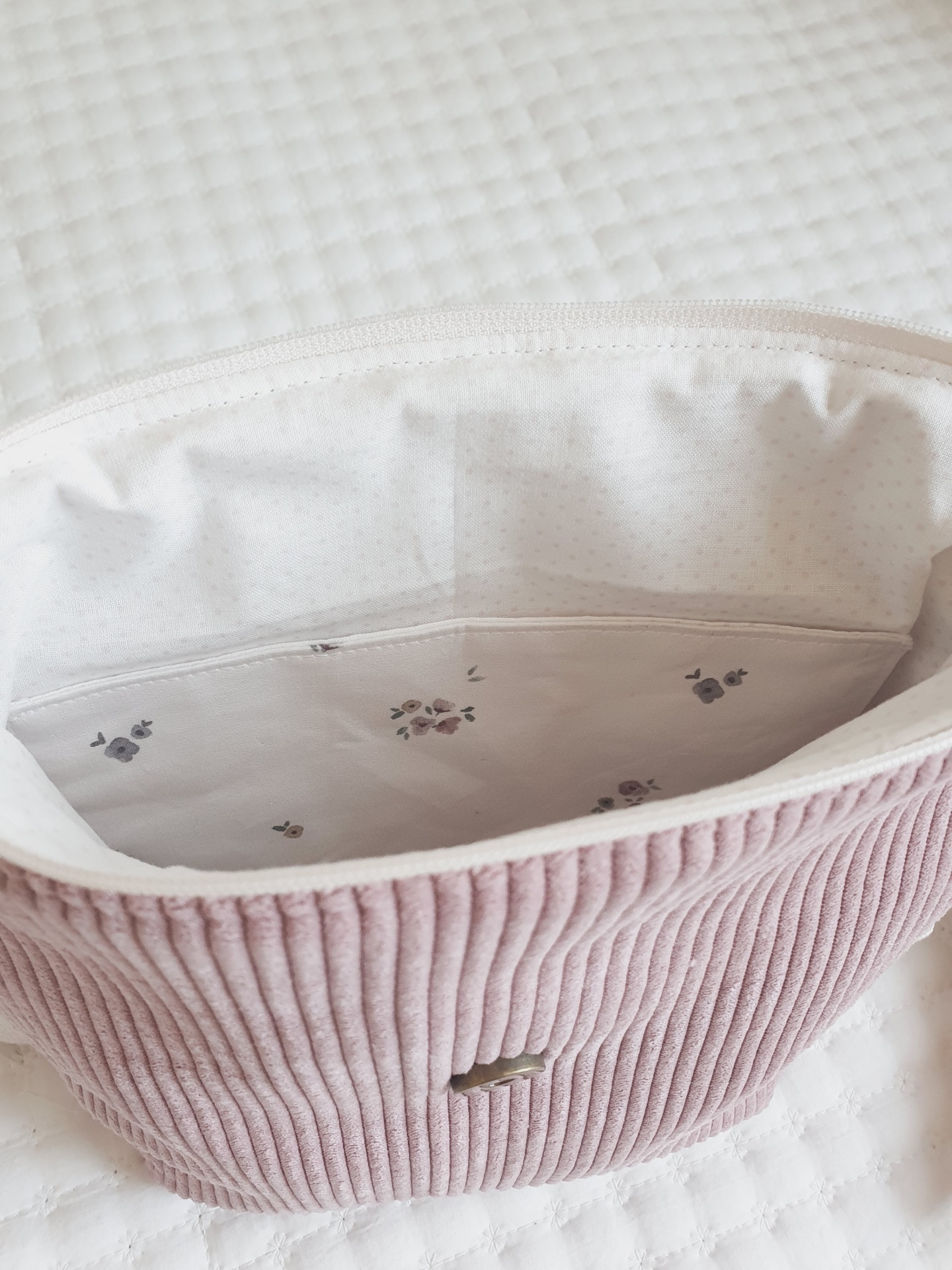 • Necessaire rosa em veludo cotelê com fecho branco e botão circular
