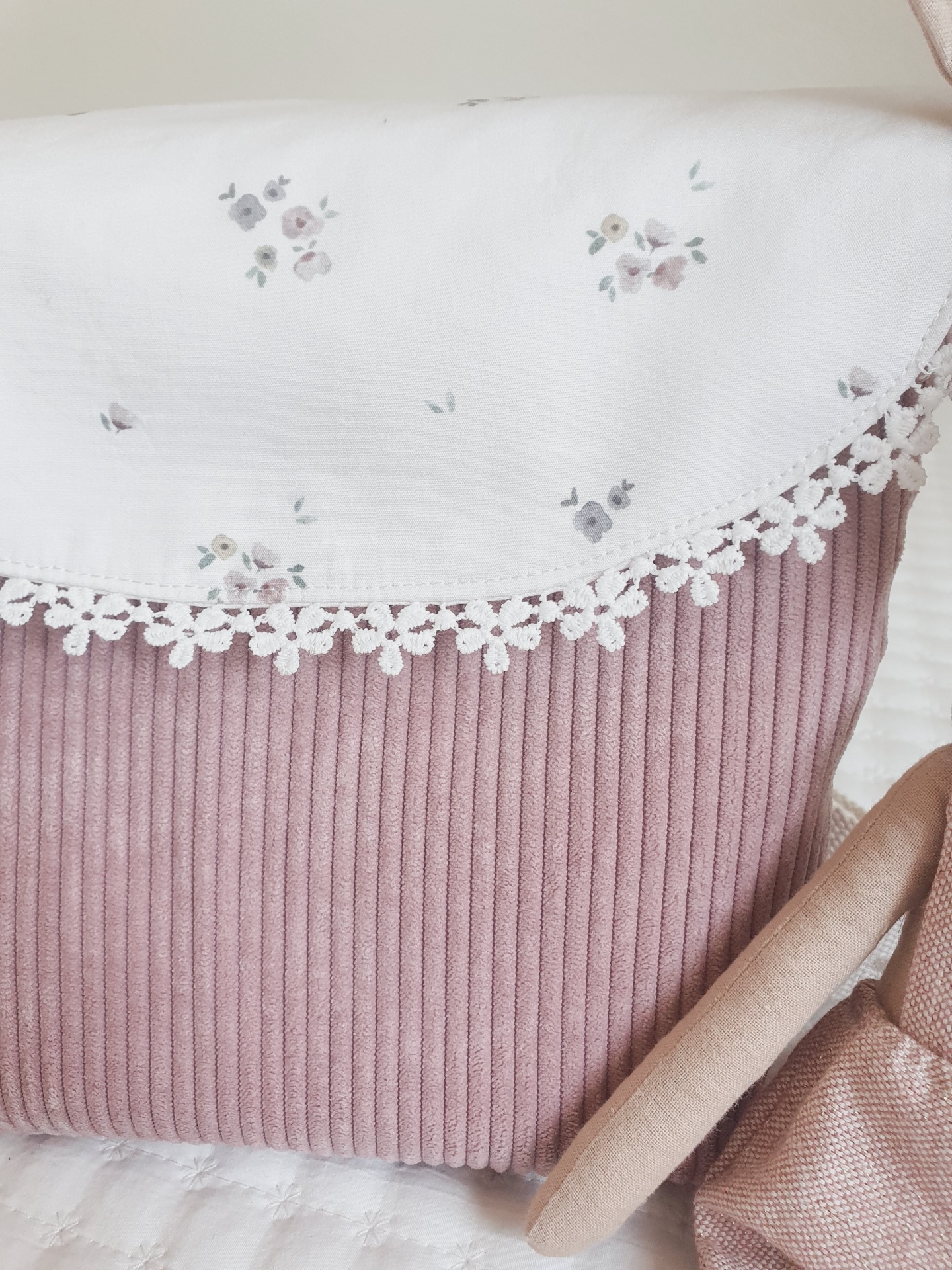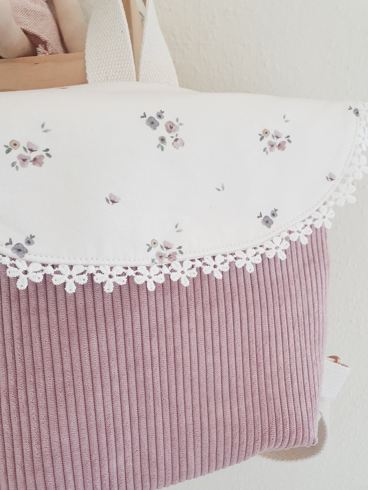 • mochila rosa claro e branca com flores e renda