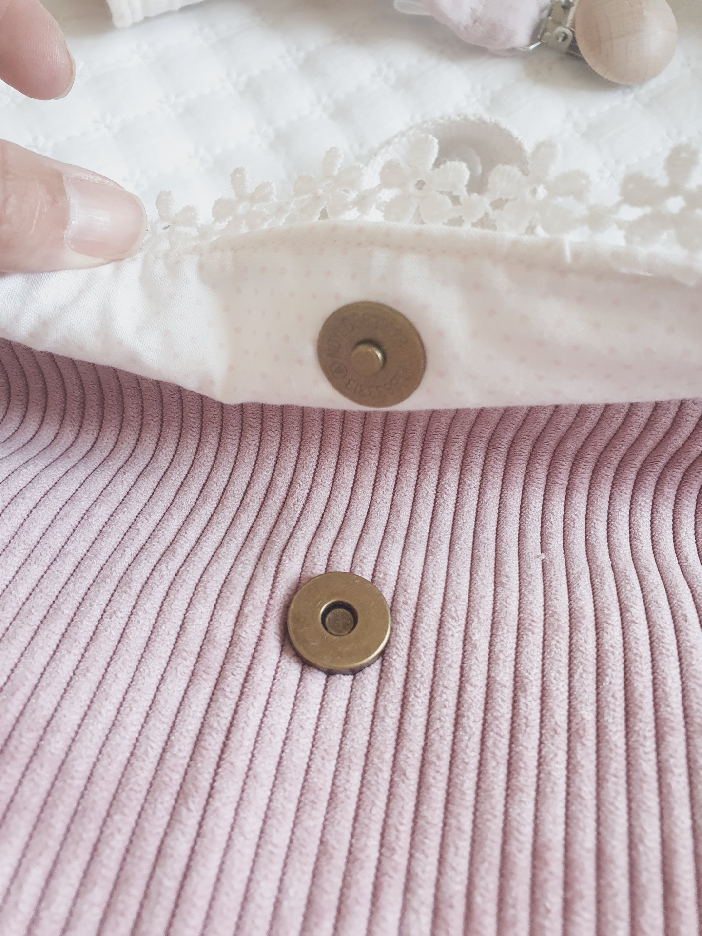 • Botões magnéticos bronze em tecido rosa e branco com flores bordadas