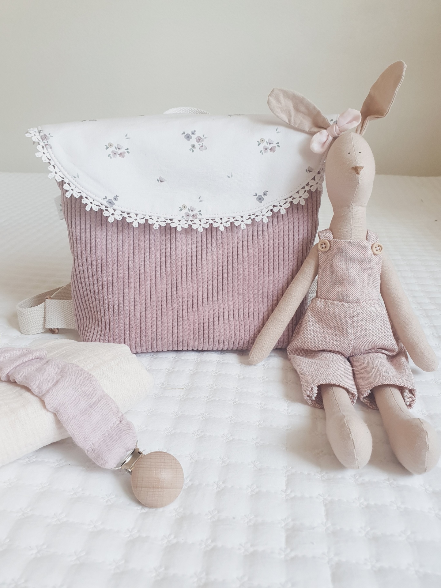 • Mochila rosa infantil com aba branca bordada e boneco de pano coelho rosa