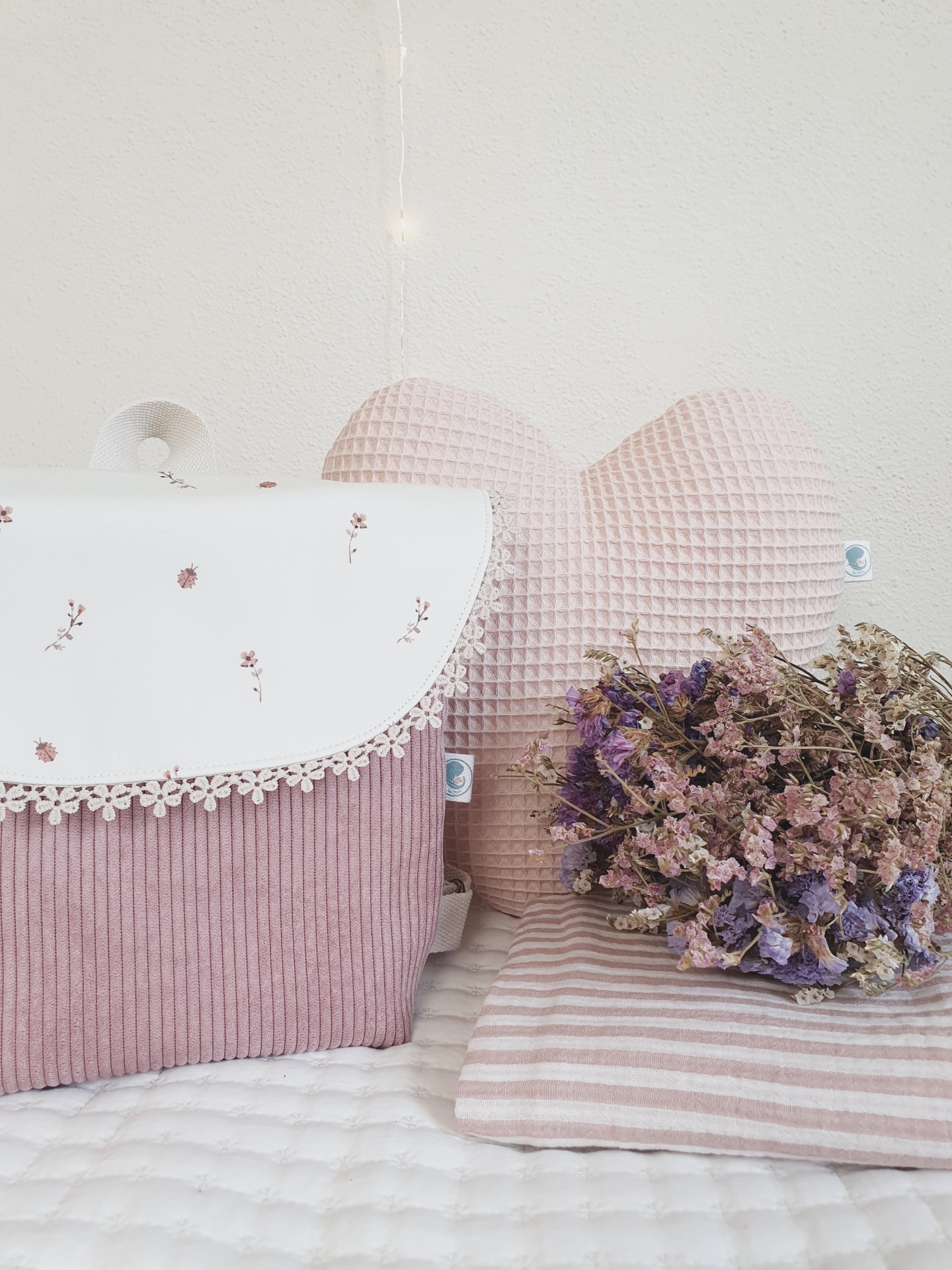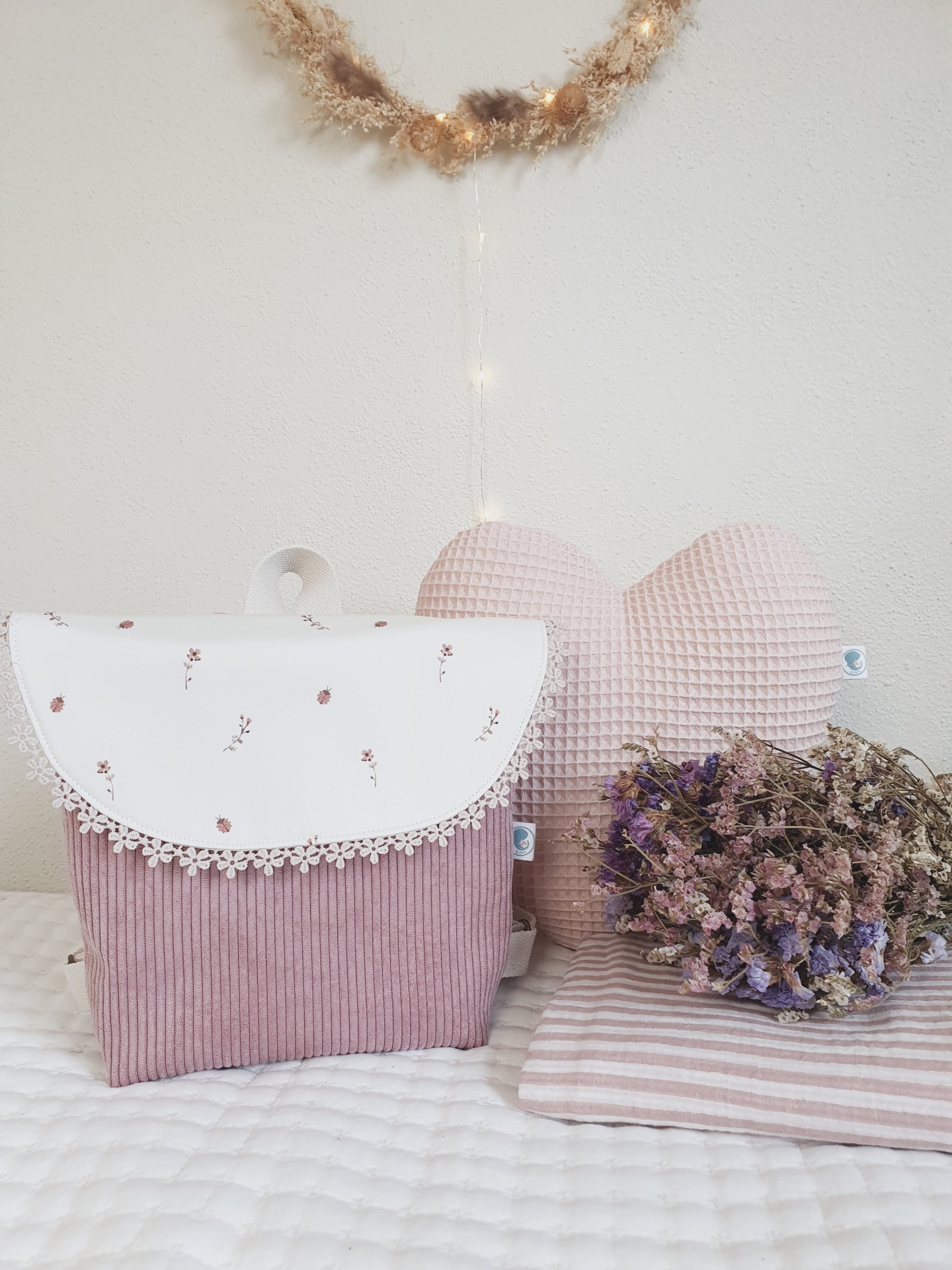 • Mochila rosa e branca com flores, almofada rosa texturizada, flores secas e tecido riscado.