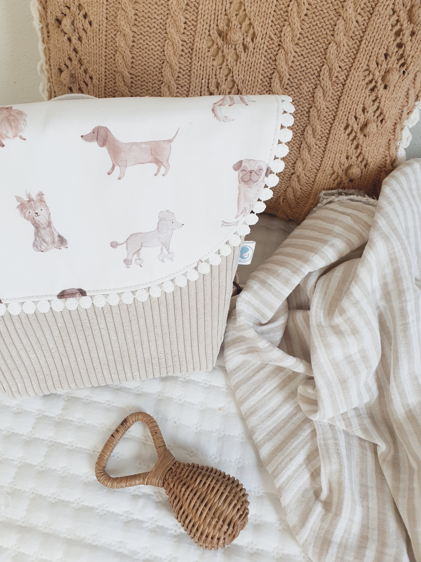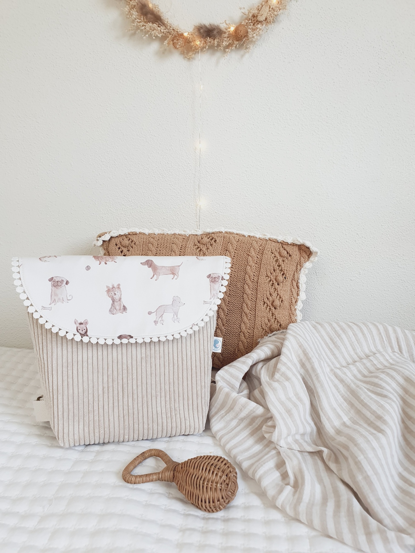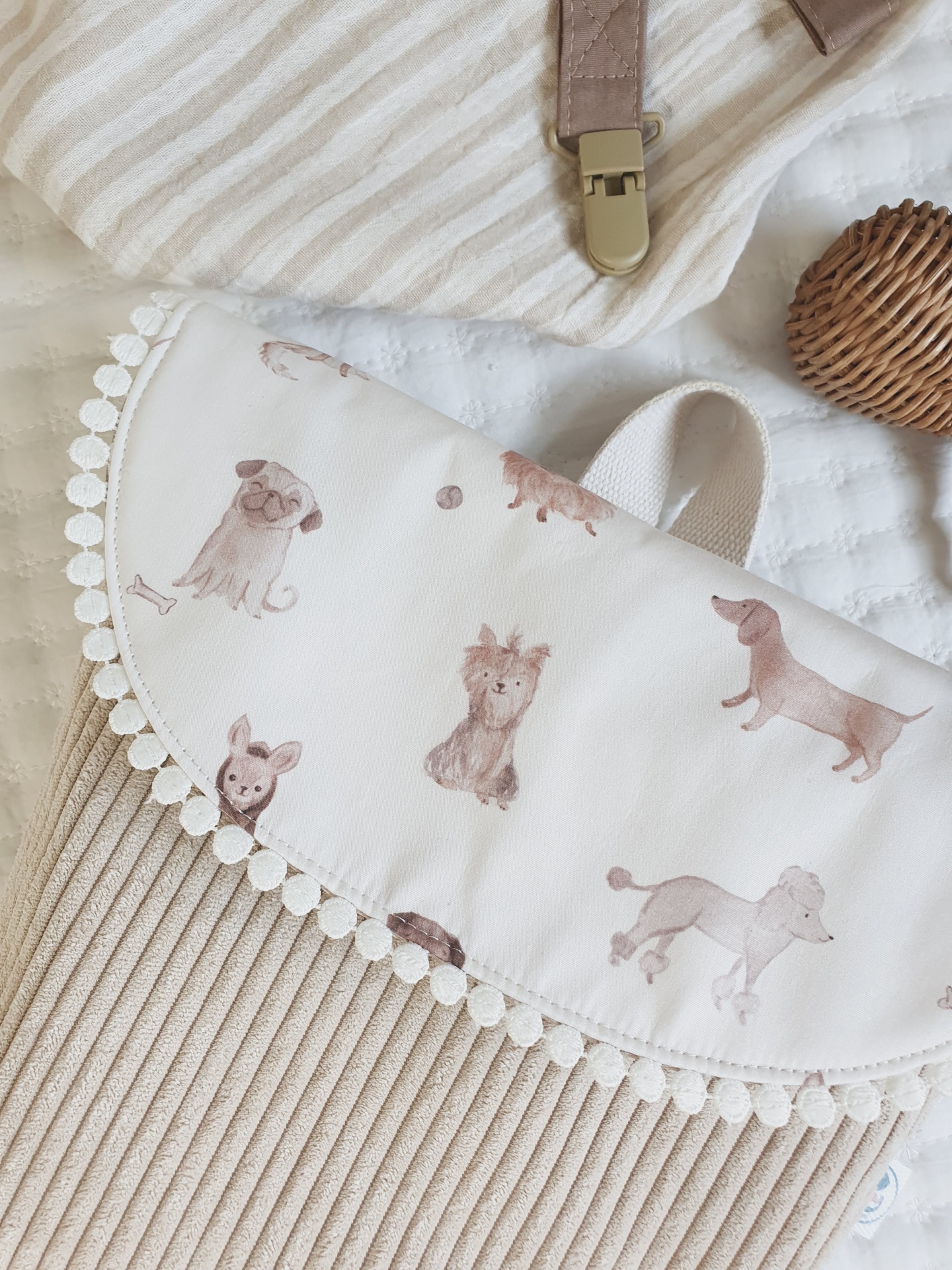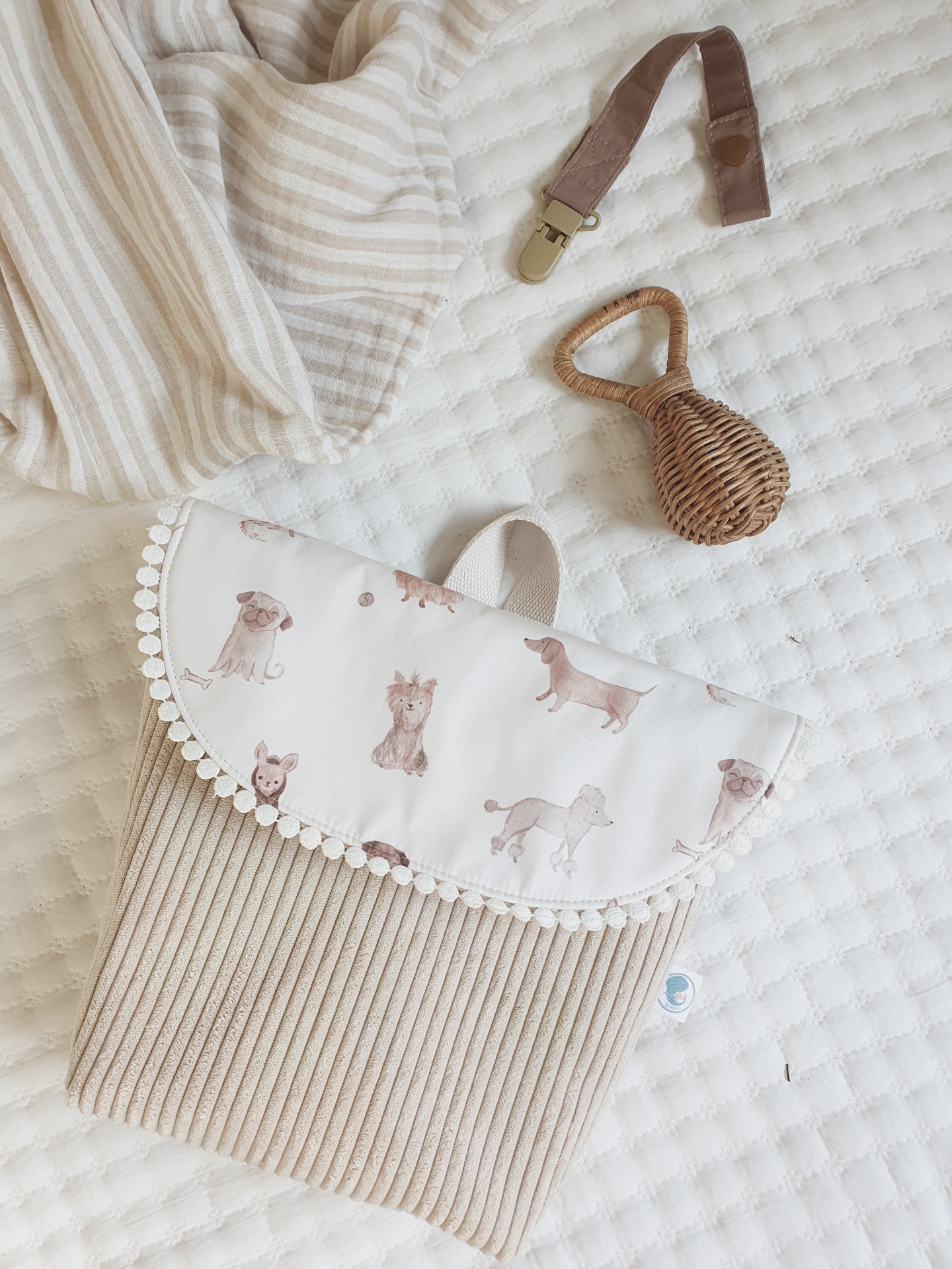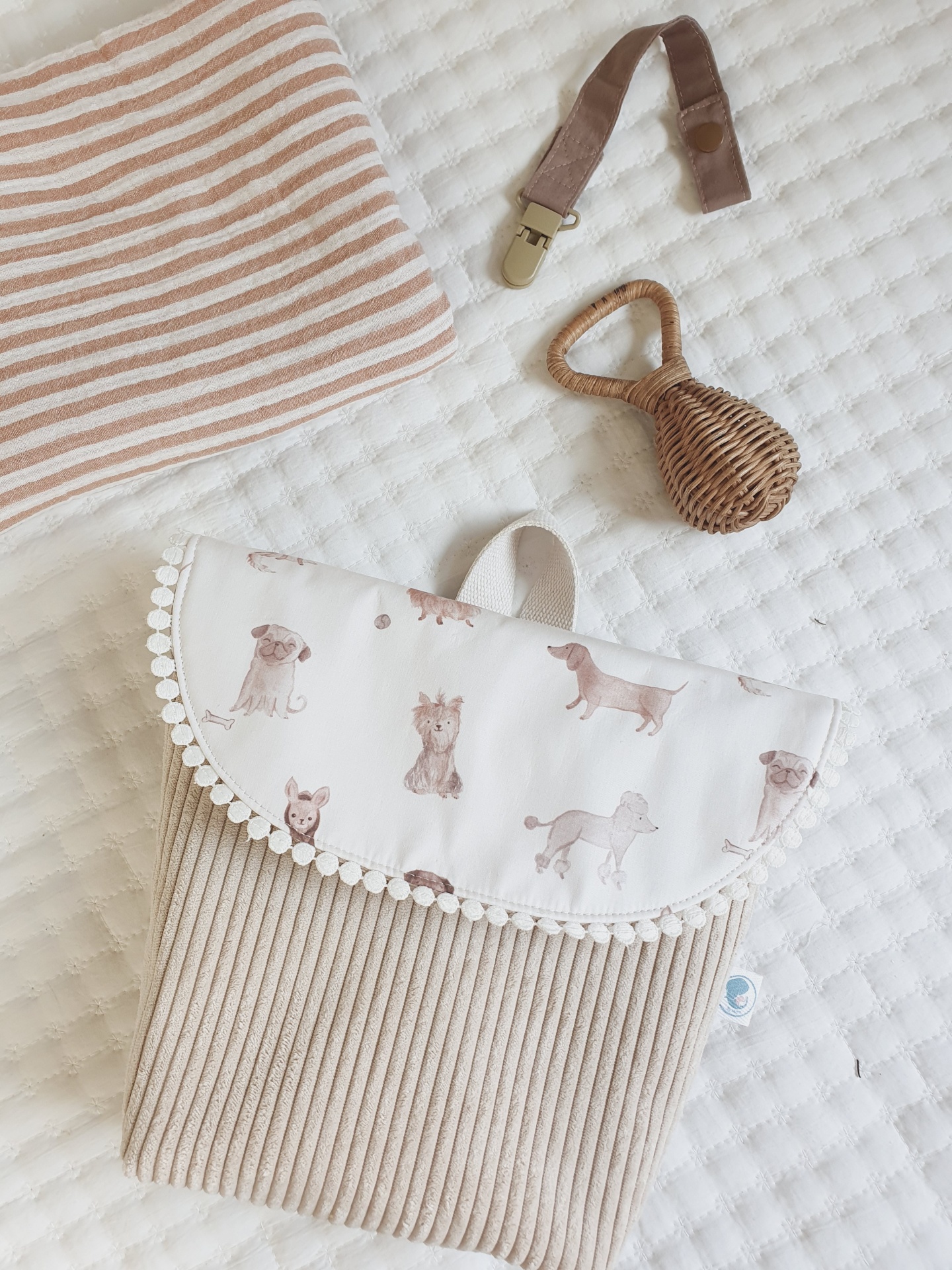 • Mochila infantil bege com padrão de cachorros sobre cobertor branco acolchoado, com tecido riscado, prendedor e brinquedo de madeira