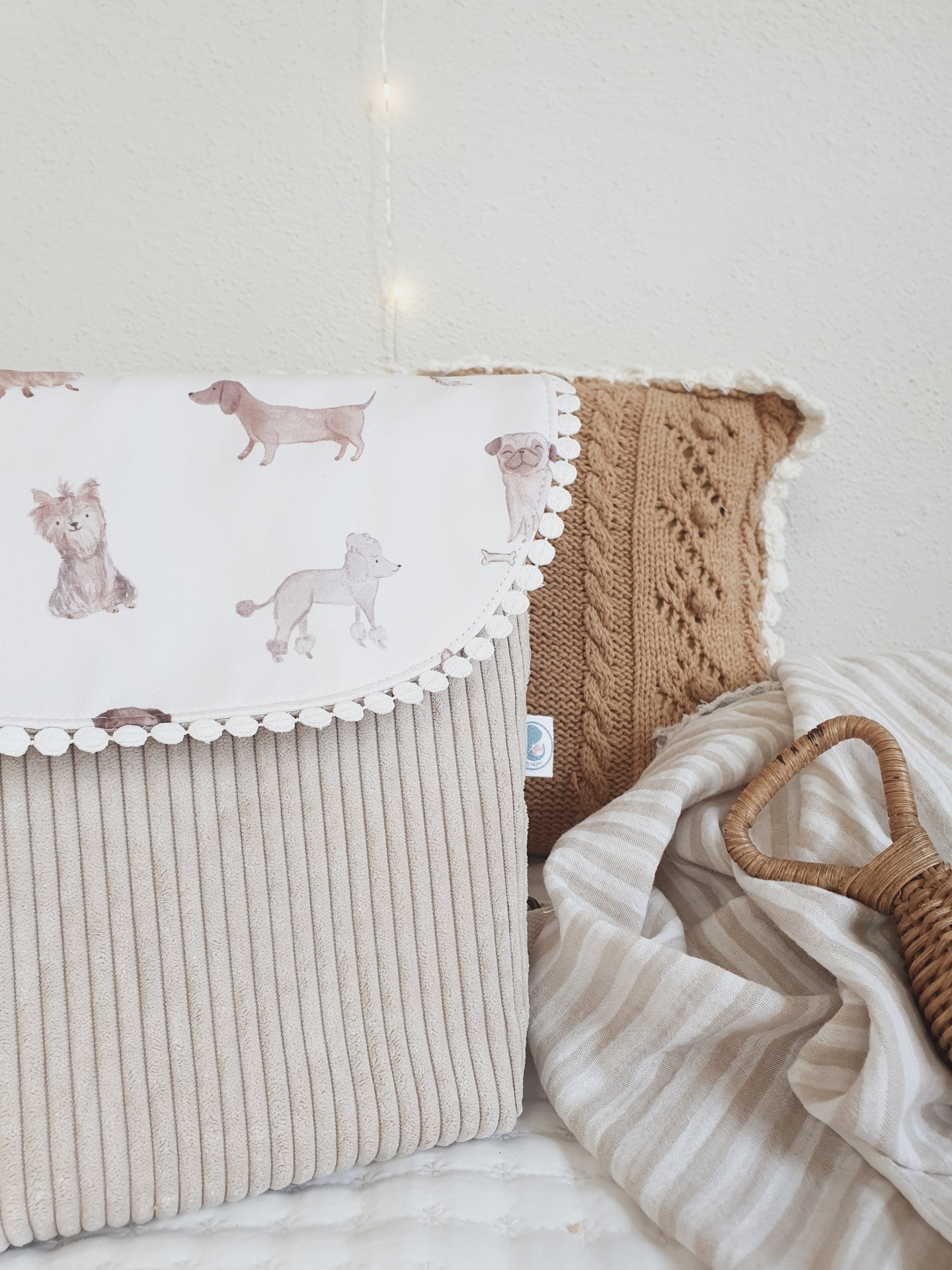 • Bolsa bege com tampa branca e estampado de cães, almofada castanha e manta às riscas