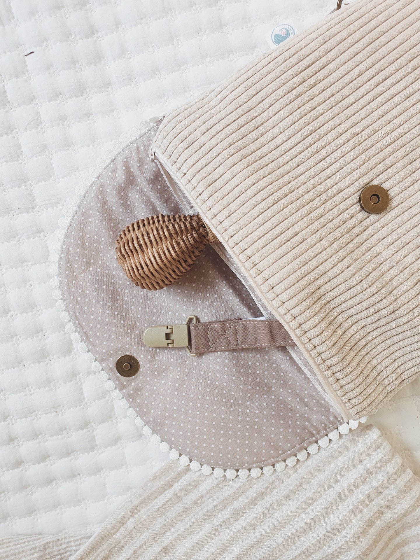 Muito útil para levar para a creche ou até mesmo no dia a dia,  onde pode facilmente guardar o brinquedo preferido do seu bebé,  a chupeta, uma fraldinha de pano, toalhitas, fraldas (2 a 3 fraldas)...
