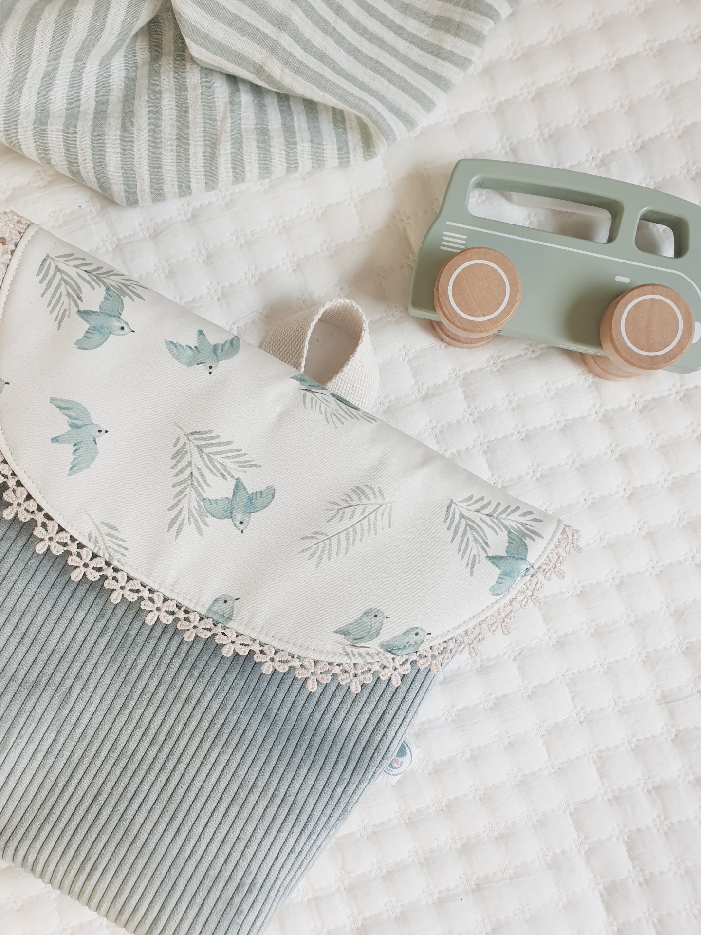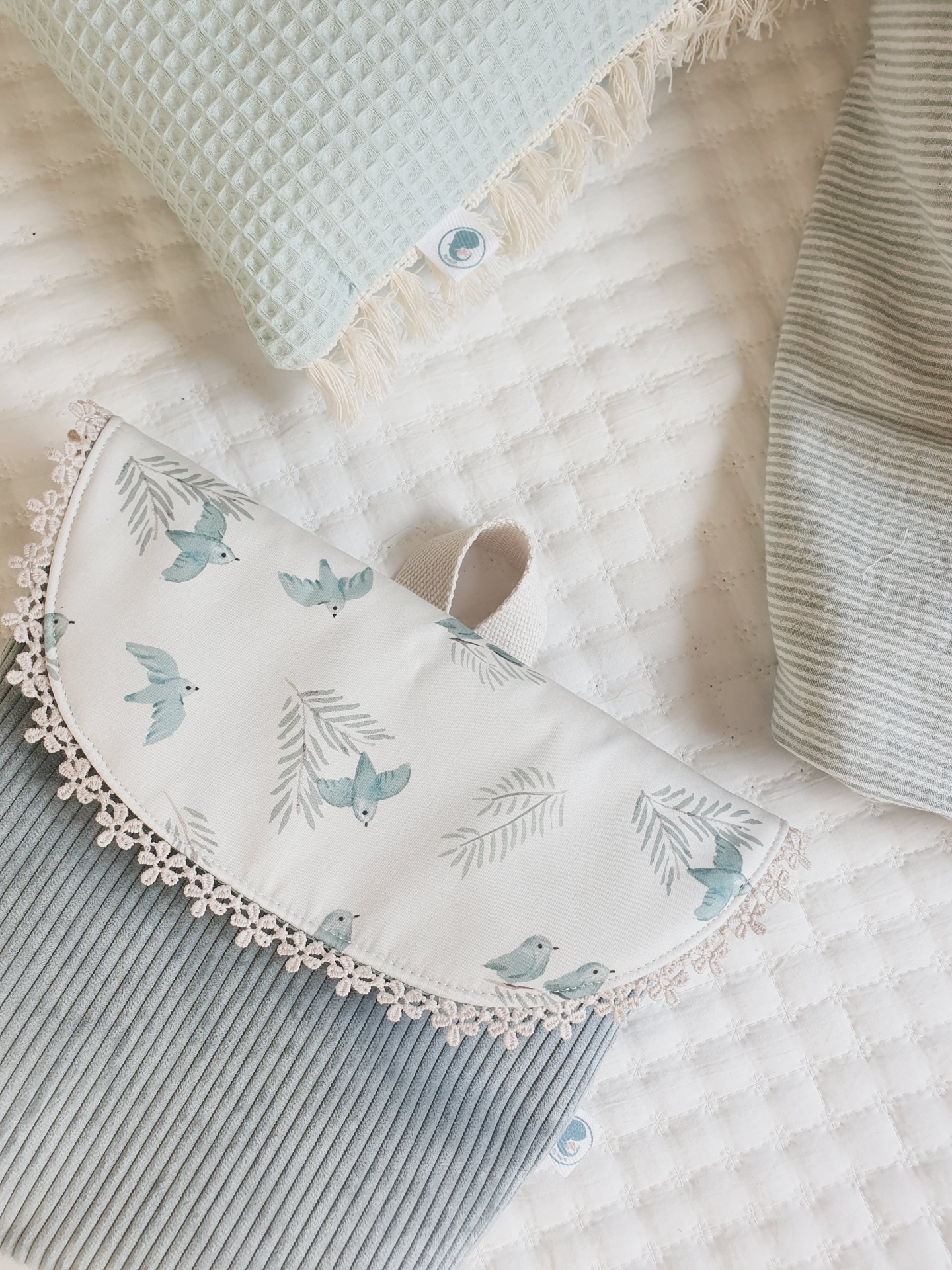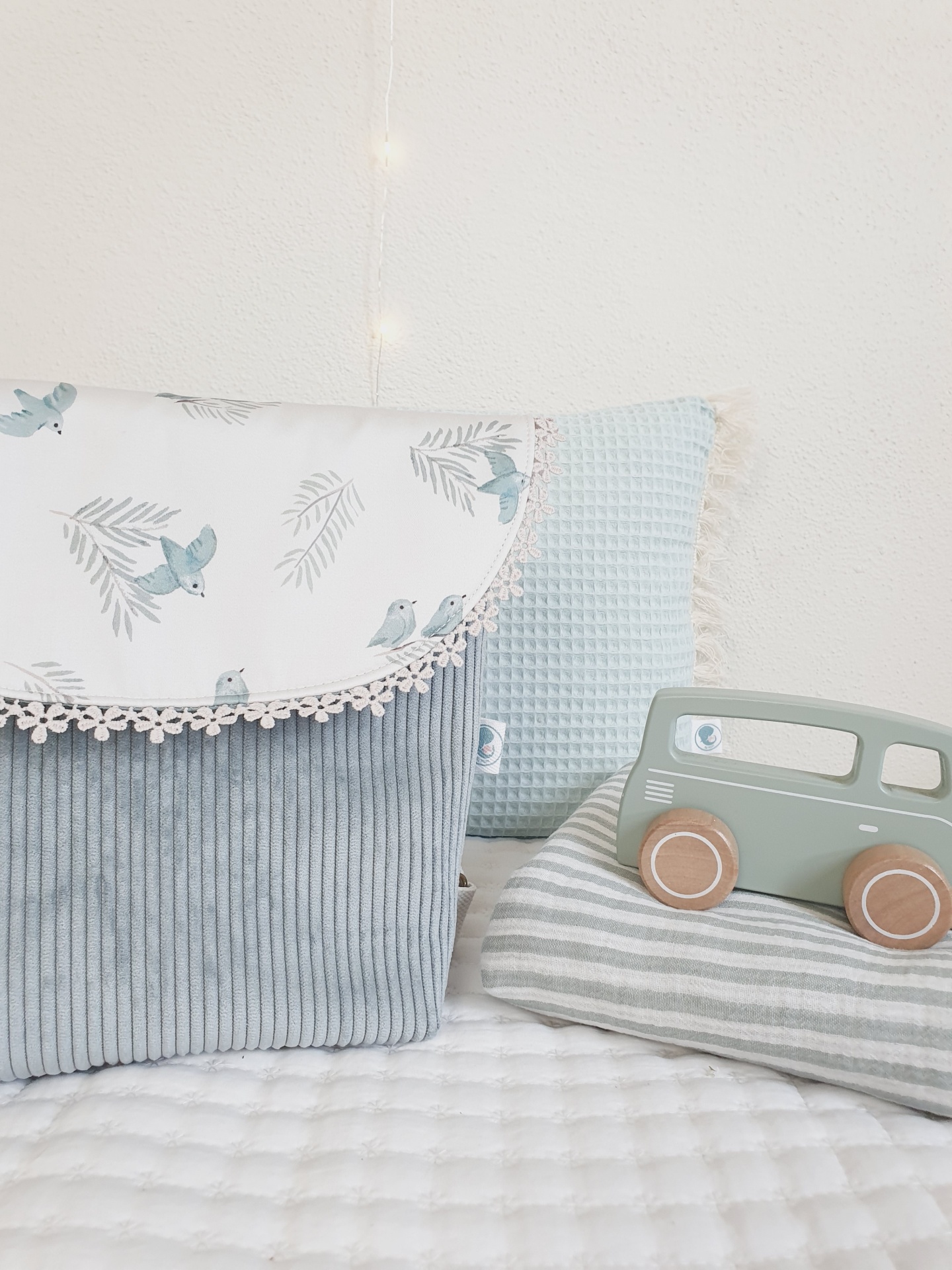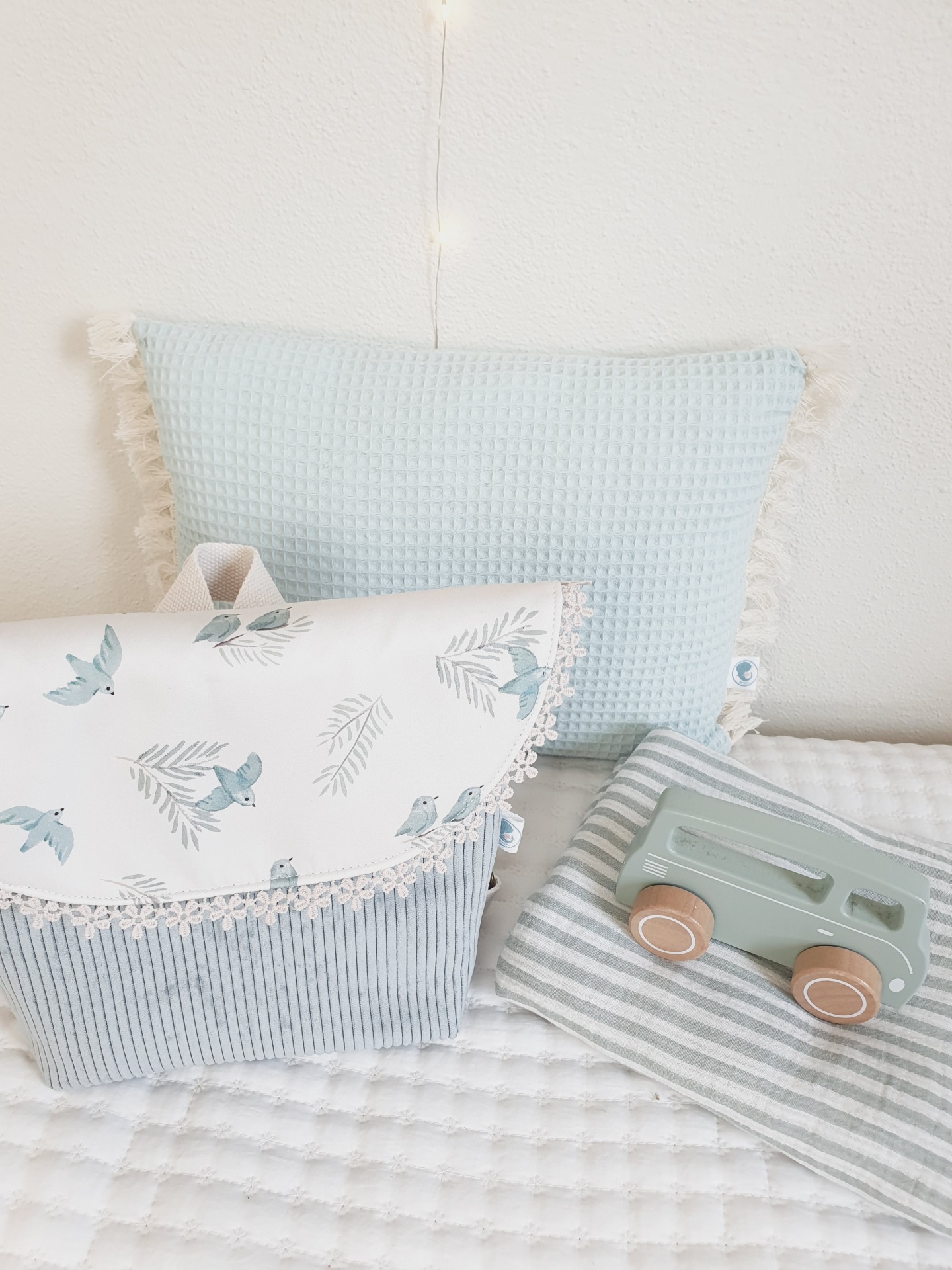 • Almofada azul clara com franjas, bolsa estampada com pássaros azuis e brinquedo de madeira verde sobre manta listrada