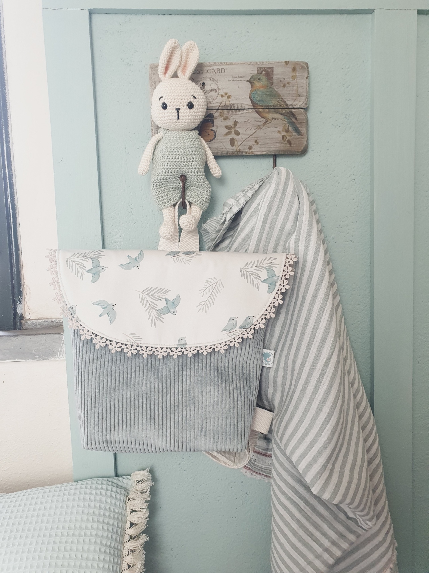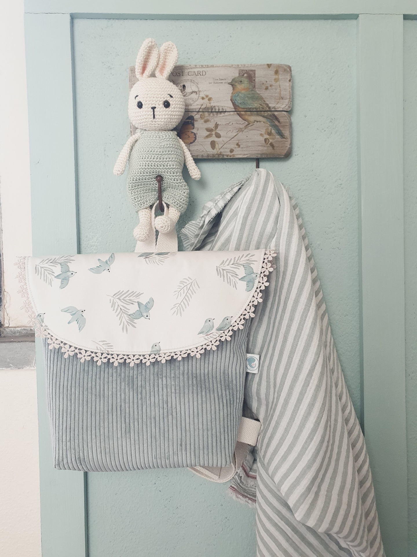 • Mochila de bebé com padrão de aves e brinquedo crochetado coelho pendurados numa porta verde-água.