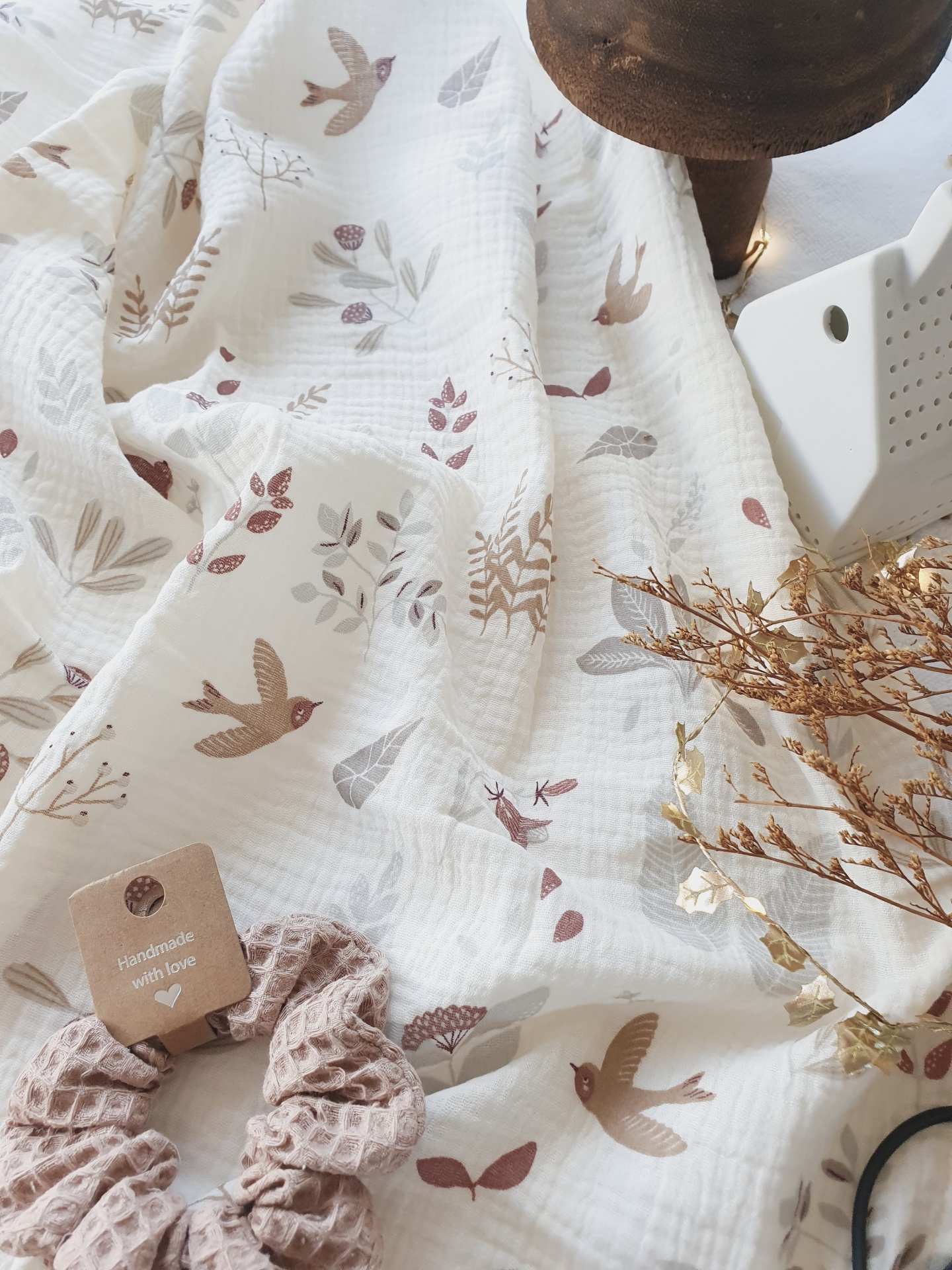 Musselina birds in bege e terracota 15,00 € Desconto de %. Partilhar Comprar Contactar Fralda de pano em musseline 100% algodão, tecido absorvente, respirável e muito macio para a pele delicada do seu bebé. Medidas: 50x70cm Lavagem: à maquina ou à mão a temperatura não superior a 40°. Não passar a ferro.