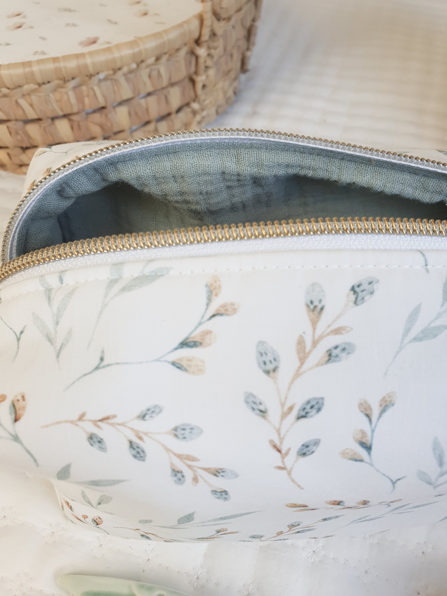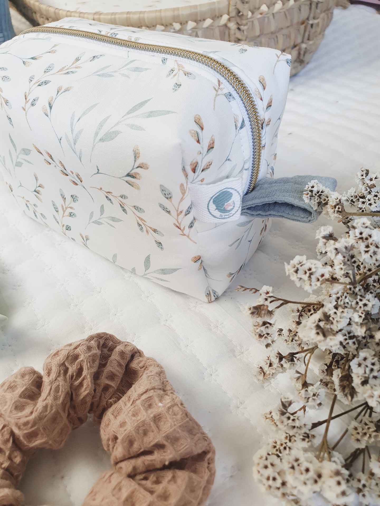 Necessaire box ramos e folhas 22,00 € 25,00 € Desconto de %. Partilhar O produto encontra-se sem stock. Necessaire em formato box, super útil para guardar cosméticos ou os produtos de higiene do seu bebé. De fácil abertura e acesso aos produtos. Super úteis para levar para a maternidade ou em passeio com o seu bebé de forma a ter tudo organizado. Tecidos 100% algodão, certificados com os padrões da UE. Graças ao material interior a bolsa fica sempre com a mesma forma, mesmo depois de lavar. Fecho zipper bastante resistente. Cuidados de lavagem: lavagem à mão ou à maquina a temperatura não superior a 40graus, num programa de roupa delicado. Dimensões: 18x11x10cm.