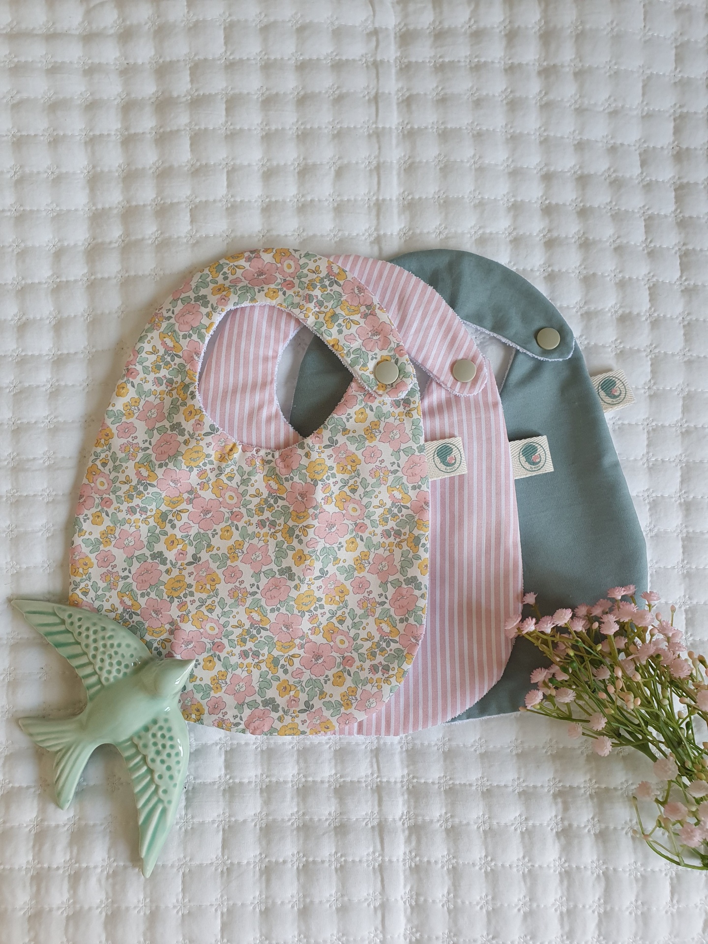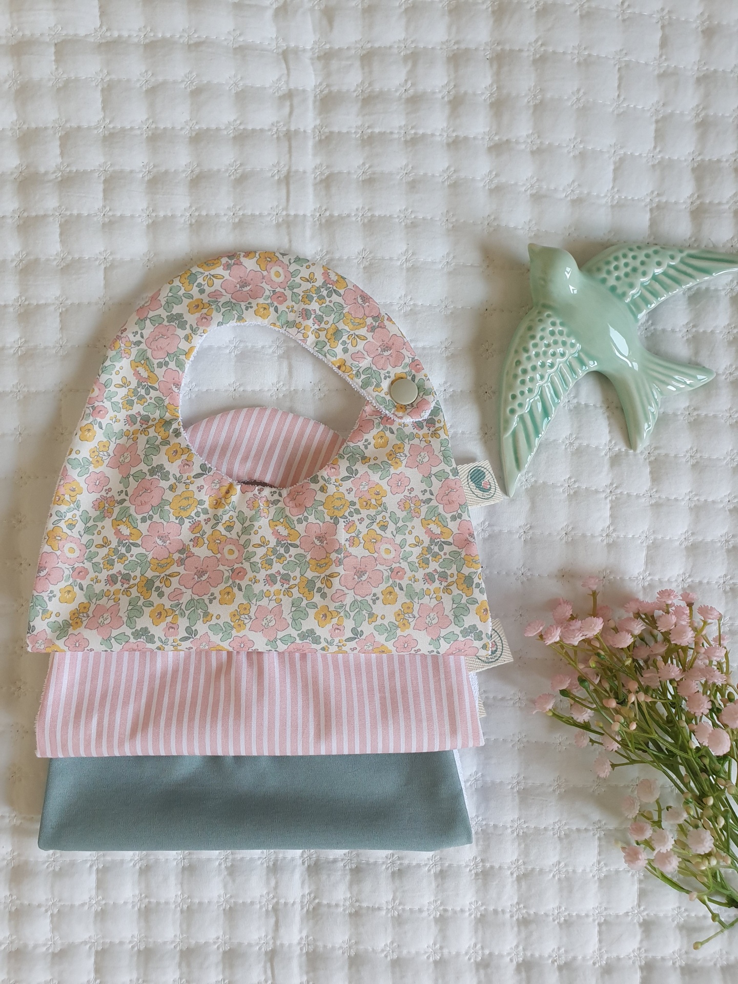 Pack 3 babetes floral verde 25,00 € Desconto de %. Partilhar Comprar Contactar Conjunto de 3 babetes, 100% algodão e turco impermeavel. Idade: dos 0 aos 18 meses Medidas: 26x19cm Cores: floral; riscas rosa; verde sage