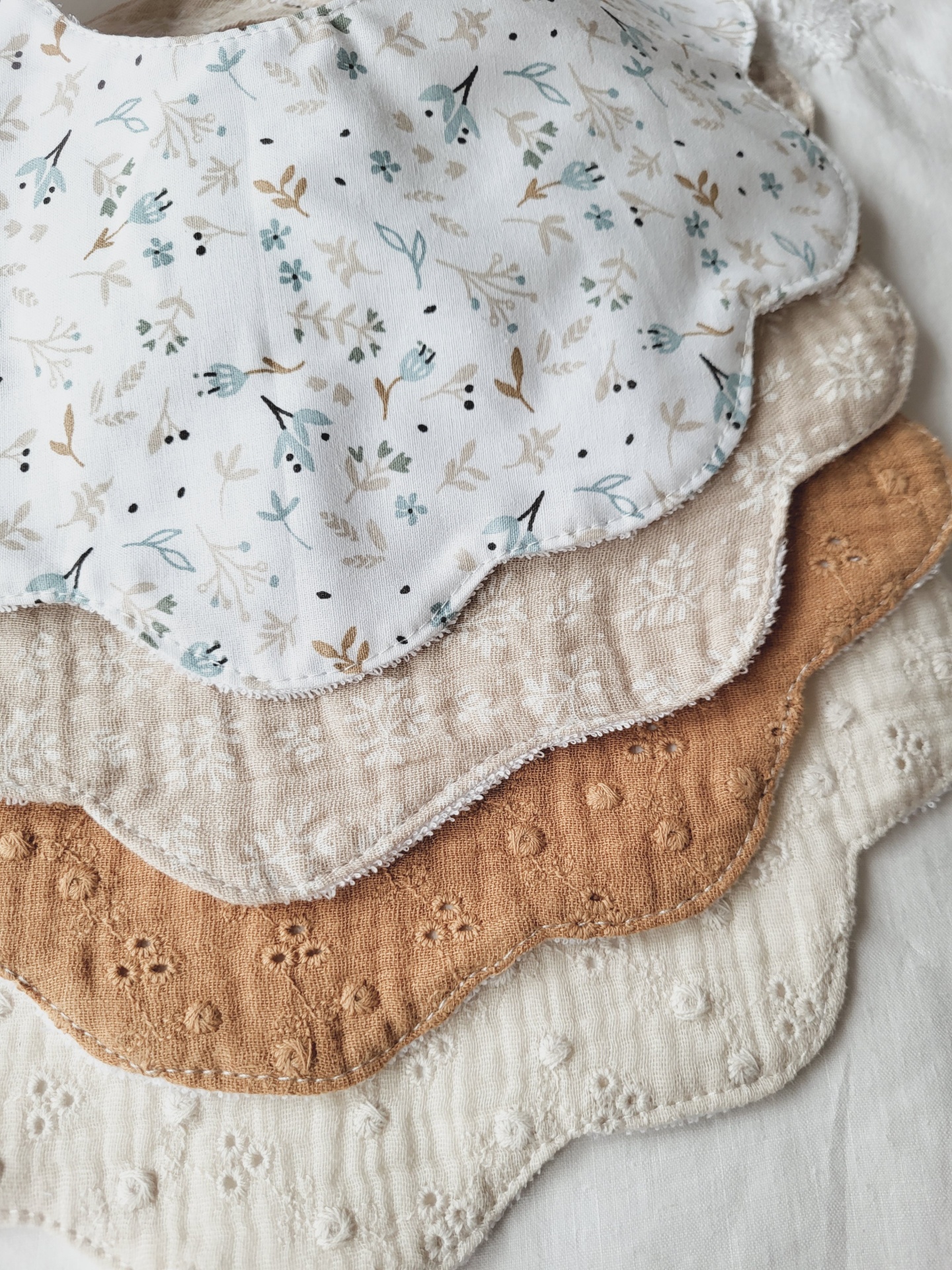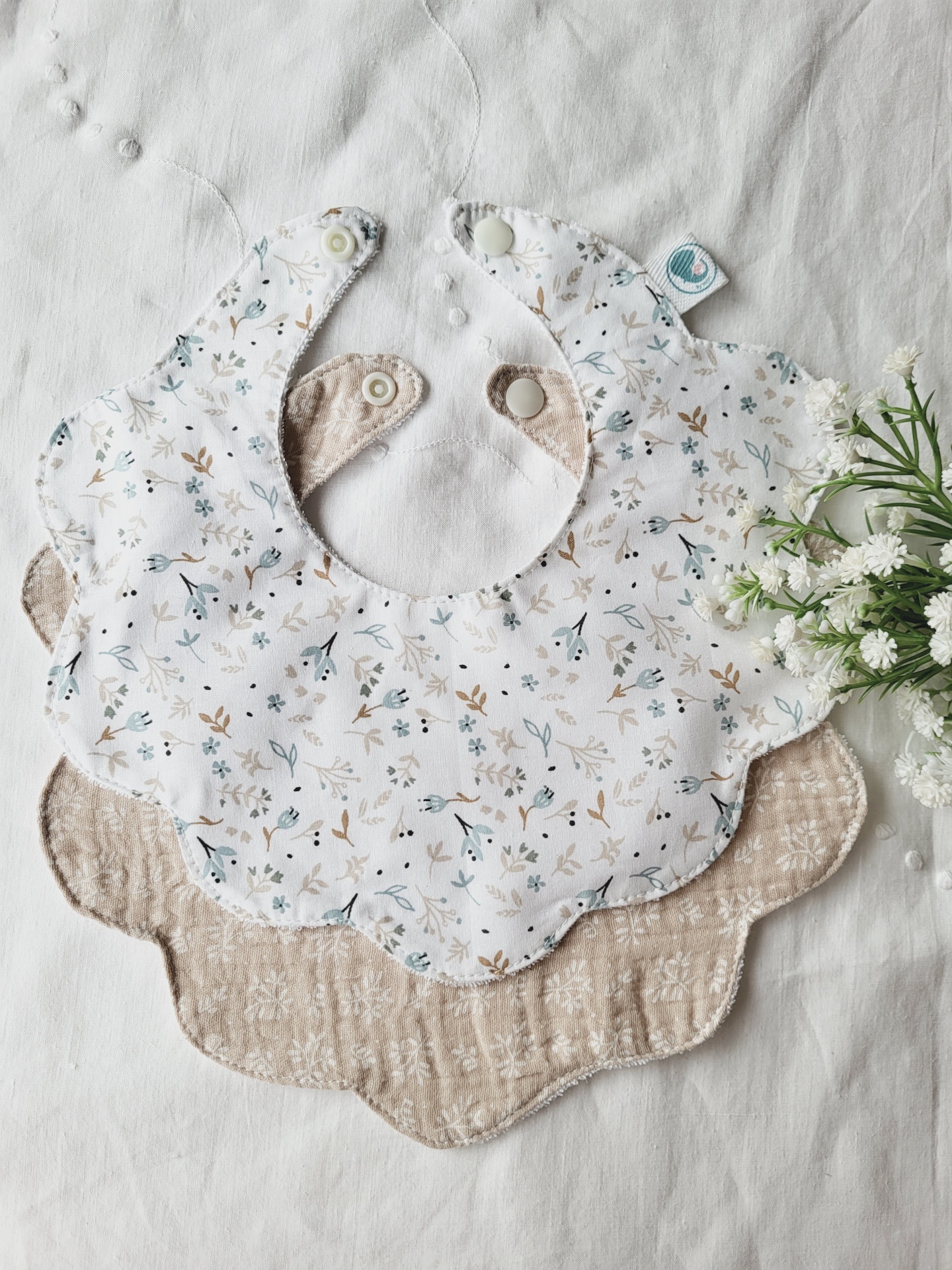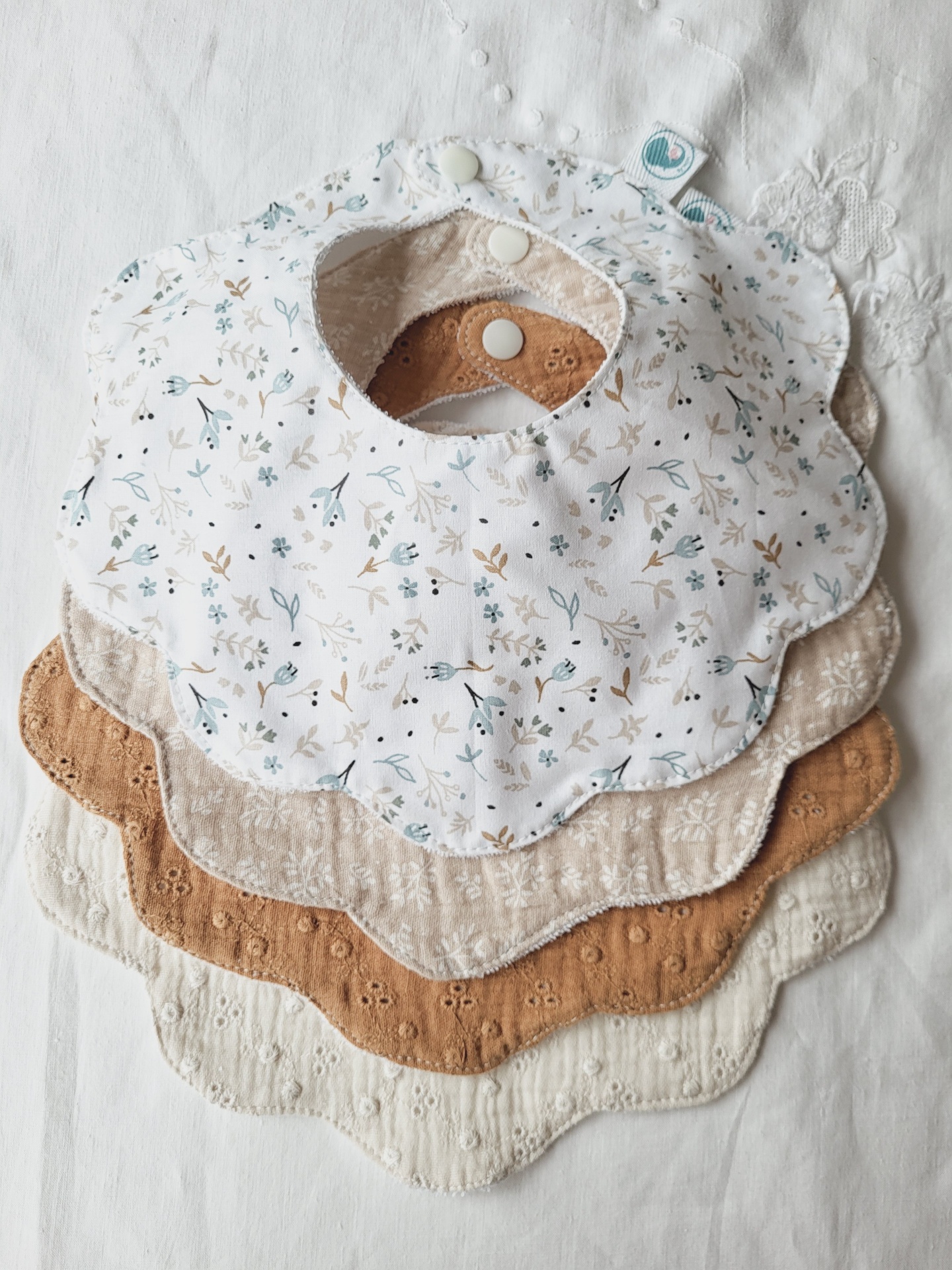 Pack babetes flor raminhos azuis e bege 12,00 € Desconto de %. Partilhar Padrão Raminhos azuis Raminhos bege musselina Pack 2 babetes Comprar Contactar Pack de 2 babetes 100% algodão, muito macios e absorventes! Excelentes para absorver a babinha do seu bebé e deixá-lo sempre seco e confortável. O seu modelo flor vai ficar lindo no seu bebé e nem parece um babete! Fica com um ar de golinha, o ideal para os passeios em família. O pack de 2 babetes é composto pelo 2 babetes de algodão. O babete de bordado inglês terá de ser adquirido à parte e não entra neste pack.