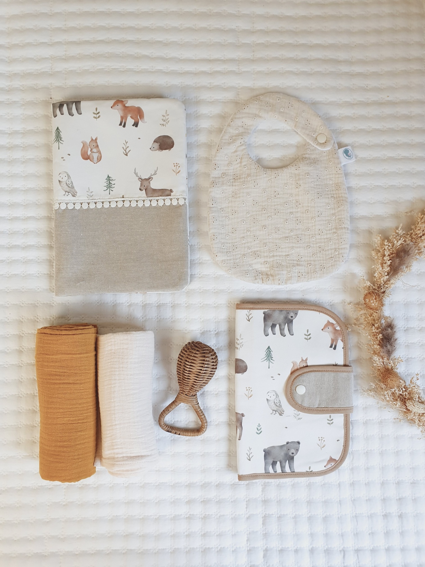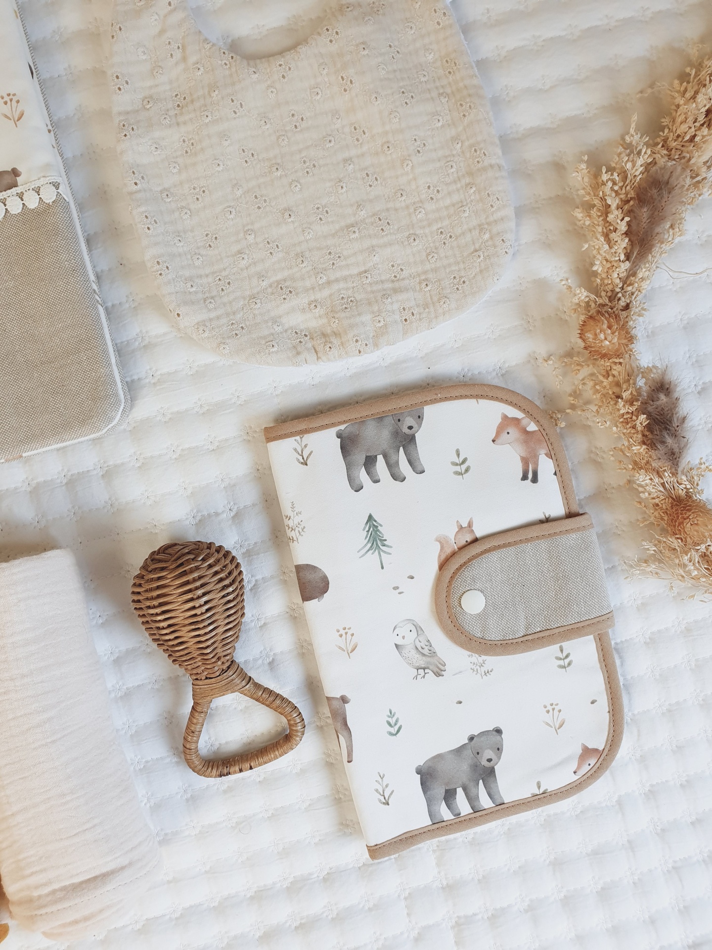Porta documentos animais bosque 20,00 € Desconto de %. Partilhar O produto encontra-se sem stock. Porta documentos com fecho com mola de pressão, em tecido 100% algodão com certificado OEKO-TEX. Com 2 bolso laterais grandes e 3 bolsos pequenos para cartões. Compatível com boletim do bebé português. Medidas aproximadas: 22cm x 15cm. Cores: castanho, cru.