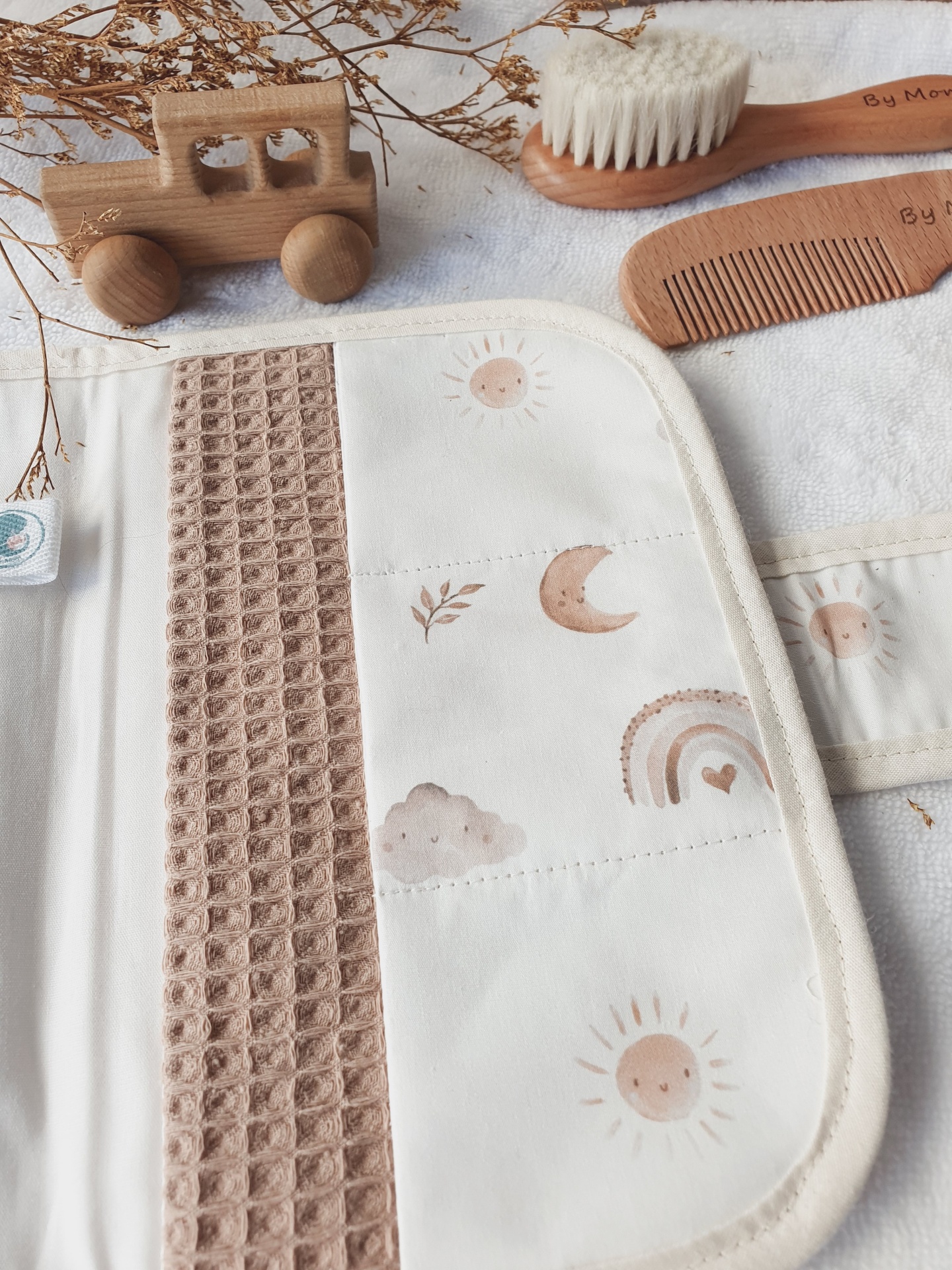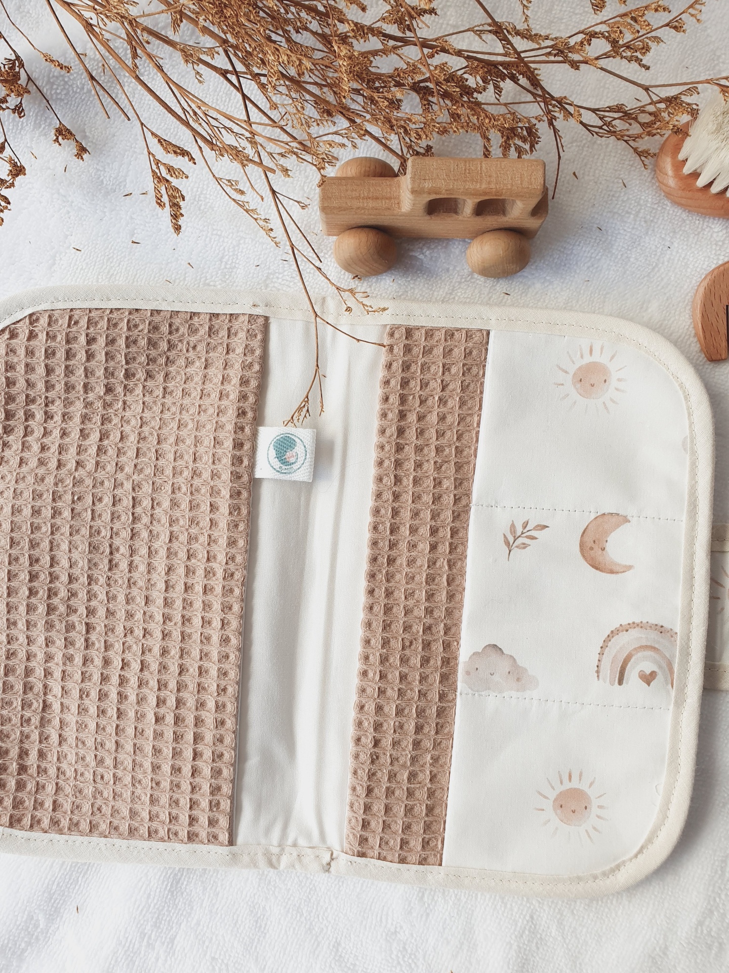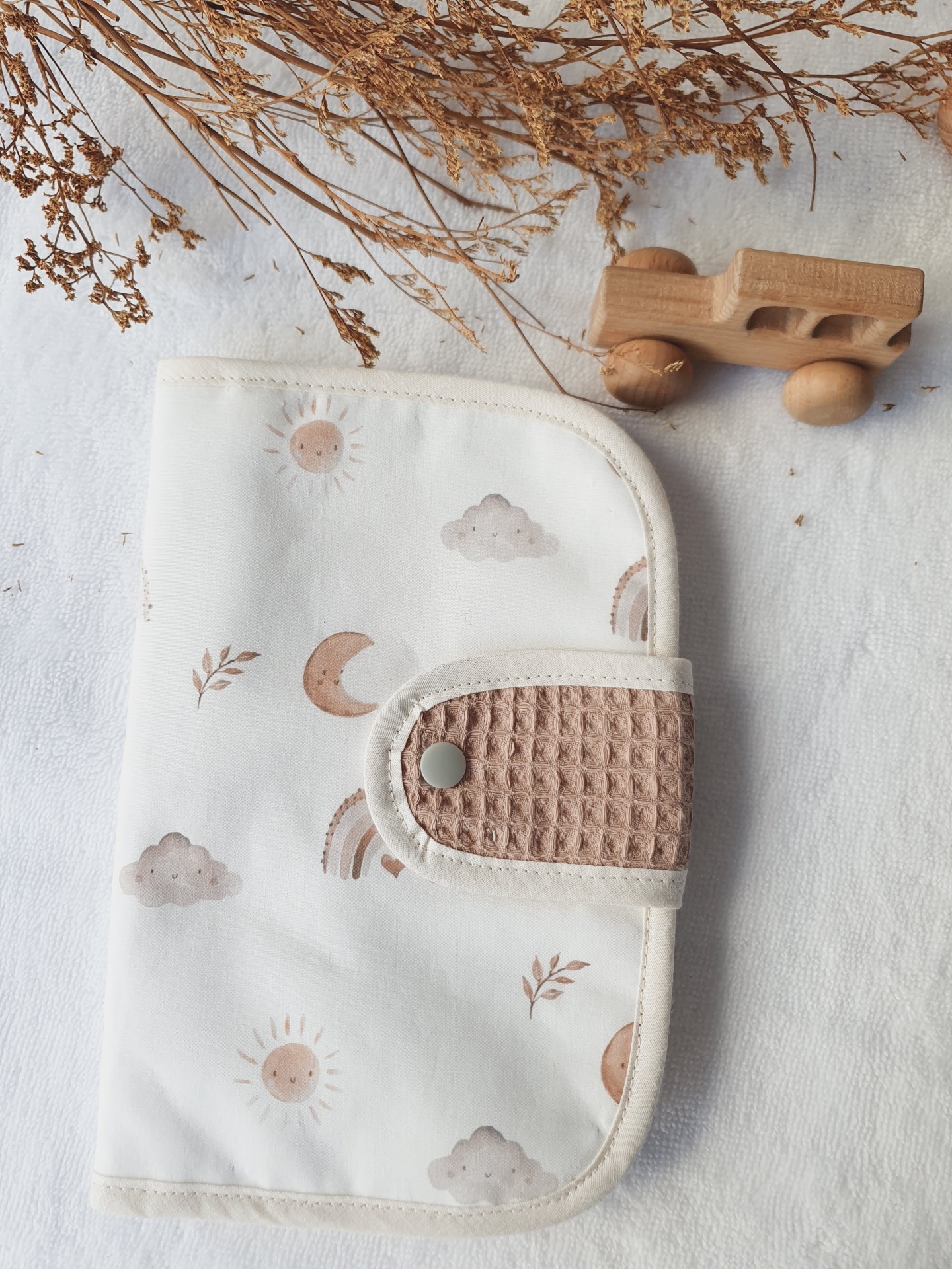 Porta documentos arco-íris e luas 20,00 € Desconto de %. Partilhar Comprar Contactar Porta documentos com fecho com mola de pressão, em tecido 100% algodão com certificado OEKO-TEX. Com 2 bolso laterais grandes e 3 bolsos pequenos para cartões. Compatível com boletim do bebé português. Medidas aproximadas: 22cm x 15cm. Cores: castanho, cru.