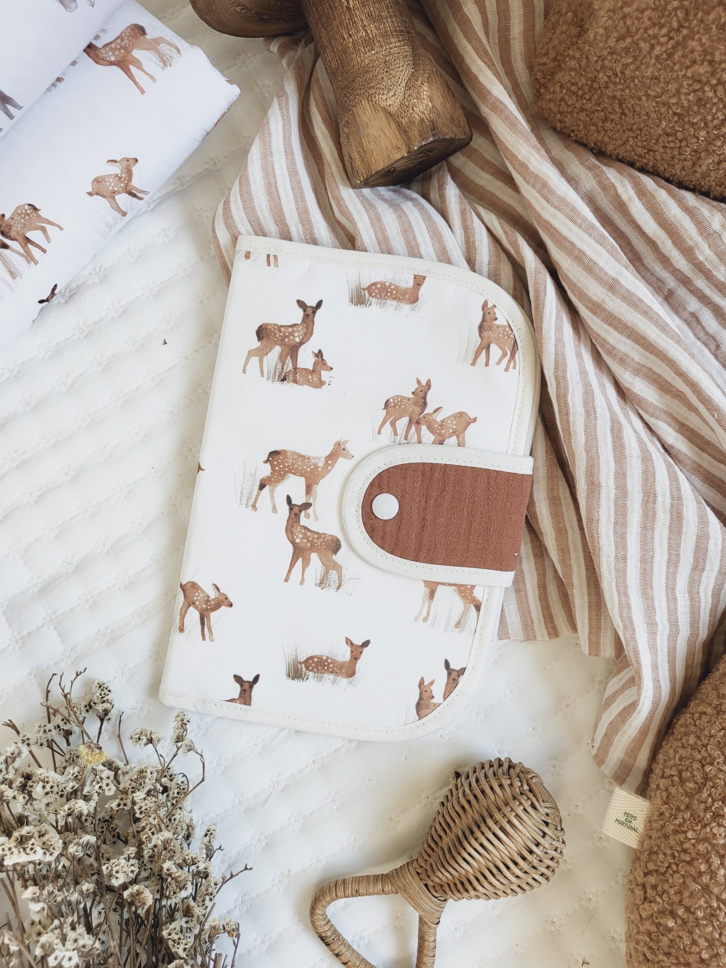 Porta documentos bambis 20,00 € Desconto de %. Partilhar O produto encontra-se sem stock. Porta documentos com fecho com mola de pressão, em tecido 100% algodão com certificado OEKO-TEX. Com 2 bolso laterais grandes e 3 bolsos pequenos para cartões. Compatível com boletim do bebé português. Medidas aproximadas: 22cm x 15cm. Cores: castanho, cru, tijolo.