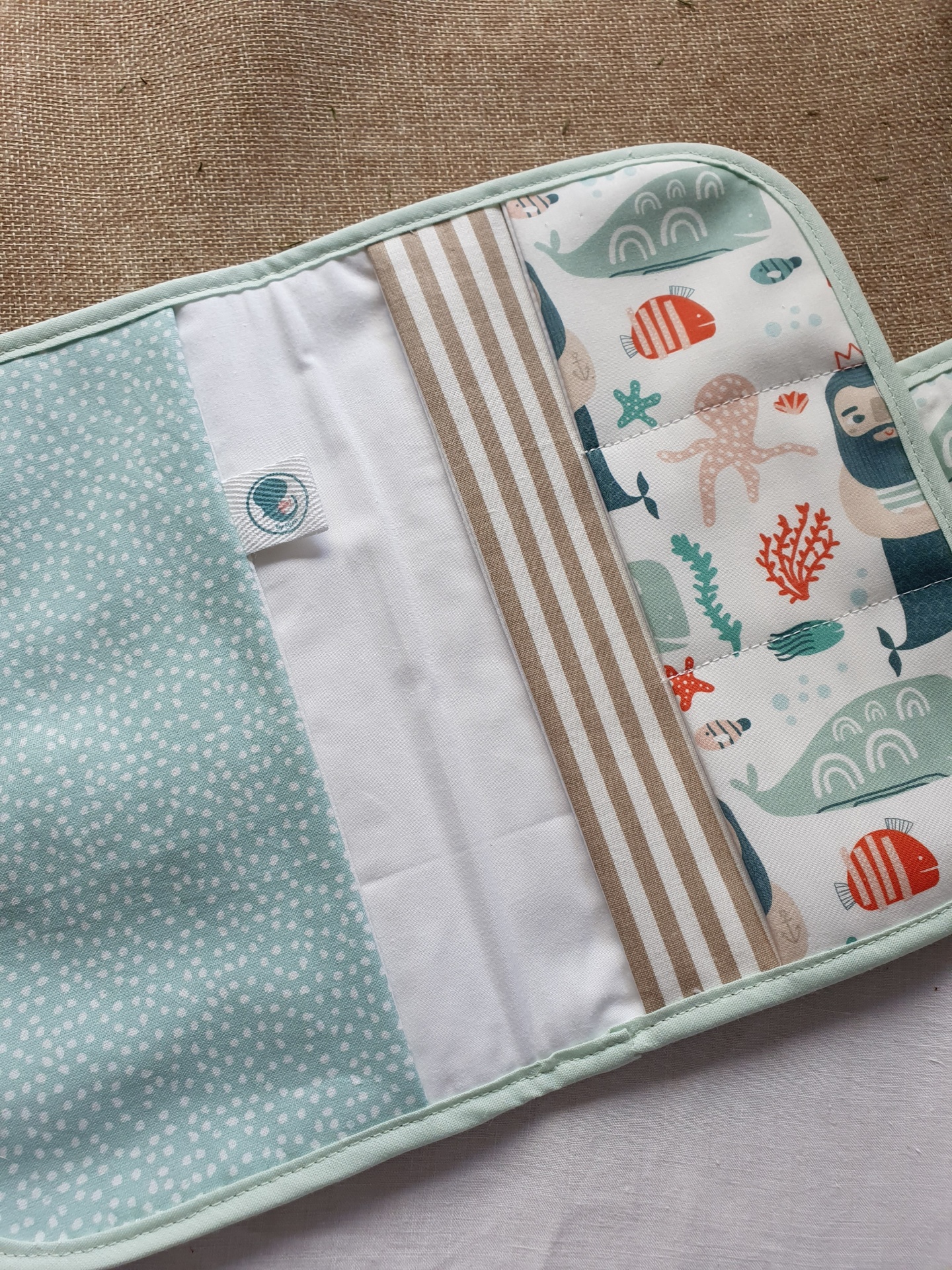 Porta documentos debaixo do mar 12,00 € 15,00 € Desconto de 20%. Partilhar O produto encontra-se sem stock. Porta documentos com fecho com mola de pressão, em tecido 100% algodão com certificado OEKO-TEX 100. Com 2 bolso laterais grandes e 3 bolsos pequenos para cartões. Compatível com boletim do bebé português. Medidas aproximadas: 22cm x 15cm. Cores: menta, encarnado, bege.
