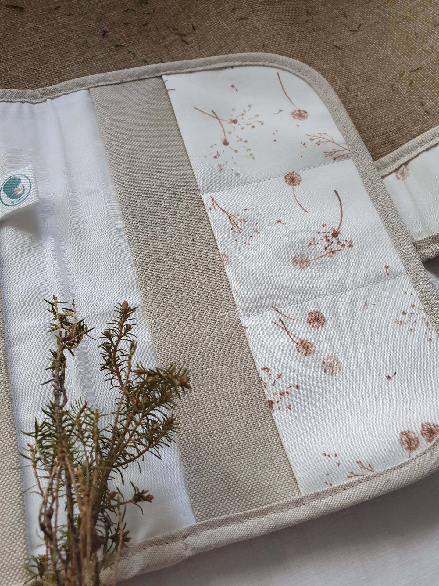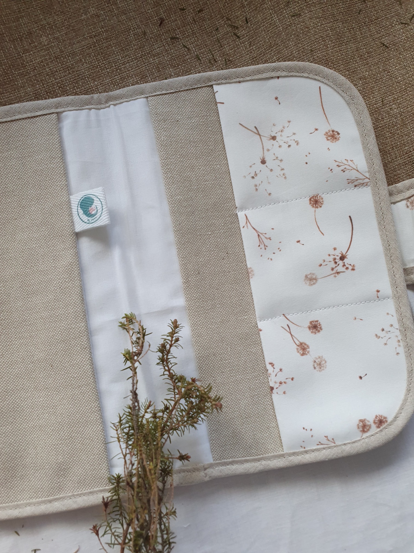 Porta documentos dentes de leão 16,00 € Desconto de %. Partilhar O produto encontra-se sem stock. Porta documentos com fecho com mola de pressão, em tecido 100% algodão com certificado OEKO-TEX 100. Tecido linho alentejano. Com 2 bolso laterais grandes e 3 bolsos pequenos para cartões. Compatível com boletim do bebé português. Medidas aproximadas: 22cm x 15cm. Cores: bege, branco, cru, castanho.