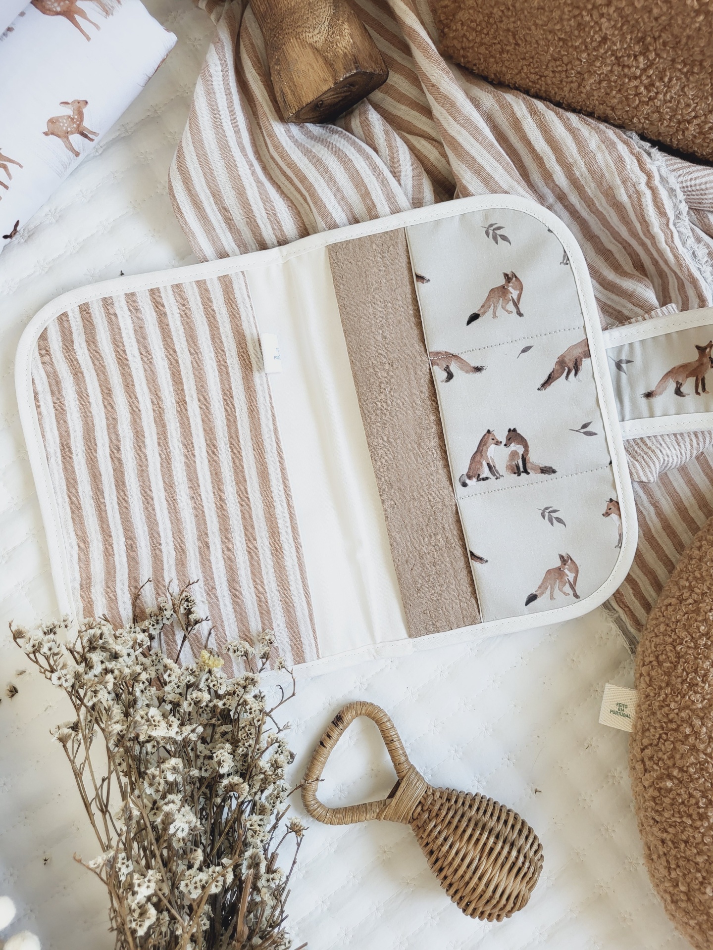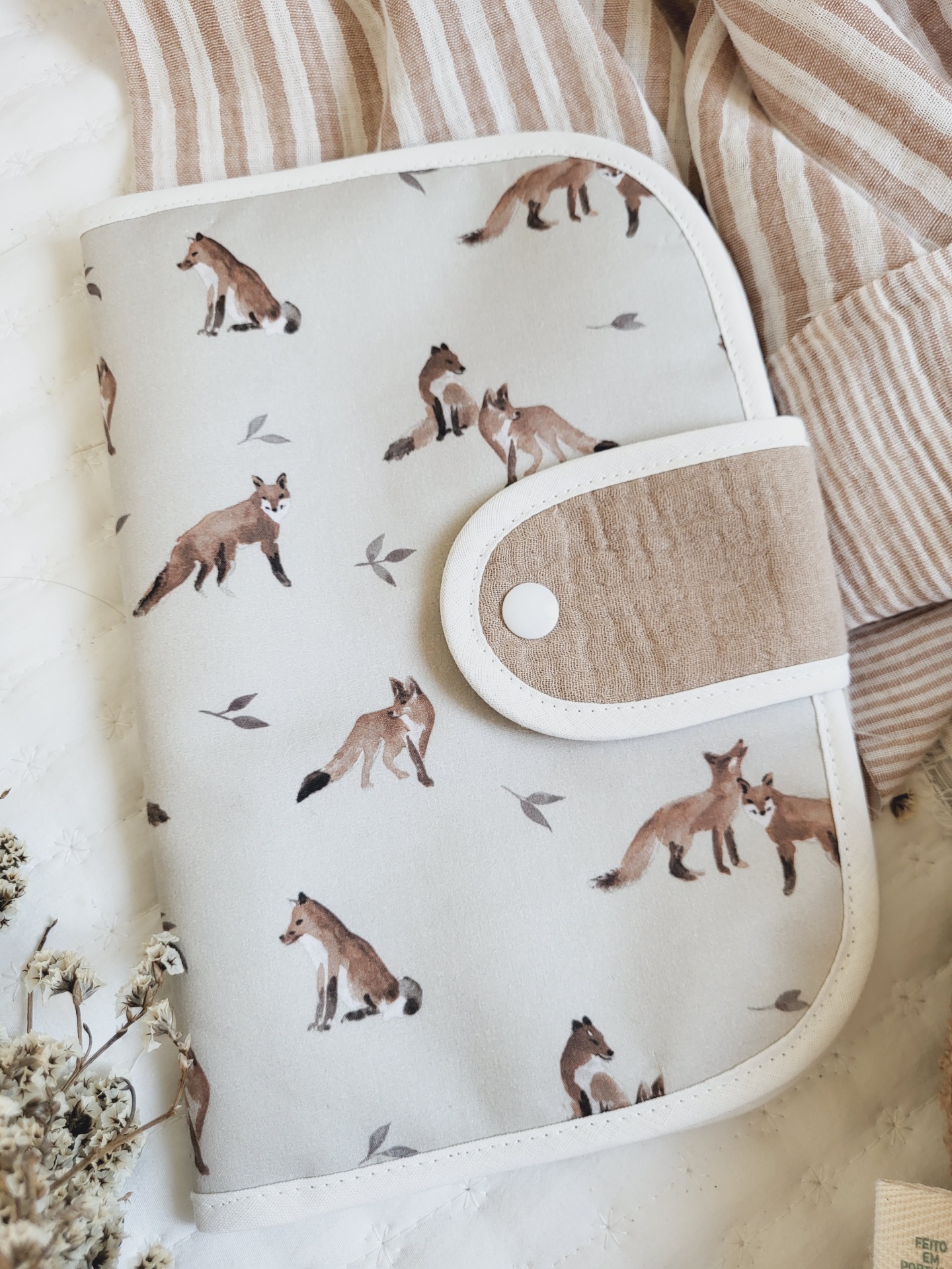 Porta documentos raposas 20,00 € Desconto de %. Partilhar O produto encontra-se sem stock. Porta documentos com fecho com mola de pressão, em tecido 100% algodão com certificado OEKO-TEX. Com 2 bolso laterais grandes e 3 bolsos pequenos para cartões. Compatível com boletim do bebé português. Medidas aproximadas: 22cm x 15cm. Cores: castanho, cru, tijolo.