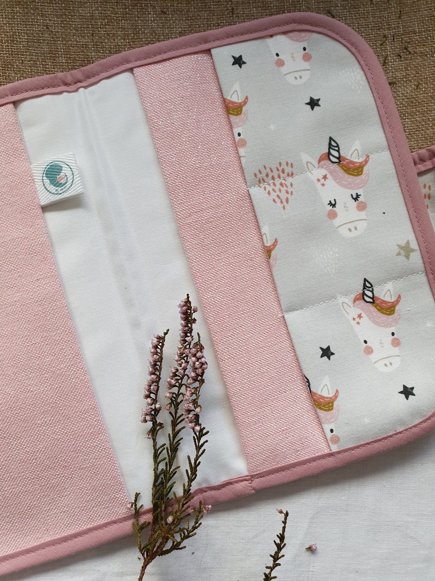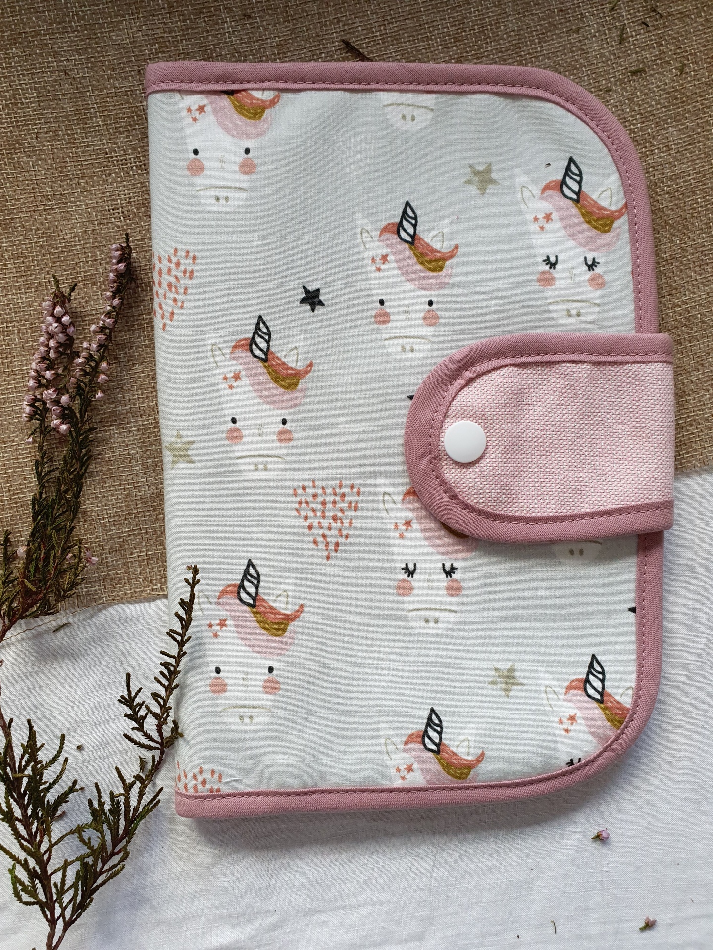Porta documentos unicórnios 12,00 € 15,00 € Desconto de 20%. Partilhar O produto encontra-se sem stock. Porta documentos com fecho com mola de pressão, em tecido 100% algodão com certificado OEKO-TEX 100. Com 2 bolso laterais grandes e 3 bolsos pequenos para cartões. Compatível com boletim do bebé português Medidas aproximadas: 22x15cm