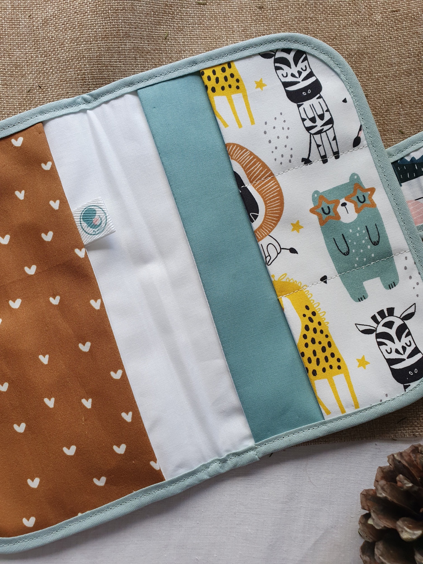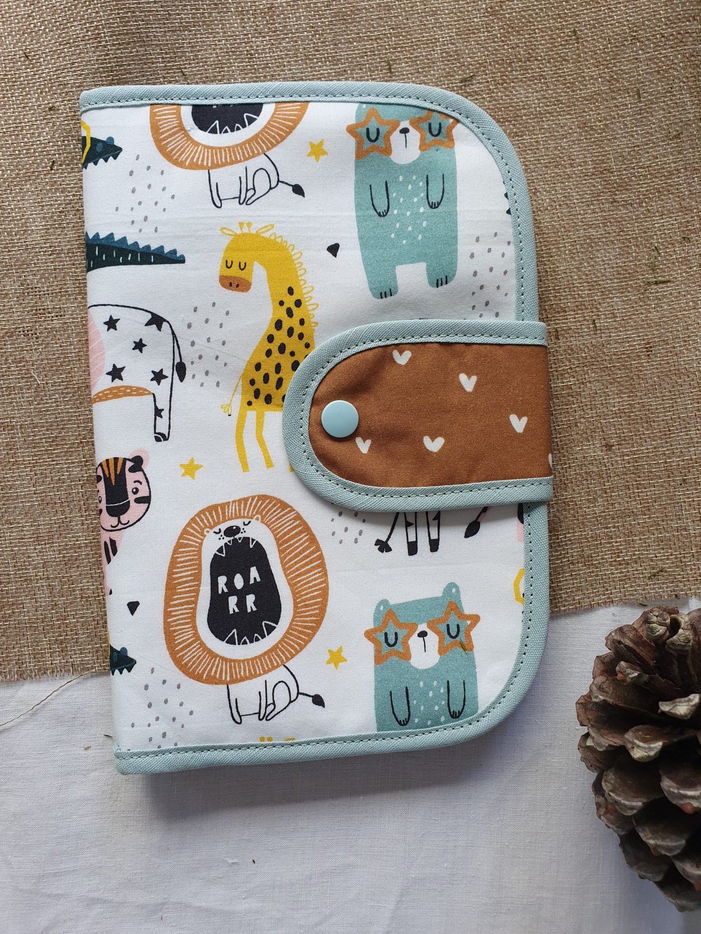 Porta documentos selva 16,00 € Desconto de %. Partilhar O produto encontra-se sem stock. Porta documentos com fecho com mola de pressão, em tecido 100% algodão com certificado OEKO-TEX 100. Com 2 bolso laterais grandes e 3 bolsos pequenos para cartões. Compatível com boletim do bebé português. Medidas aproximadas: 22cm x 15cm. Cores: menta, mostarda, tijolo