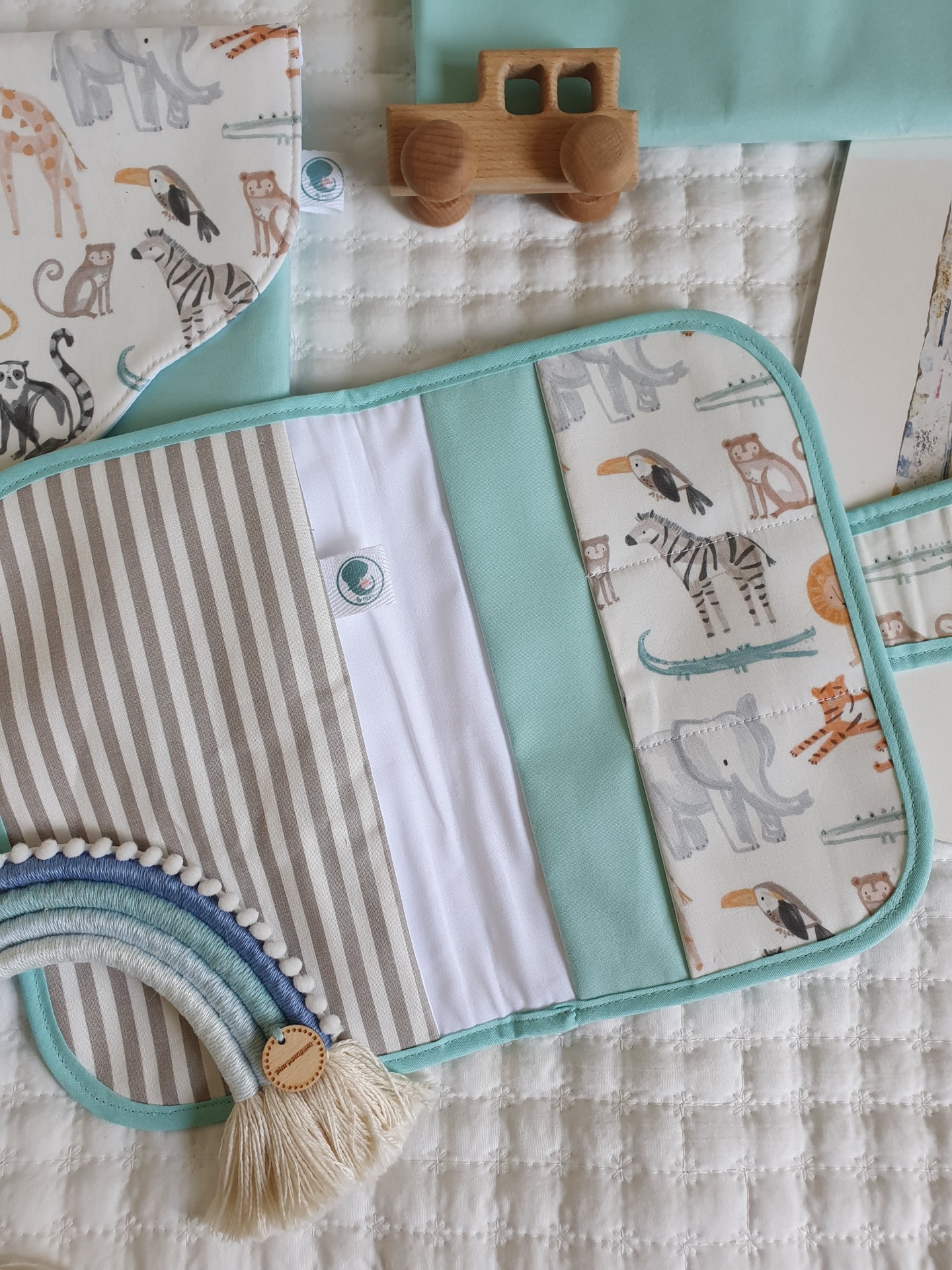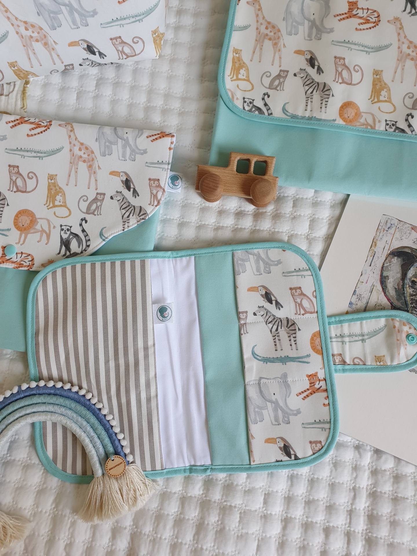 Porta documentos tucanos na selva 18,00 € Desconto de %. Partilhar O produto encontra-se sem stock. Porta documentos com fecho com mola de pressão, em tecido 100% algodão com certificado OEKO-TEX 100. Com 2 bolso laterais grandes e 3 bolsos pequenos para cartões. Compatível com boletim do bebé português. Medidas aproximadas: 22cm x 15cm. Cores: menta, cinza.