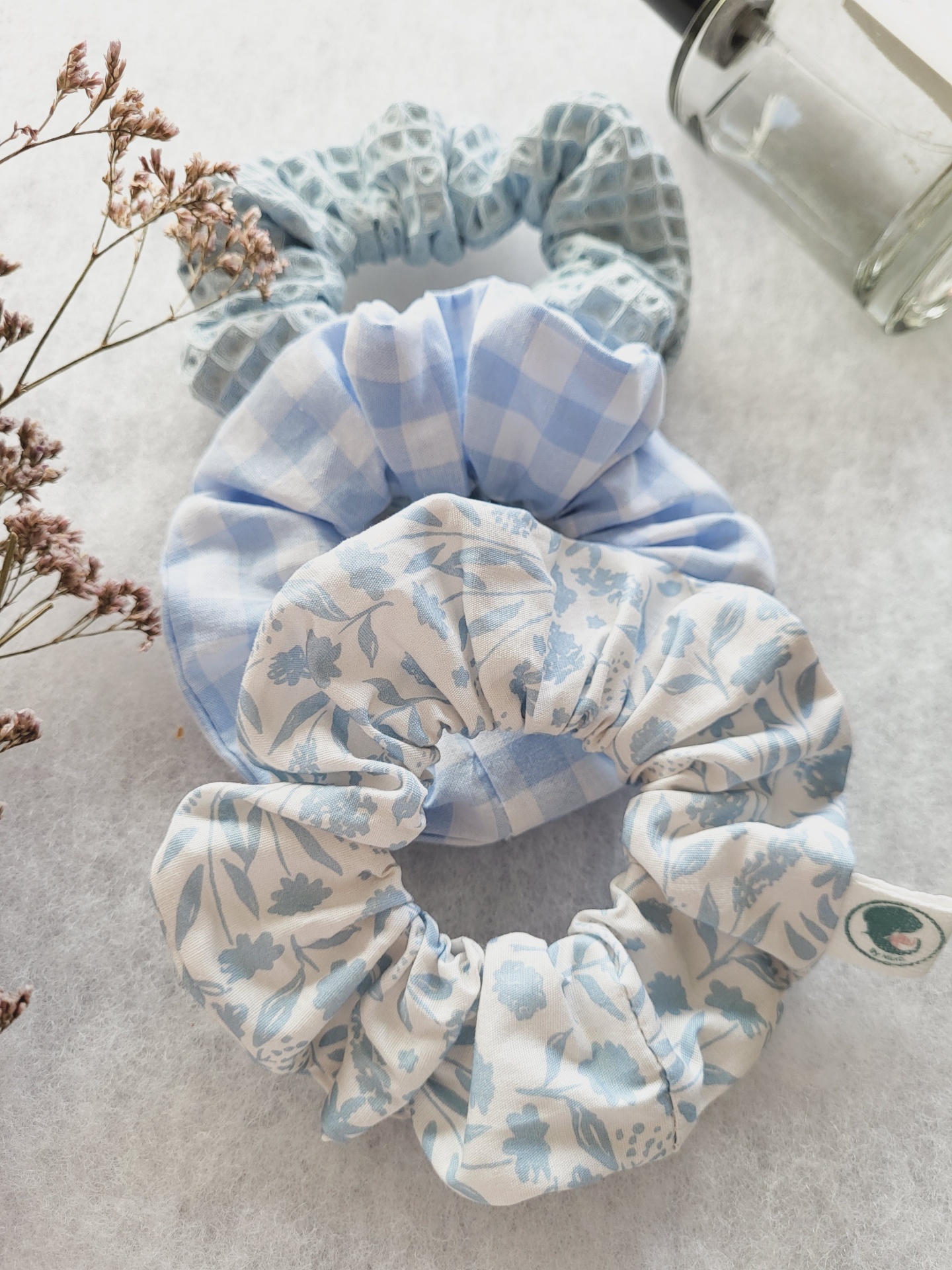 • Três scrunchies de tecido azul e branco com padrões diversos sobre fundo claro