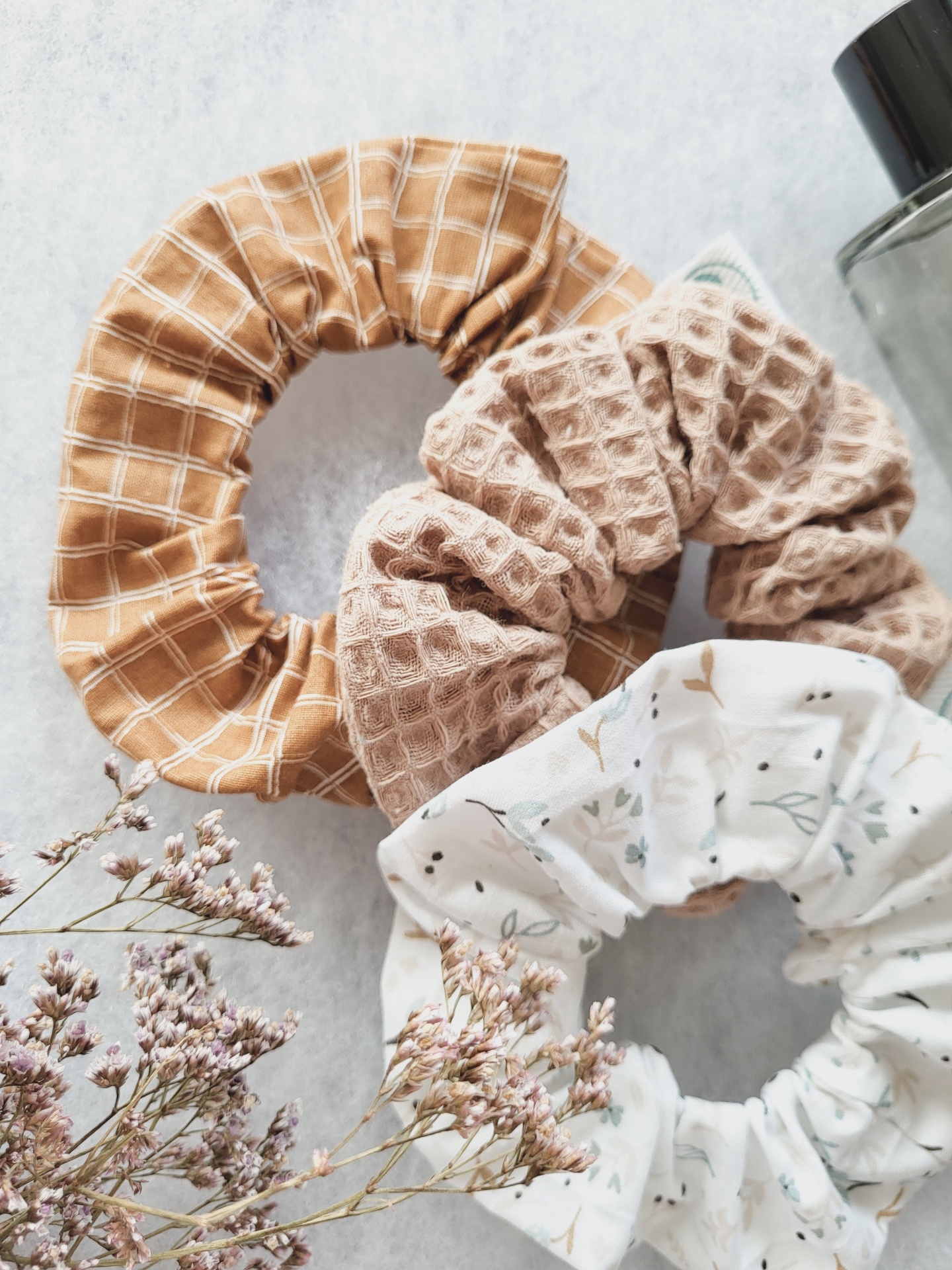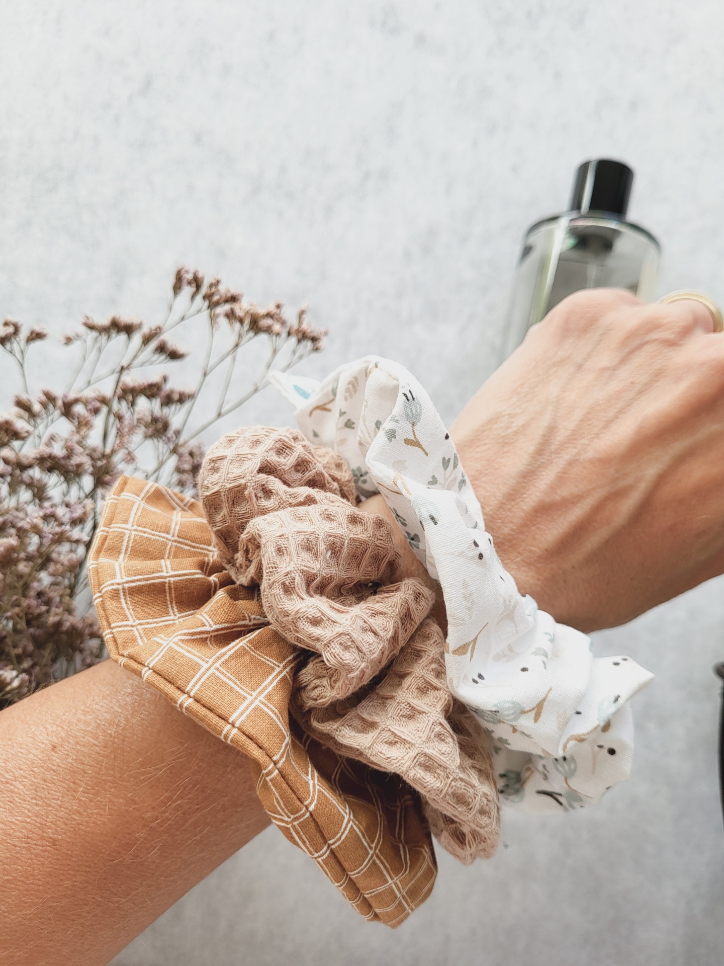 • Três scrunchies de tecido com diferentes padrões e texturas sobre superfície cinza com flores secas.