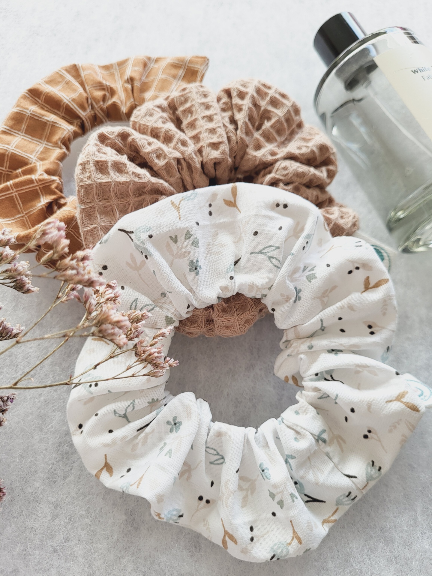 • Três scrunchies em tecidos diferentes com padrões florais e geométricos, ao lado de uma garrafa de vidro e flores secas.