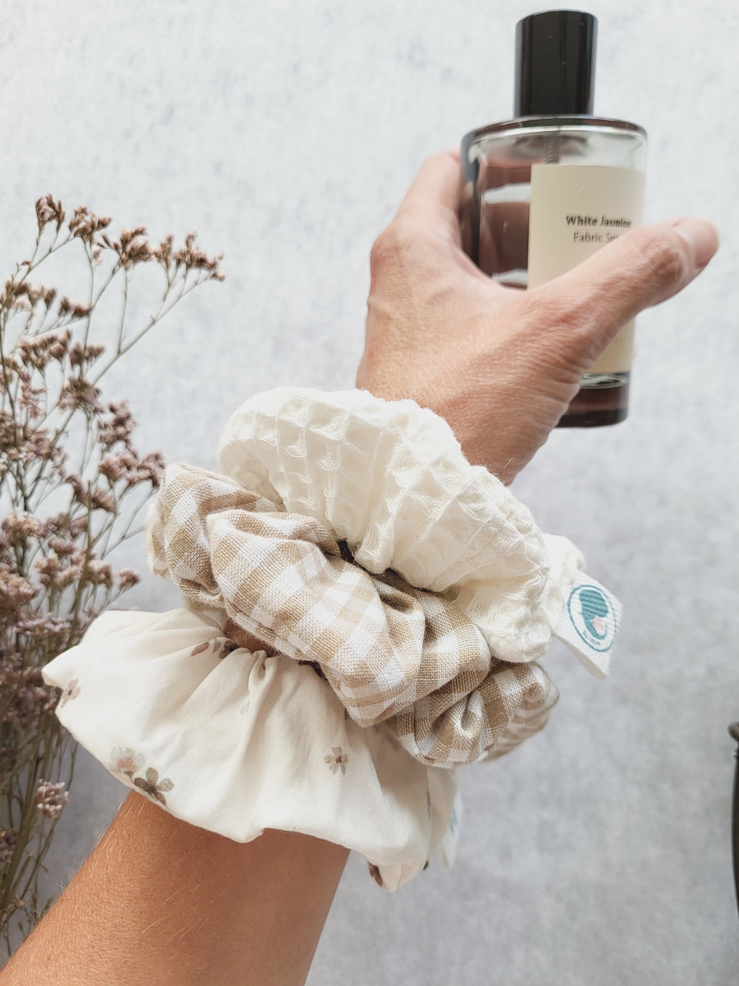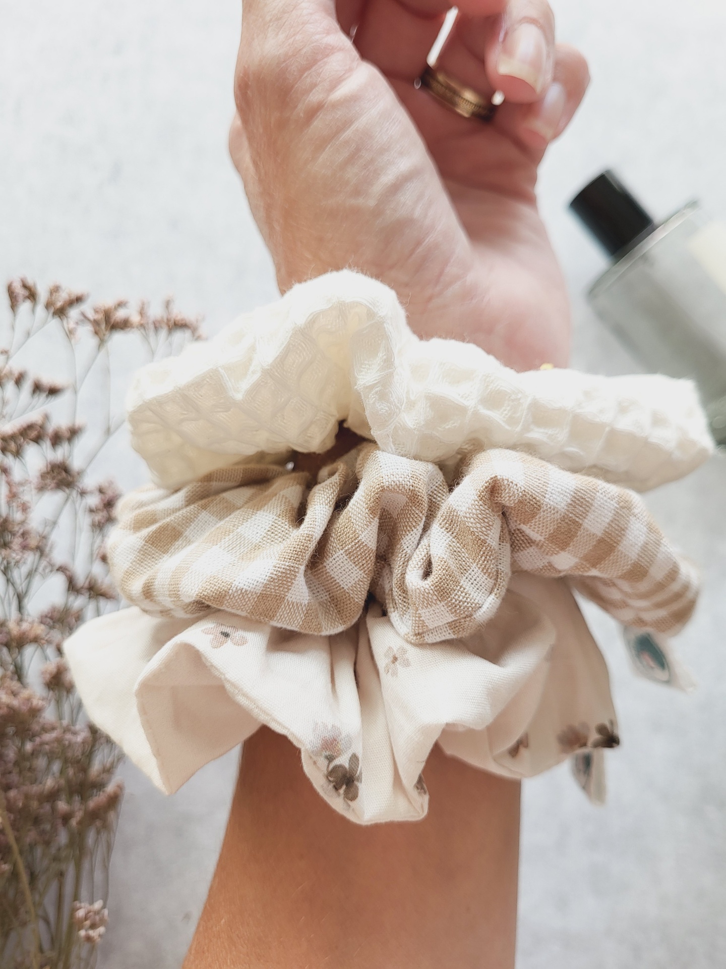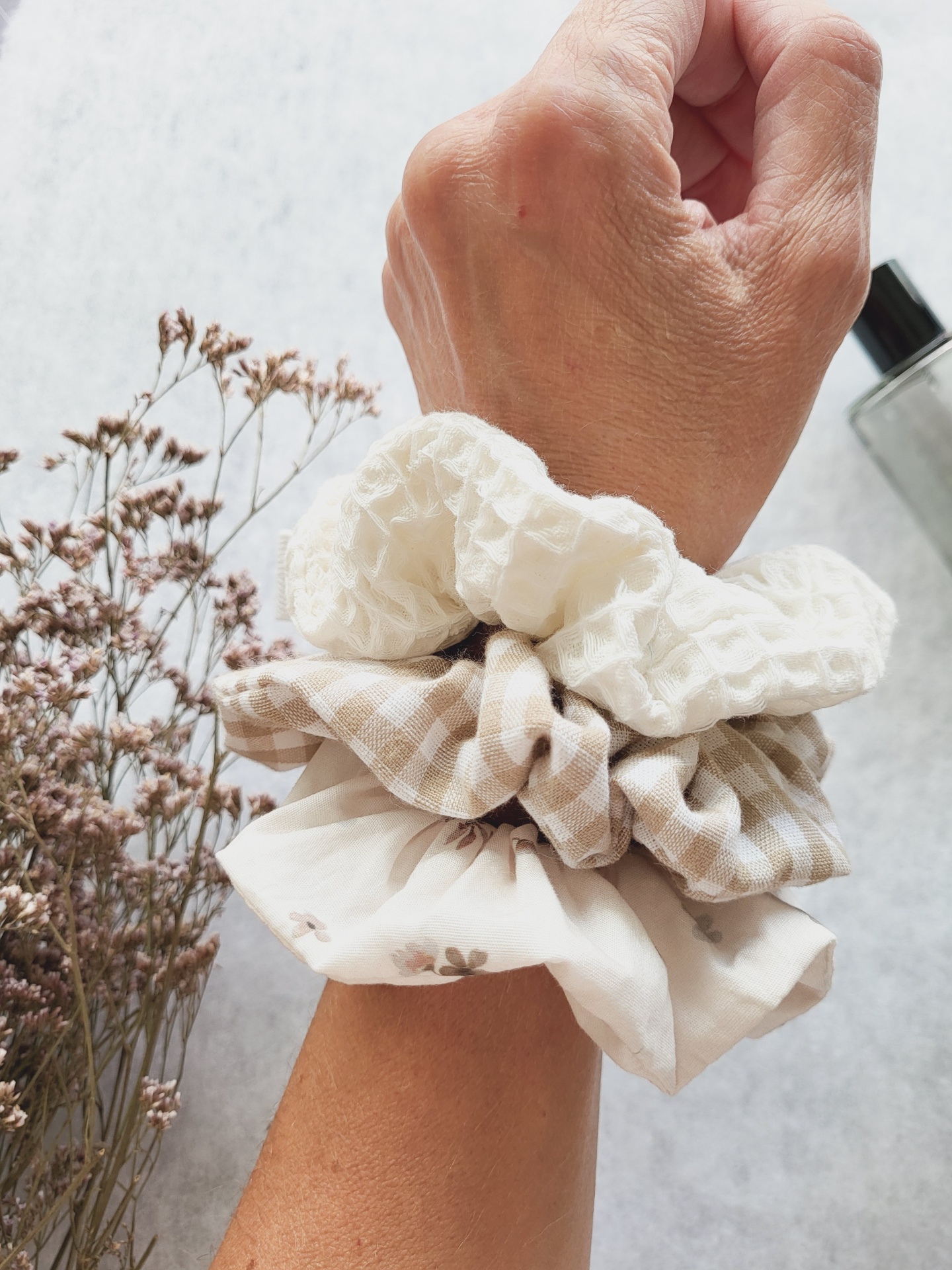 • Braço com três scrunchies têxteis em beje e branco com padrões e textura, plantas secas e frasco prateado ao fundo