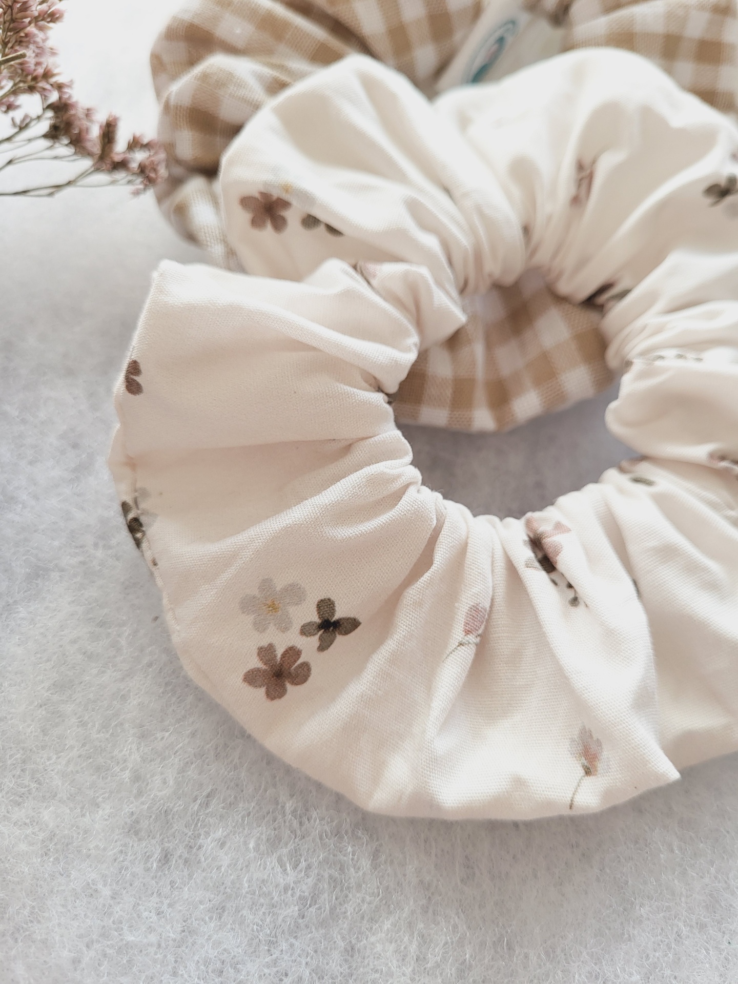 • Três scrunchies de tecido em tons neutros sobre superfície cinzenta com flores secas