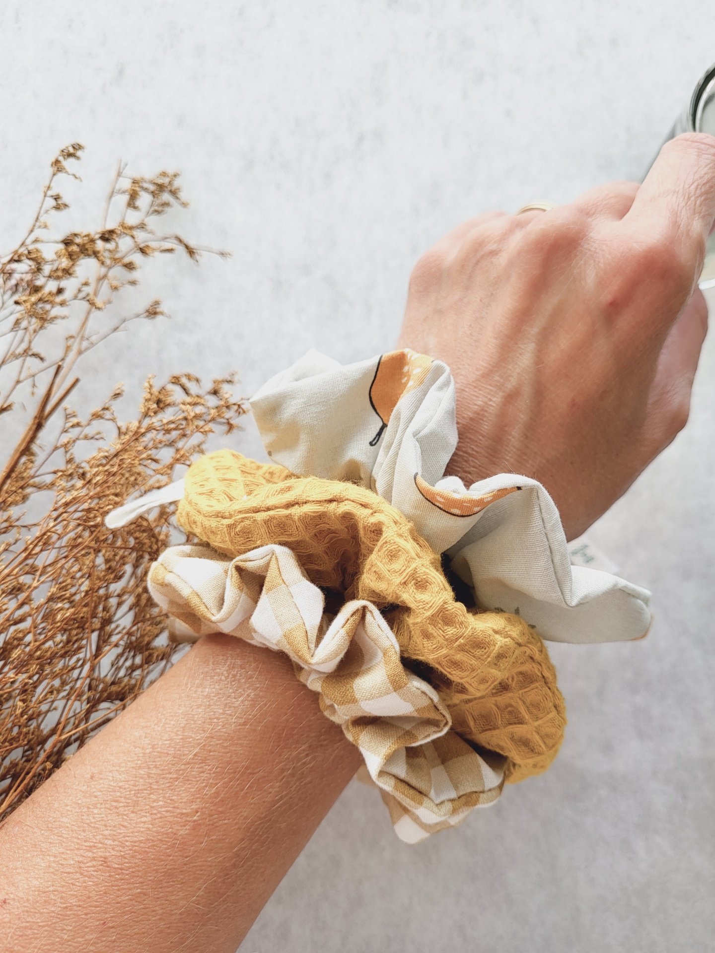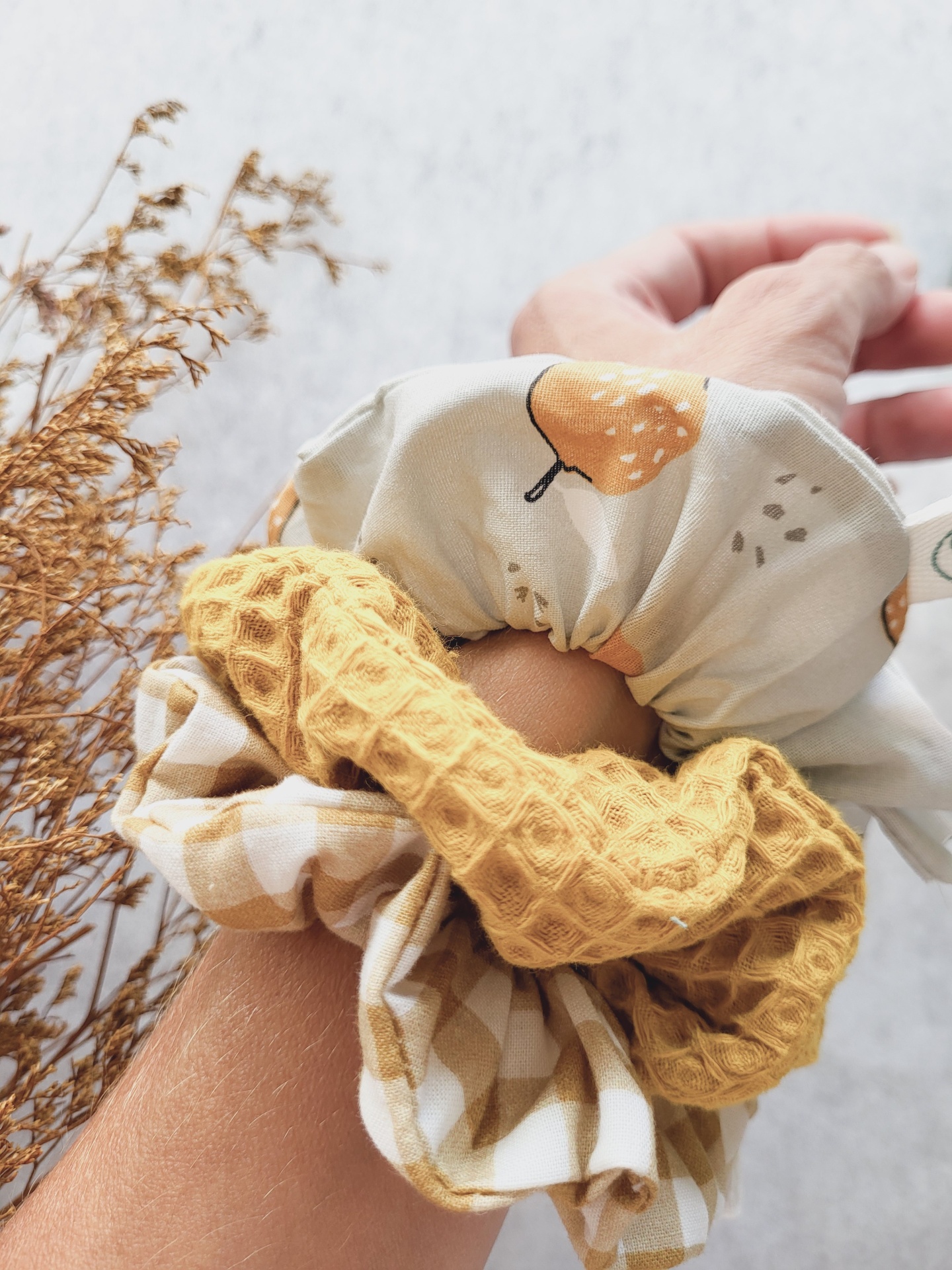 • Três scrunchies de tecido com padrões diferentes num braço, perto de plantas secas.