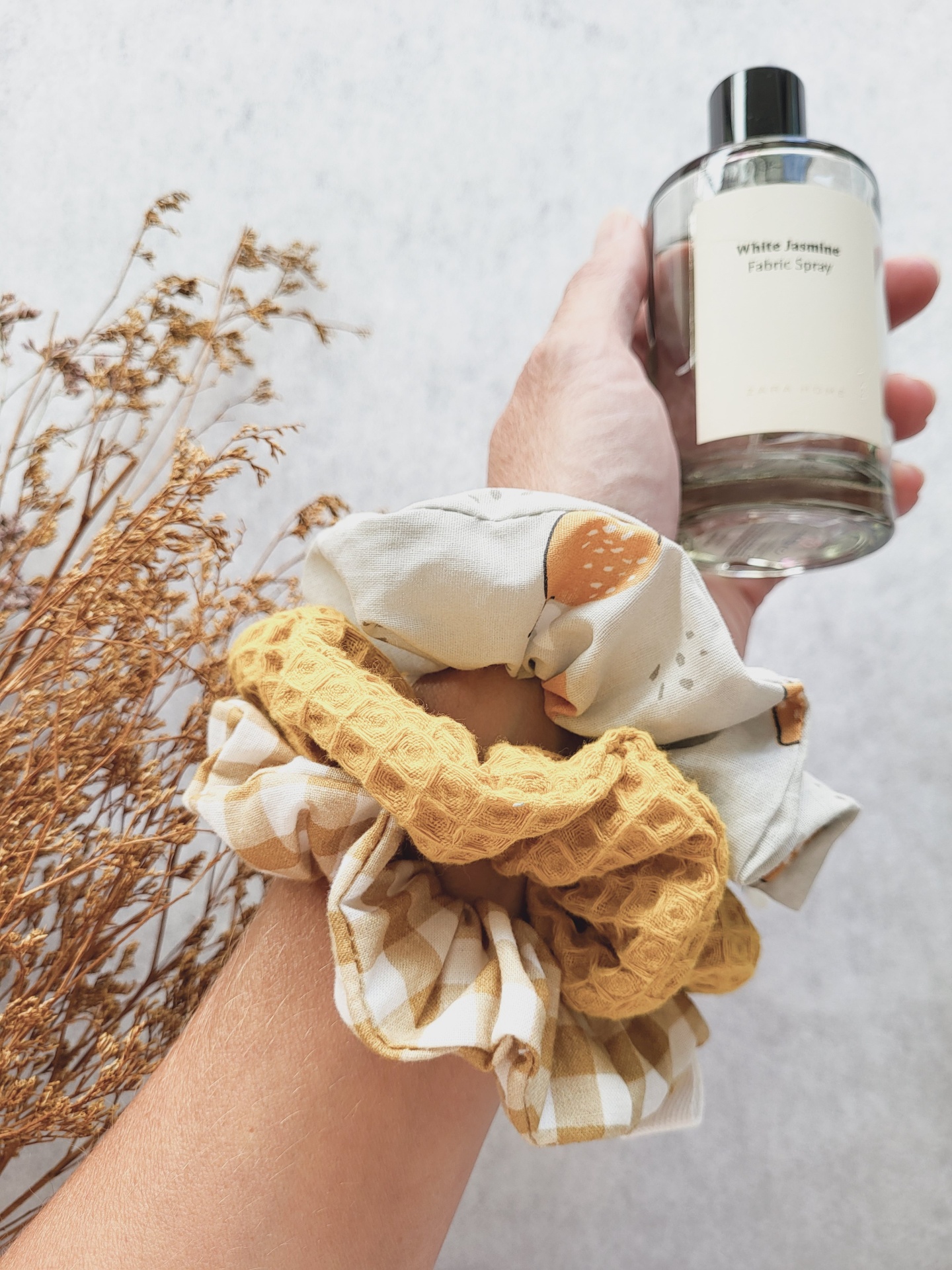 • Braço com scrunchies coloridos segurando frasco de spray para tecido com fundo de plantas secas